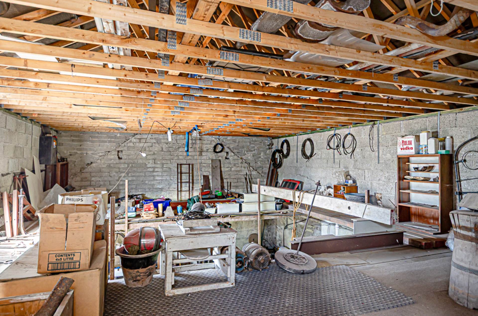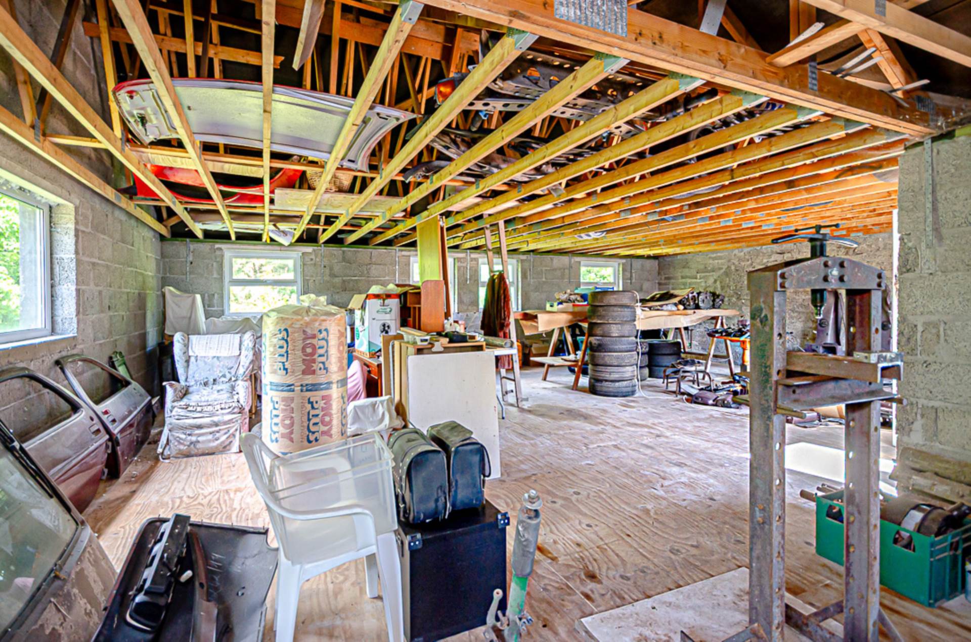 Workshop - 30'6" (9.3m) x 20'8" (6.3m)Large centrally heated upstairs workshop with insulated waterproof floor, strip lighting and electric sockets on ceiling and walls, sink area, 6 velux windows. Doorway to space above car ramp on left hand side and doorway to internal staircase case leading to exit via single storey section of building to right hand side