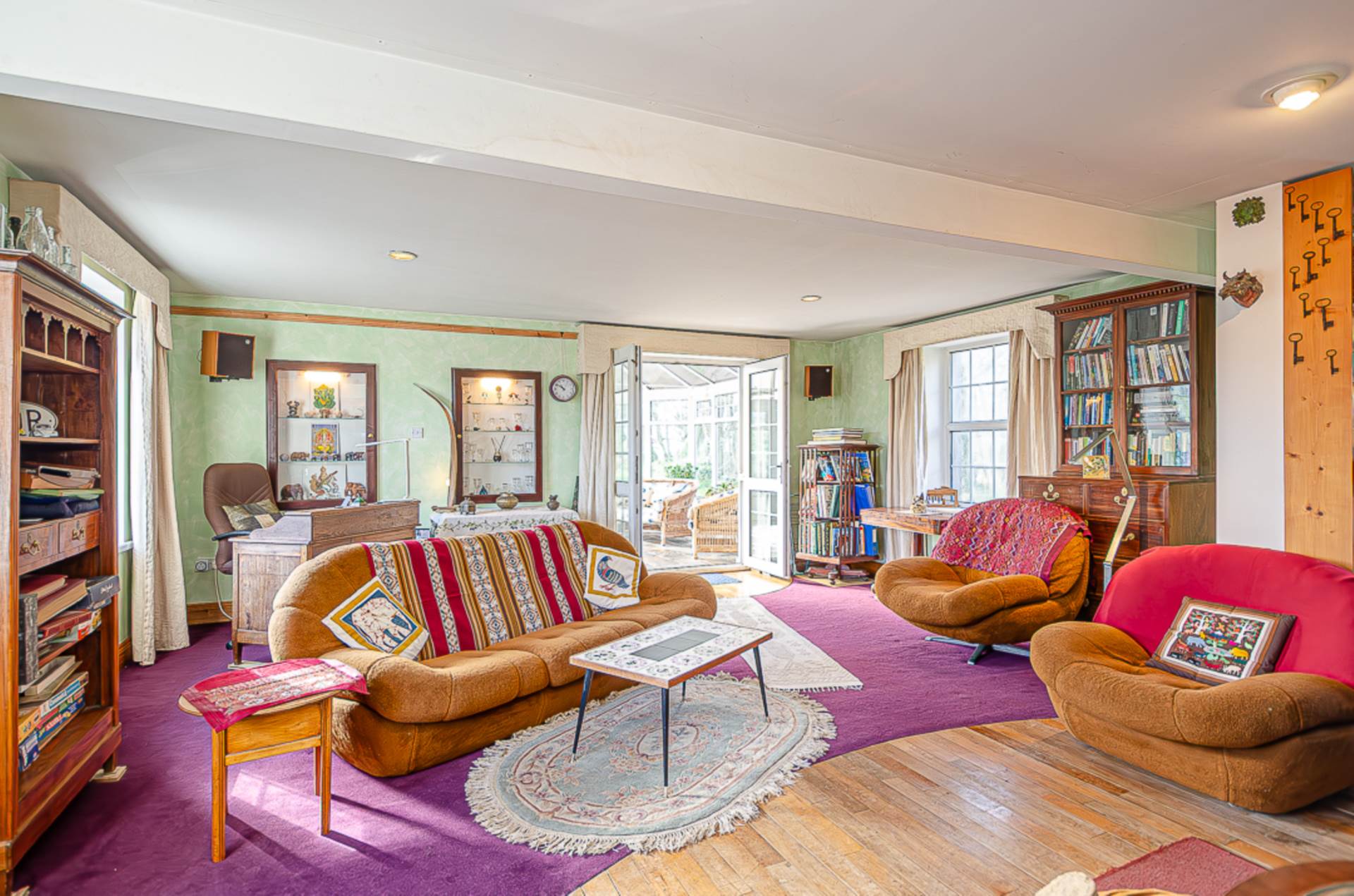 Living room with study alcove - 24'2" (7.37m) Max x 20'2" (6.15m)Reclaimed maple wood floor curved to meet plush carpeted area. Built-in glazed display cabinets with lighting. Wood burning stove in alcove with Chinese slate hearth. Study alcove with space for large desk and shelving. Windows with deep reveals built to match the original part of the house. Recessed spotlights. Double U.P.V.C. doors leading to conservatory