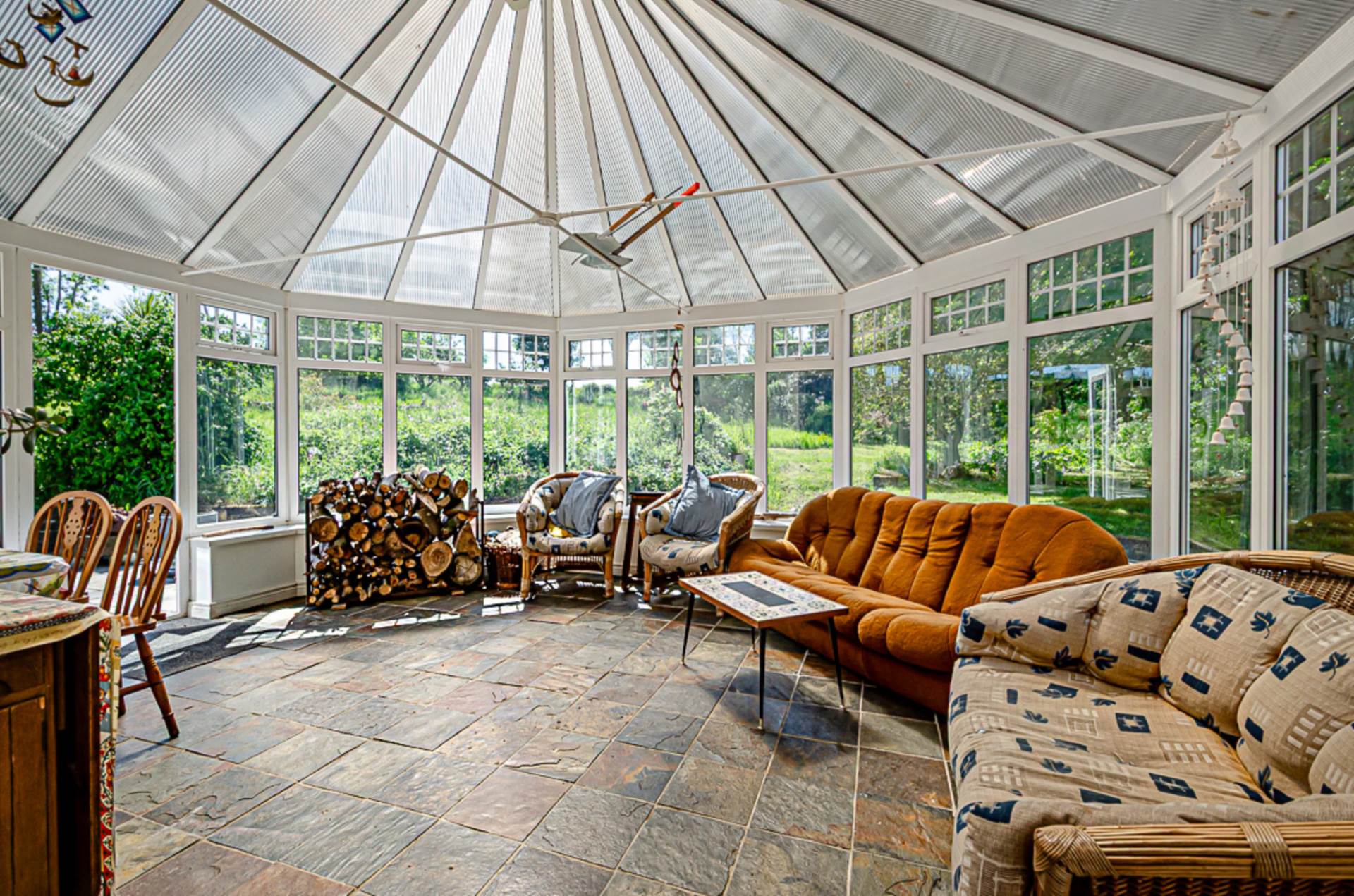 U.P.V.C. conservatory - 17'7" (5.36m) x 14'1" (4.29m)U.P.V.C. double-glazed conservatory with insulated/ heat reflective polycarbonate roof. Chinese slate floor and U.P.V.C. framed door leading to garden patio area