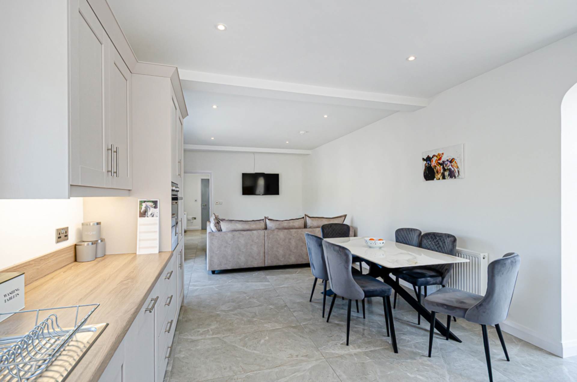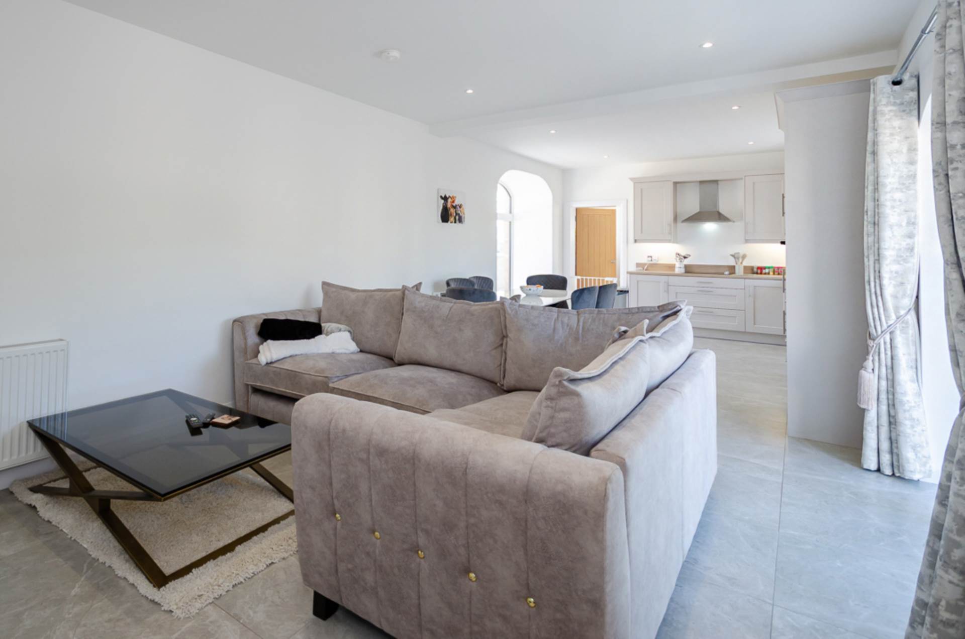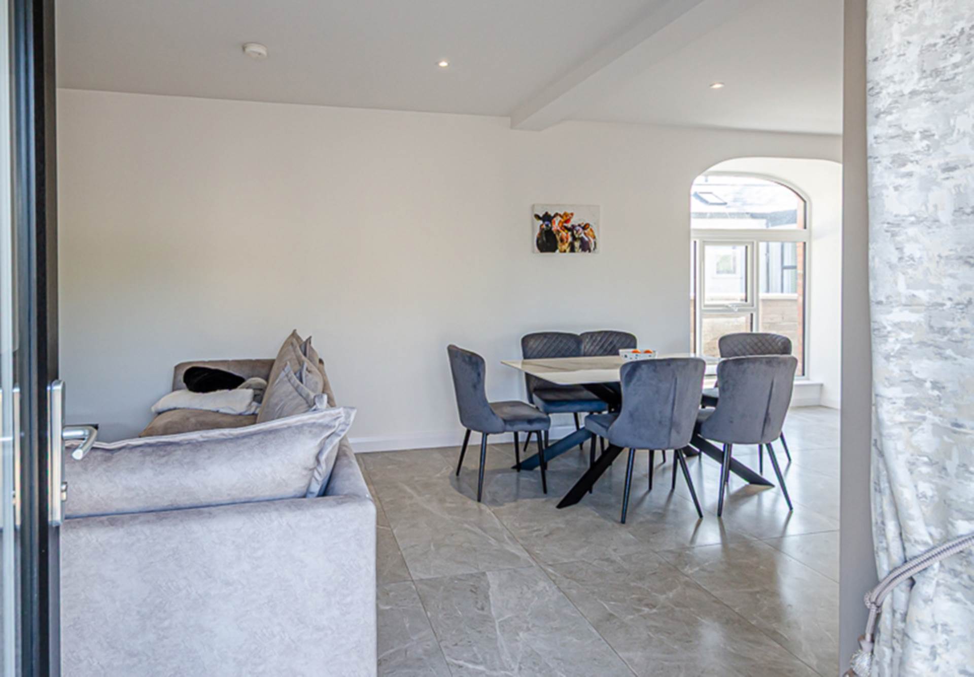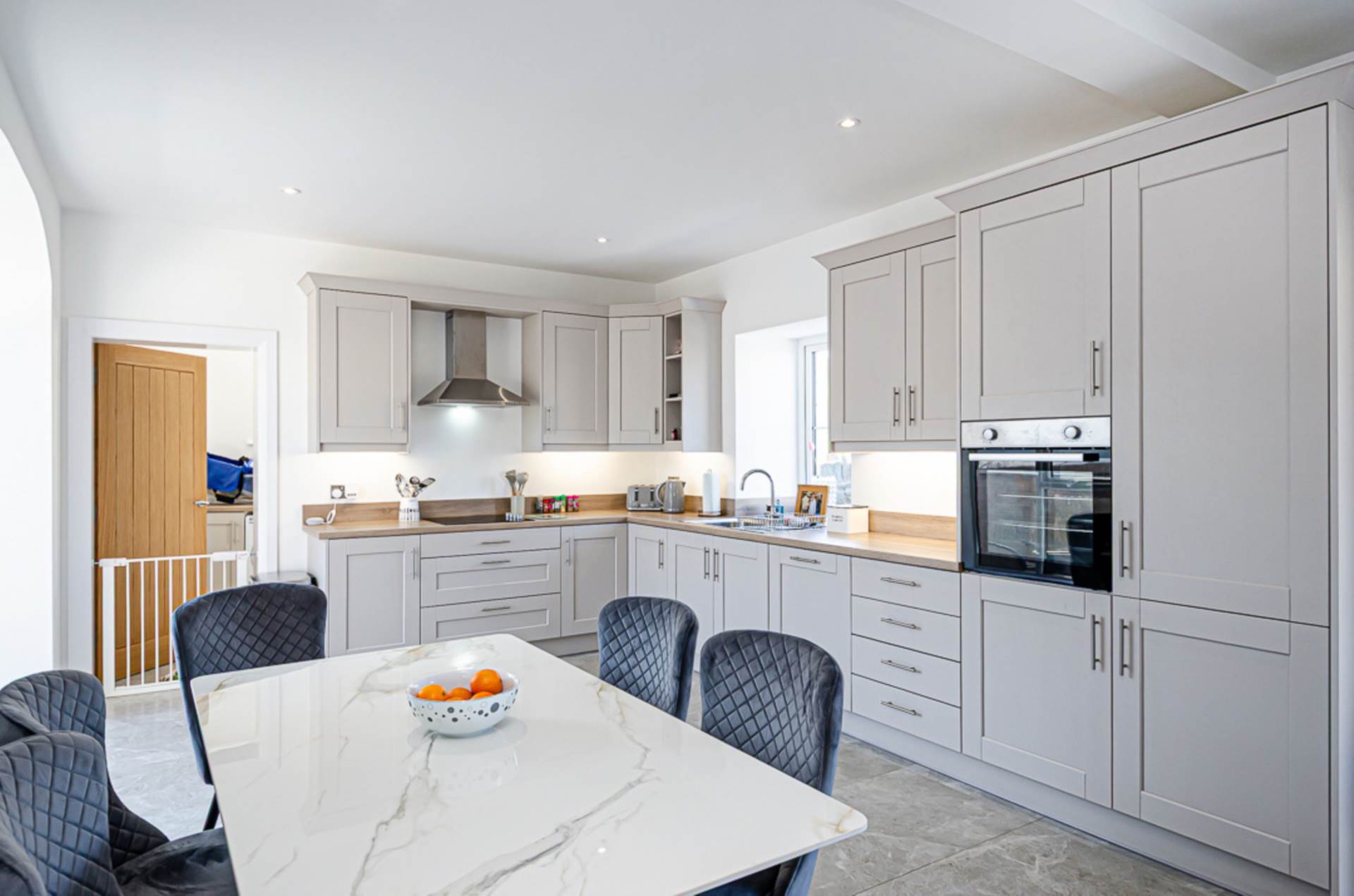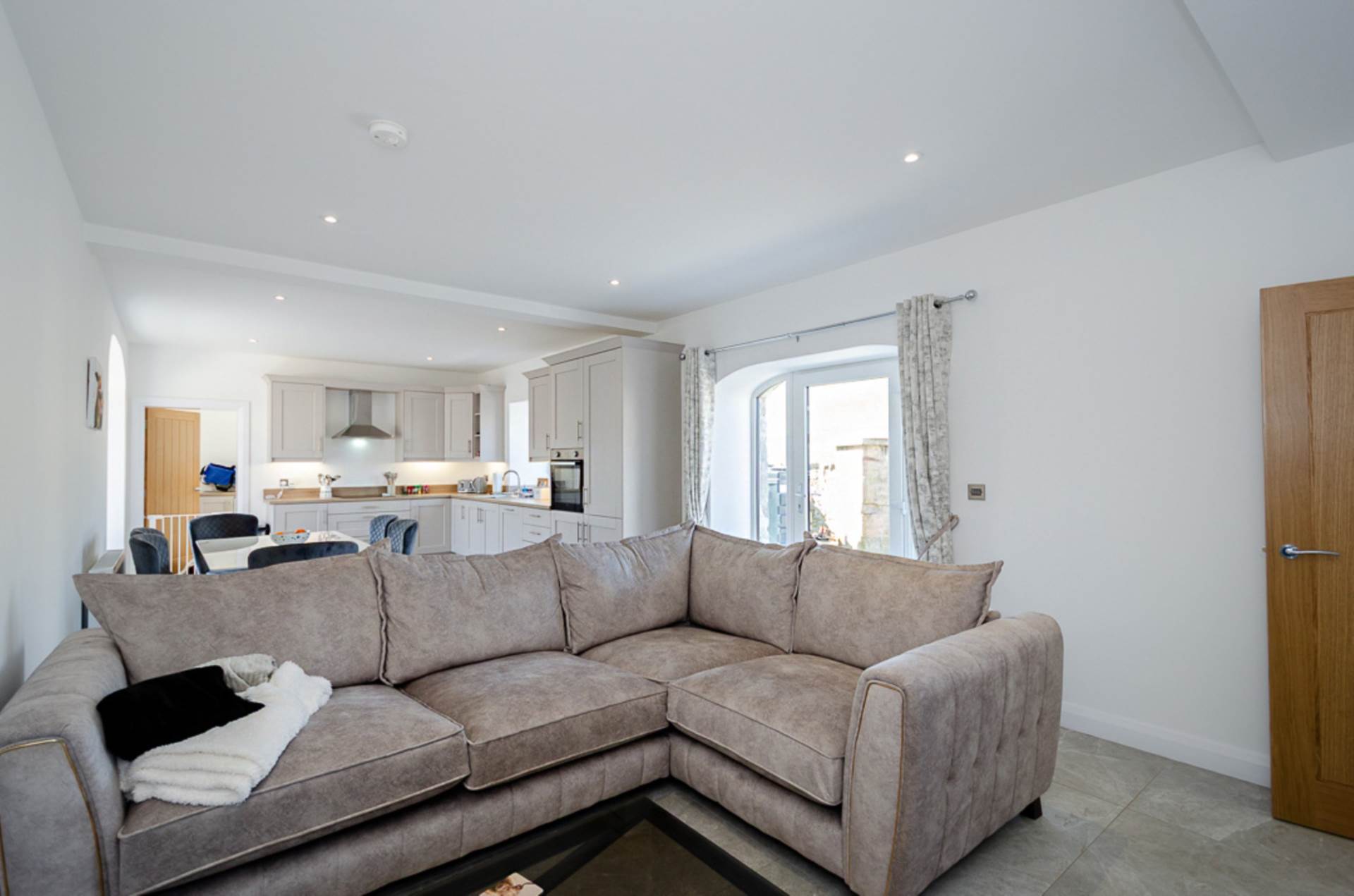 The property comprises open plan living room and newly fitted luxury kitchen with appliances, utility room, downstairs W.C., three bedrooms including main bedroom with en suite shower room, and main shower room. The finish is exceptional with black U.P.V.C. framed double glazing and oil fired central heating.