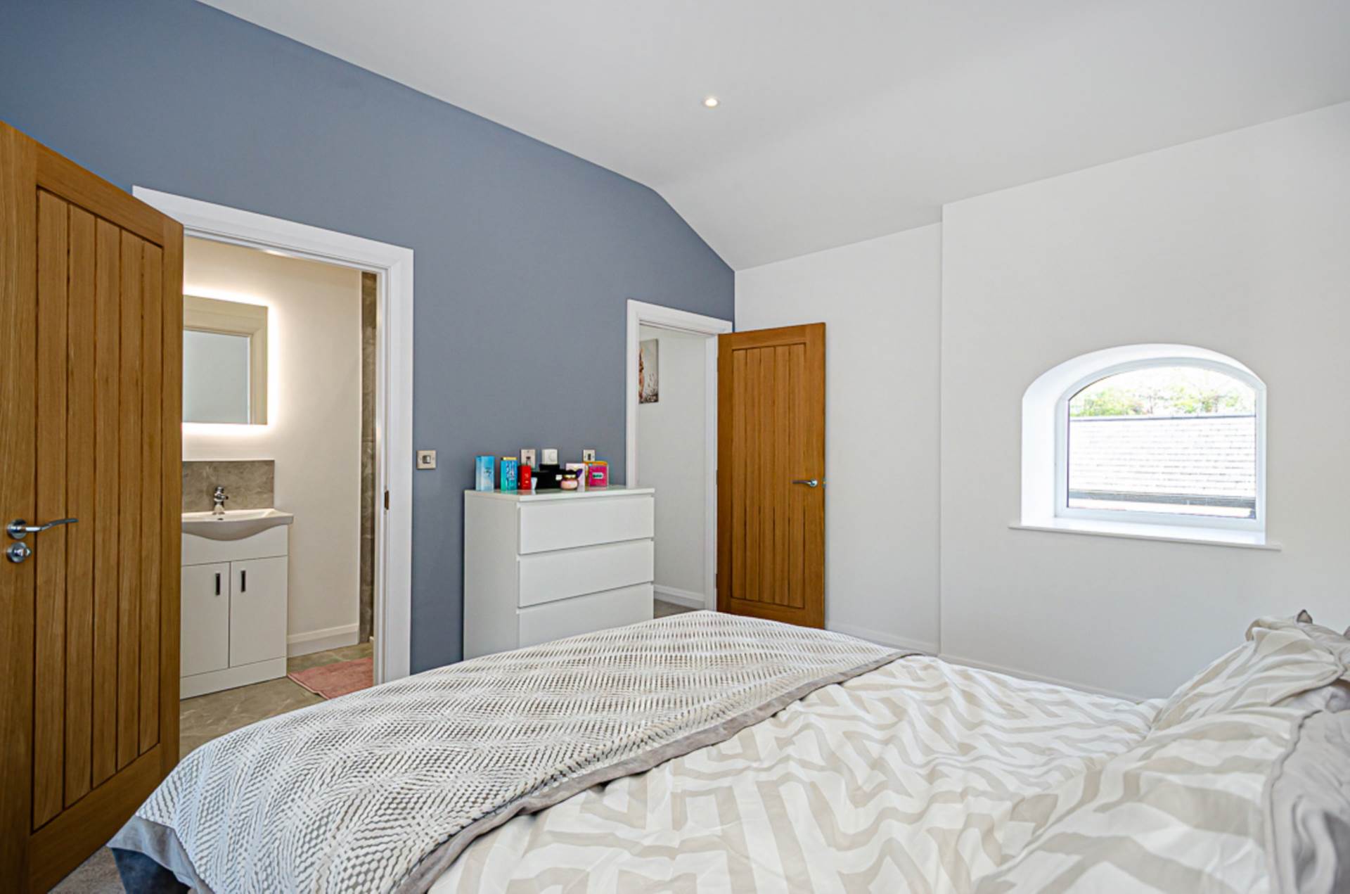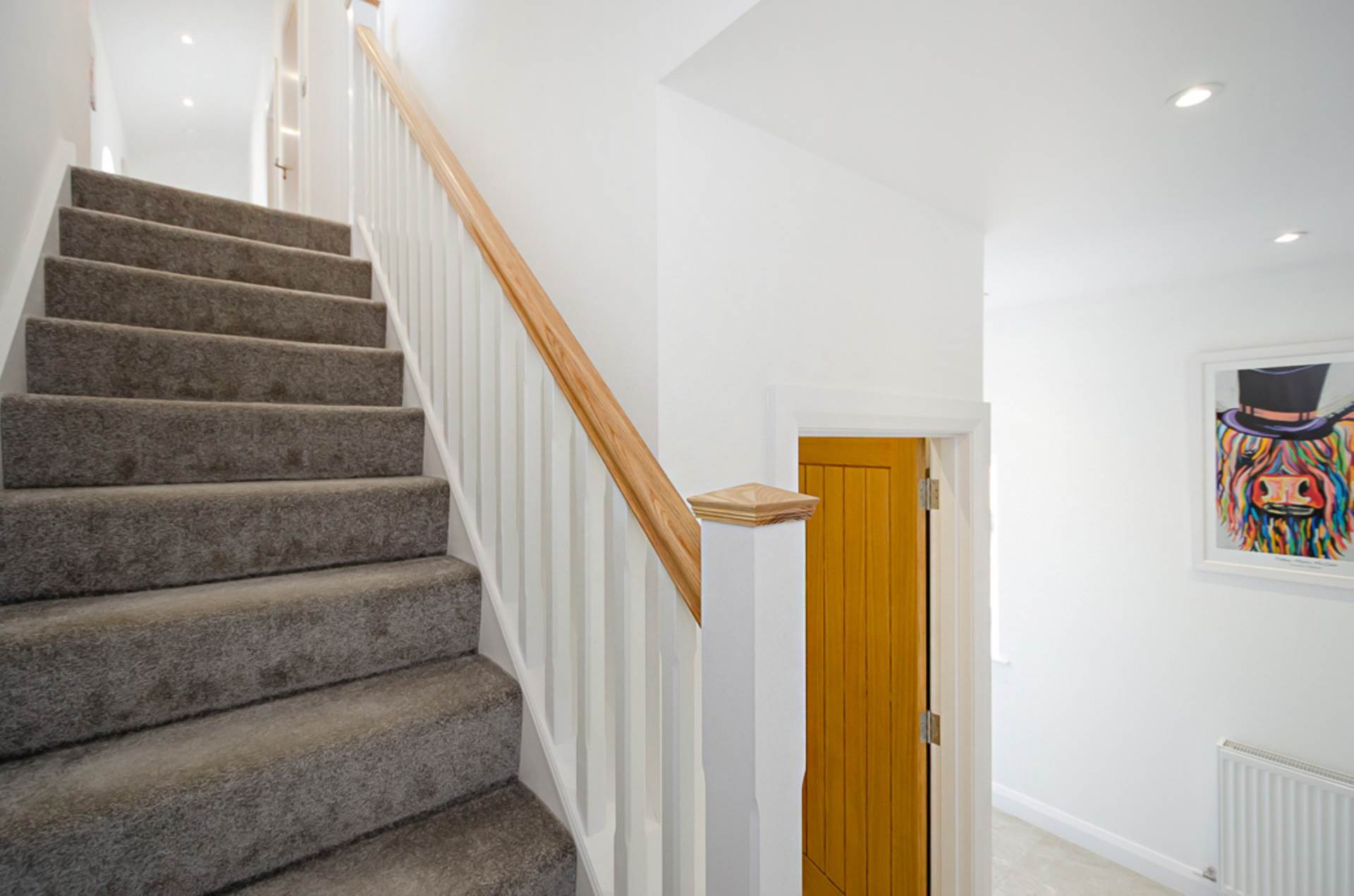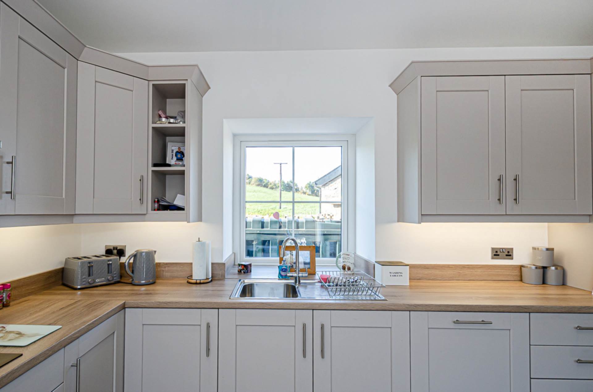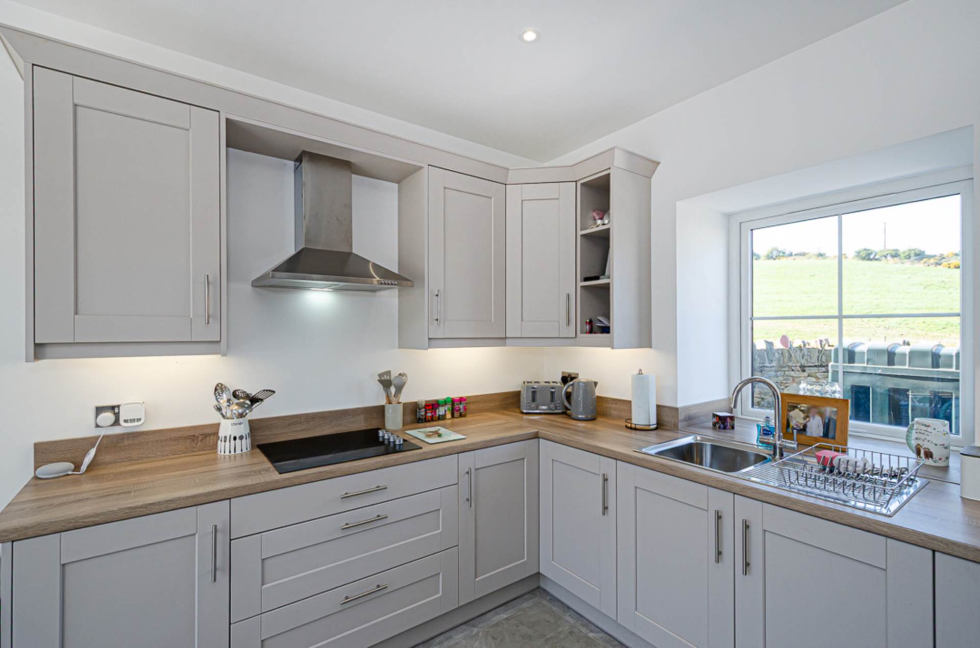 The property comprises open plan living room and newly fitted luxury kitchen with appliances, utility room, downstairs W.C., three bedrooms including main bedroom with en suite shower room, and main shower room. The finish is exceptional with black U.P.V.C. framed double glazing and oil fired central heating.
