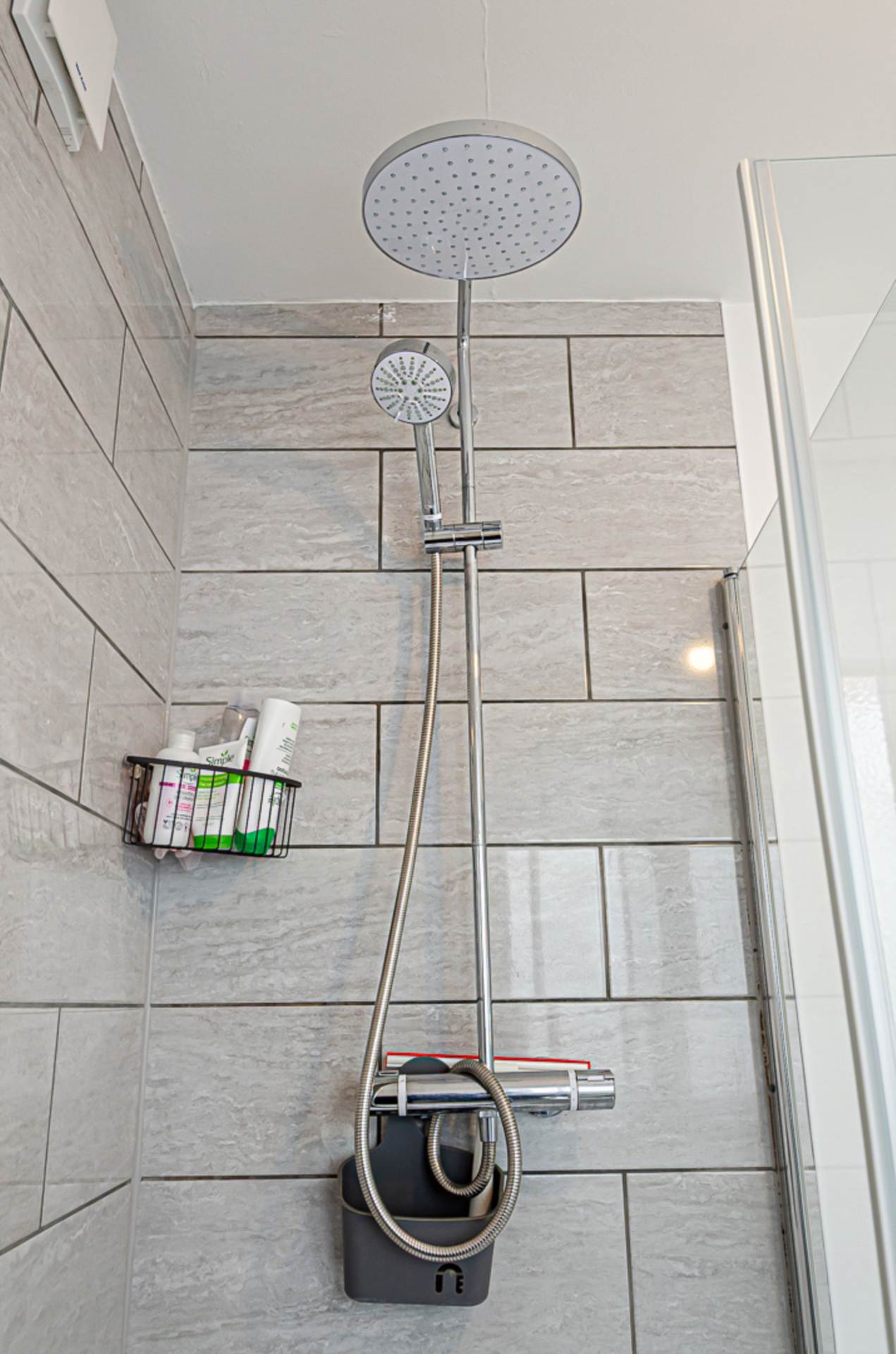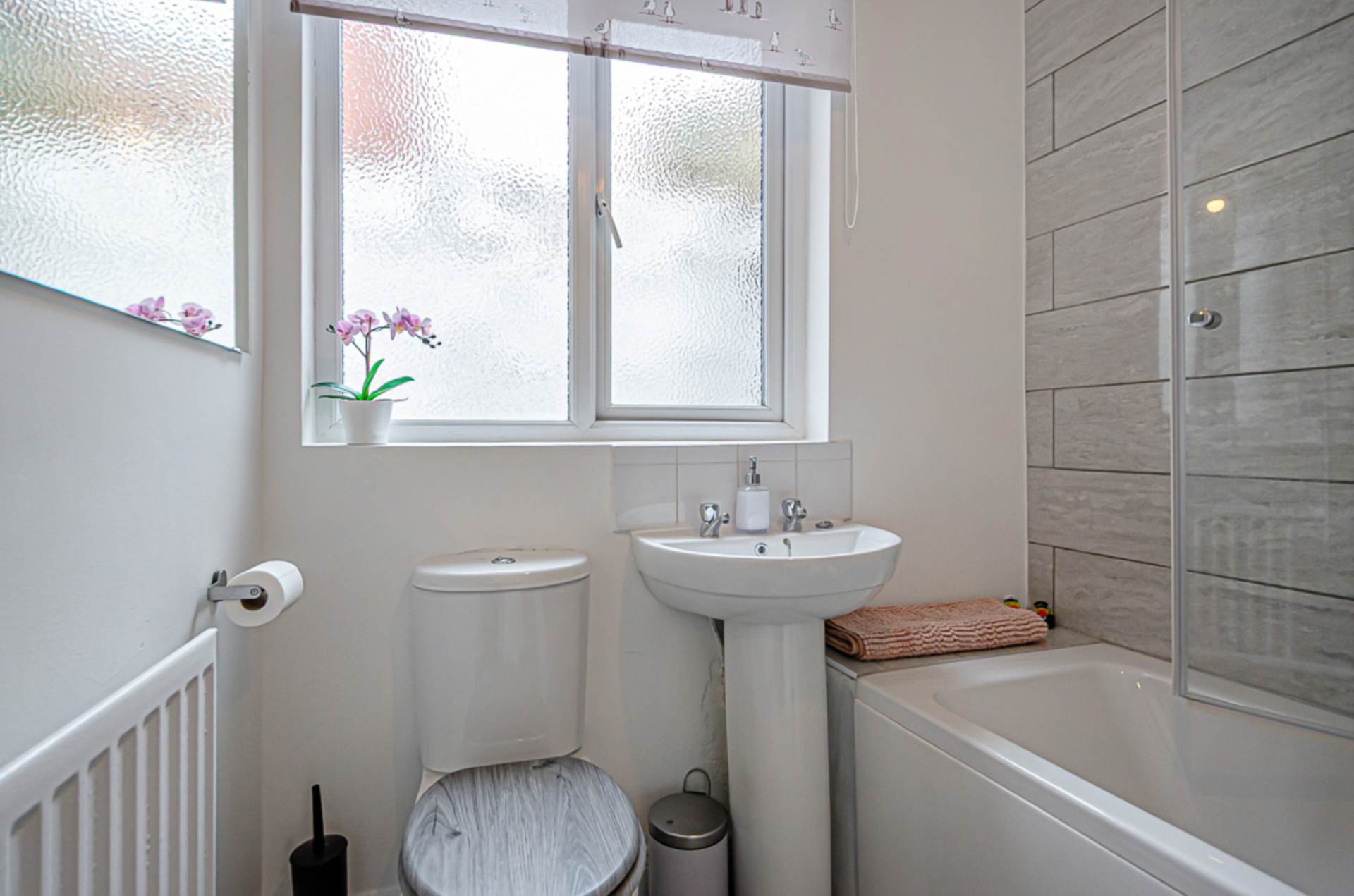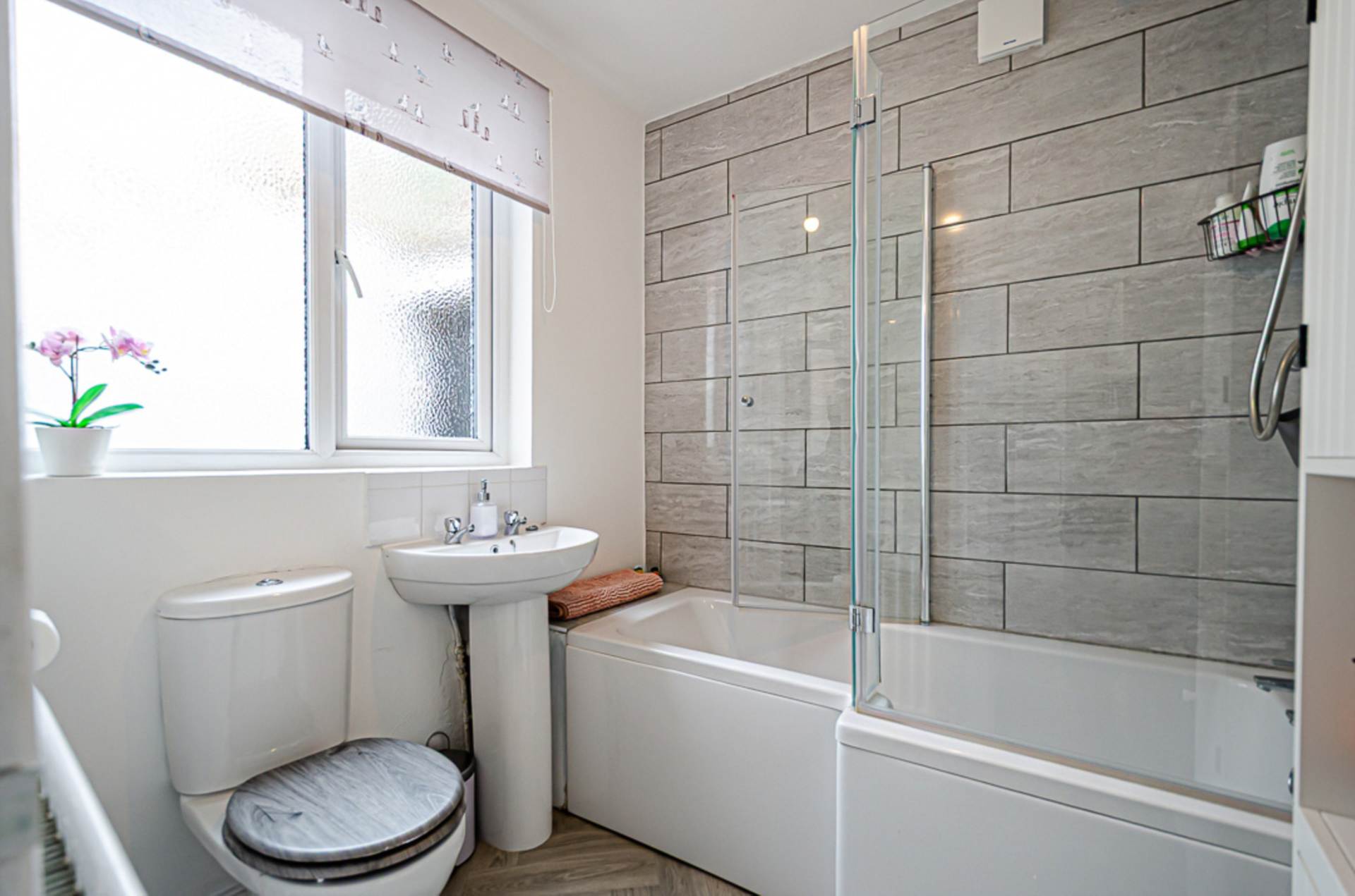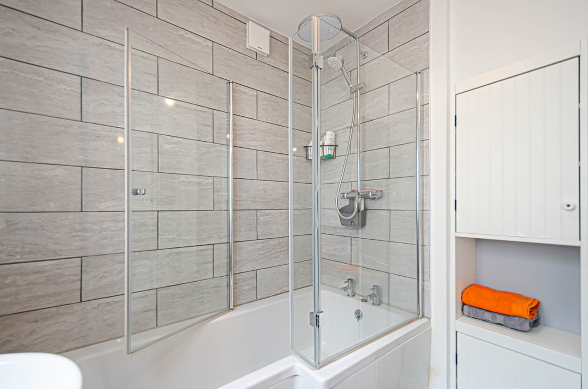 Modern white suite. B-shaped bath with thermostatic shower with rainfall head and adjustable head, and screen over bath, wash hand basin, W.C., part tiled walls and extractor fan