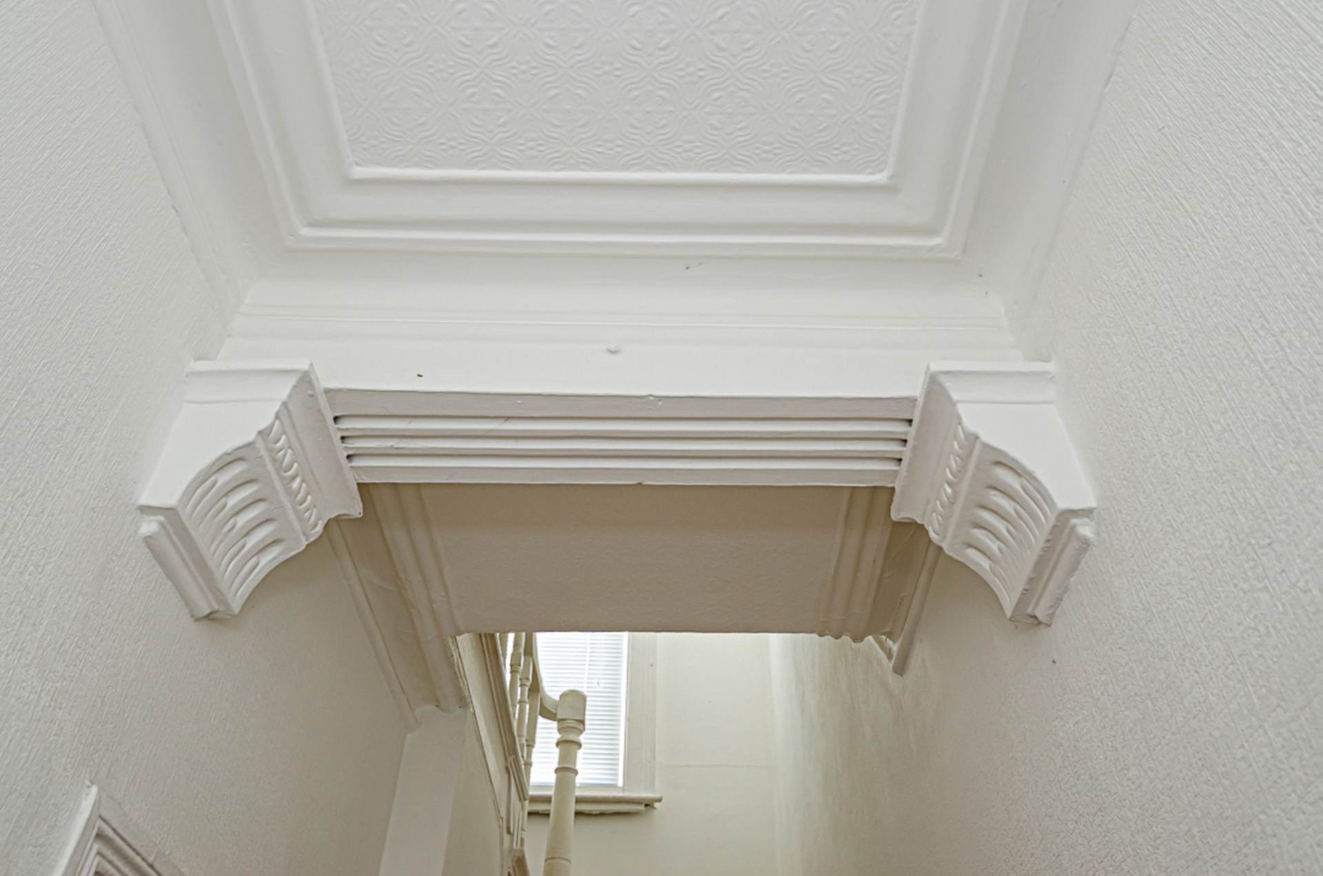 Cast iron fireplace with tiled hearth, cornice, hole in the wall fireplace, storage under stairs and timber laminate floor