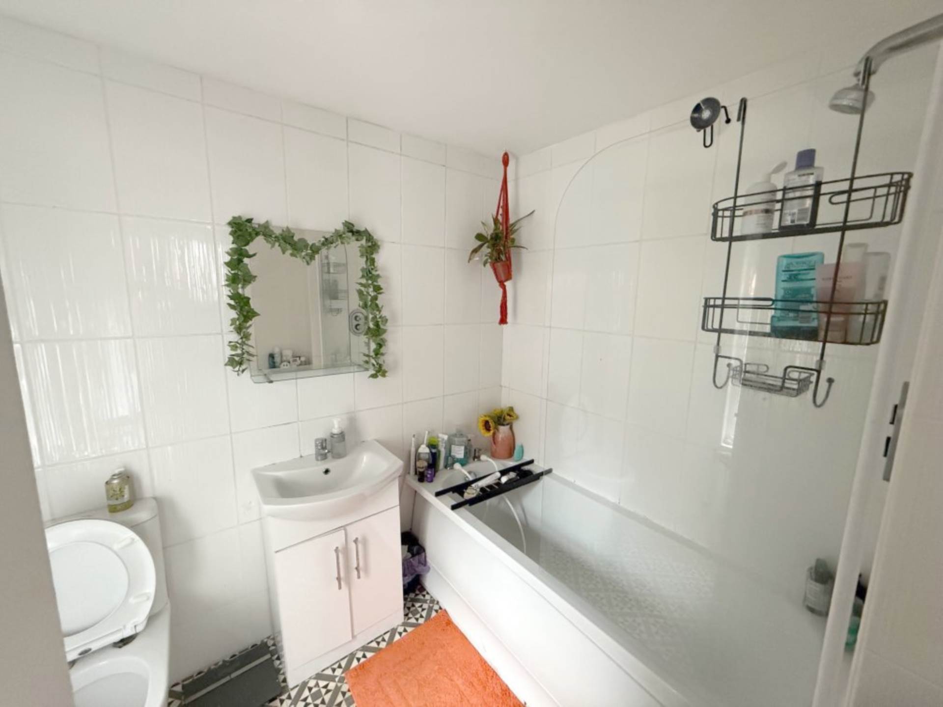 White suite with thermostatic shower and screen over bath, wash hand basin in vanity, W.C., tiled walls