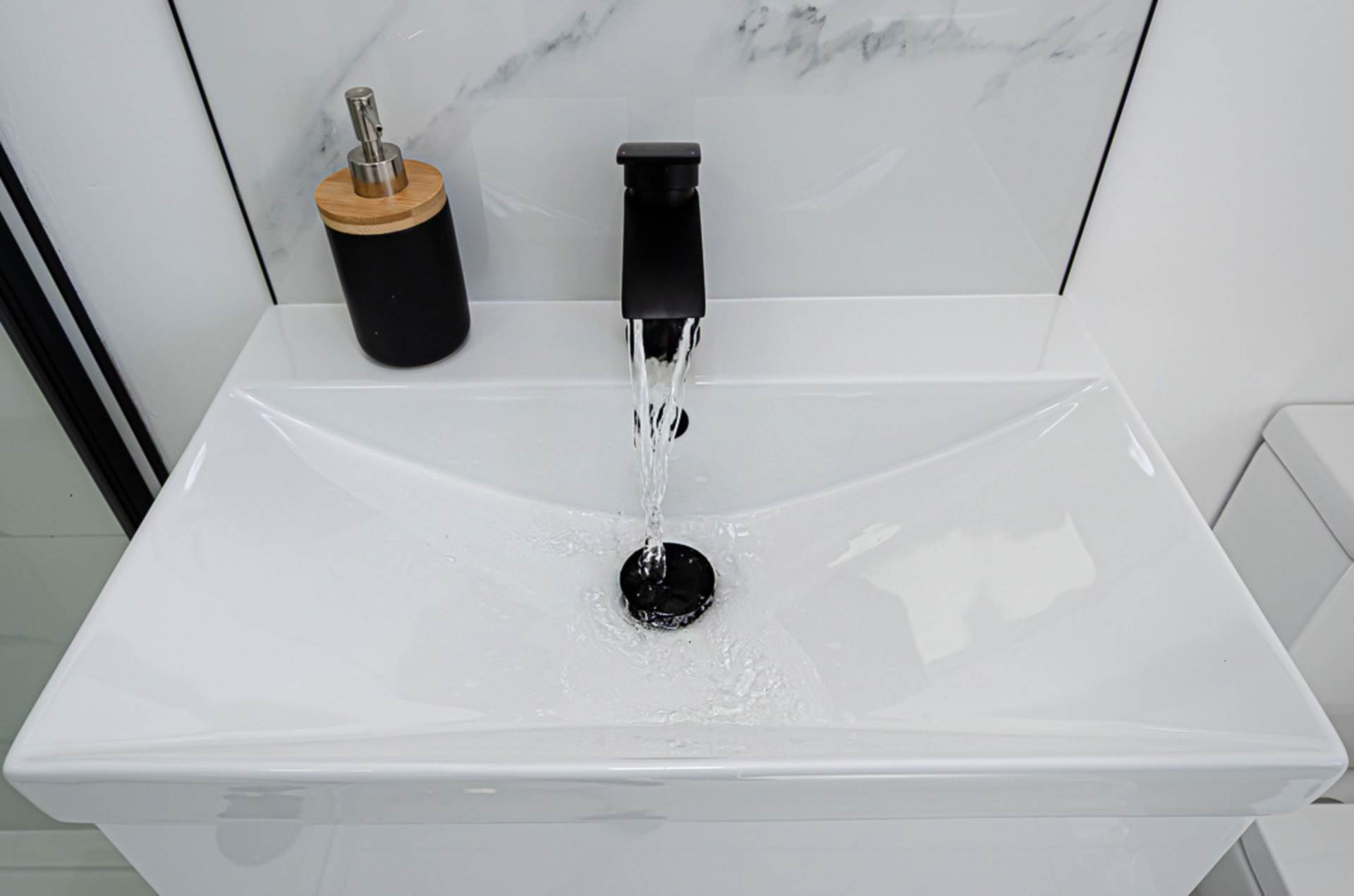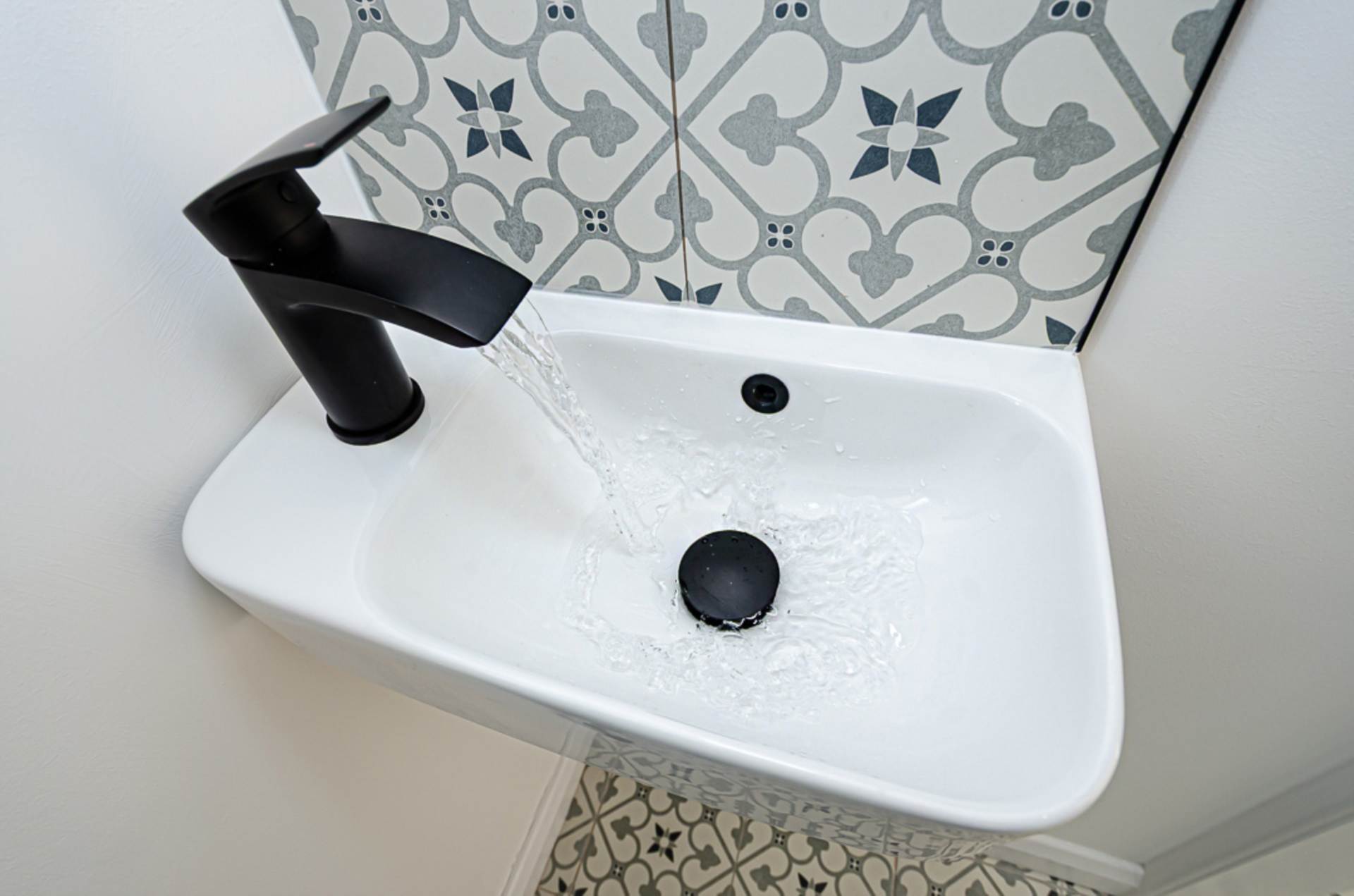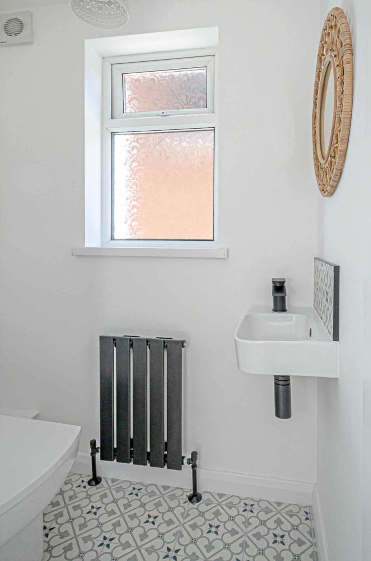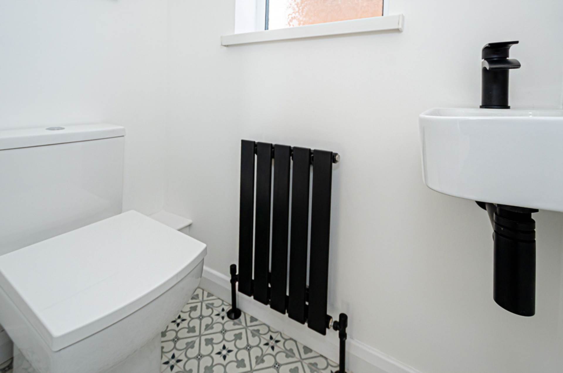 Wall hung sink with black fittings, W.C., black panel radiator, decorative ceramic tiled floor and extractor fan