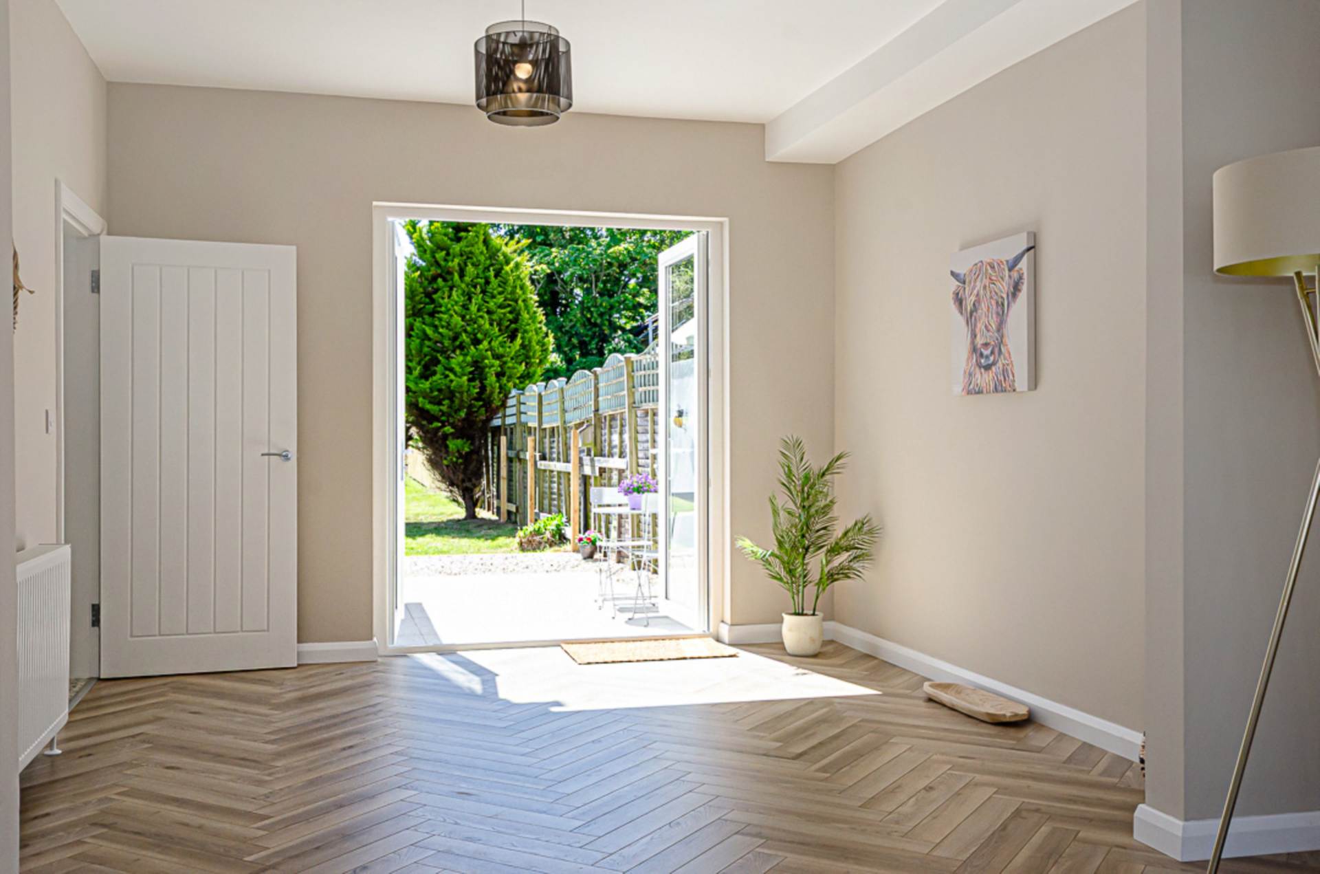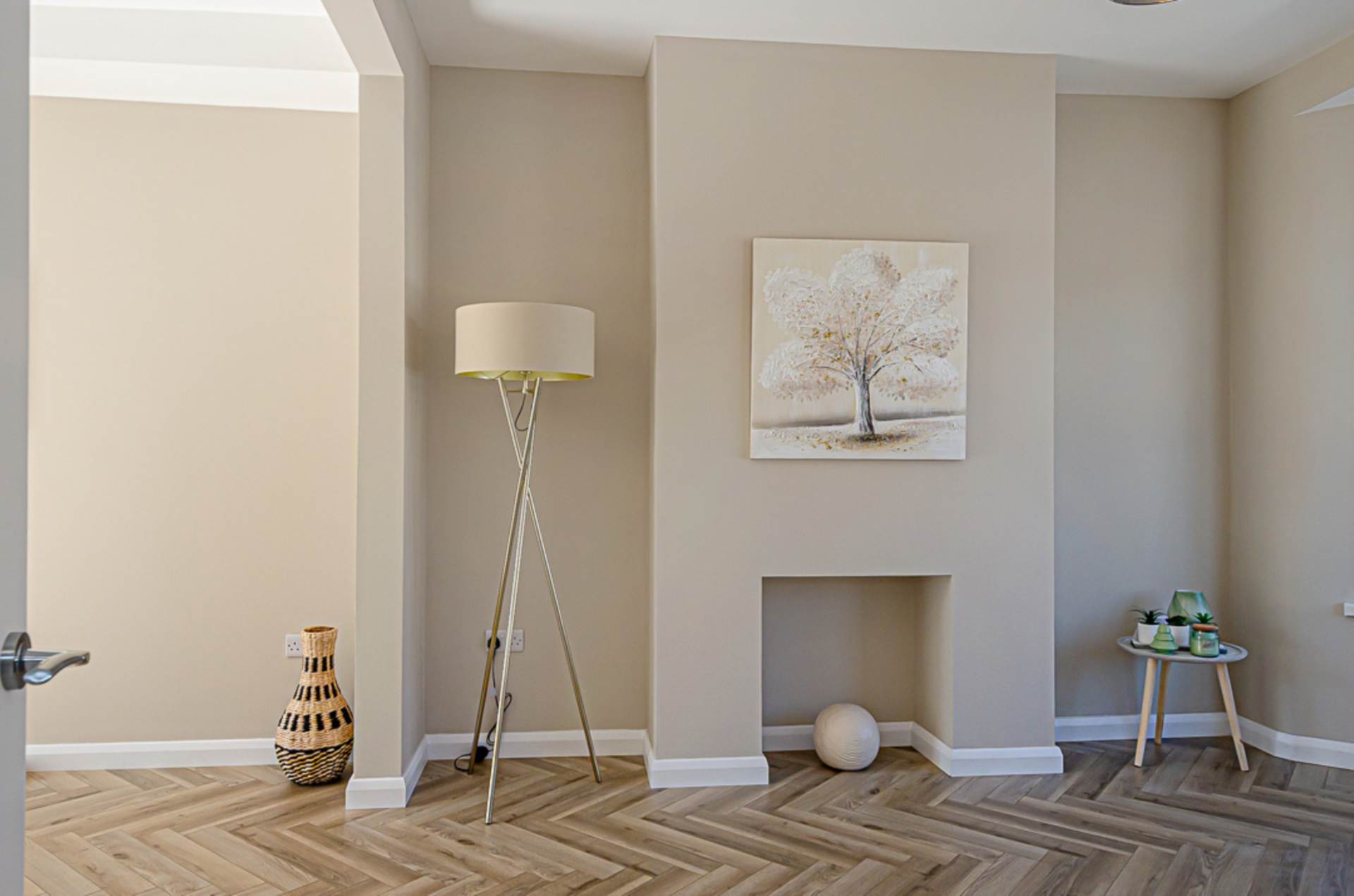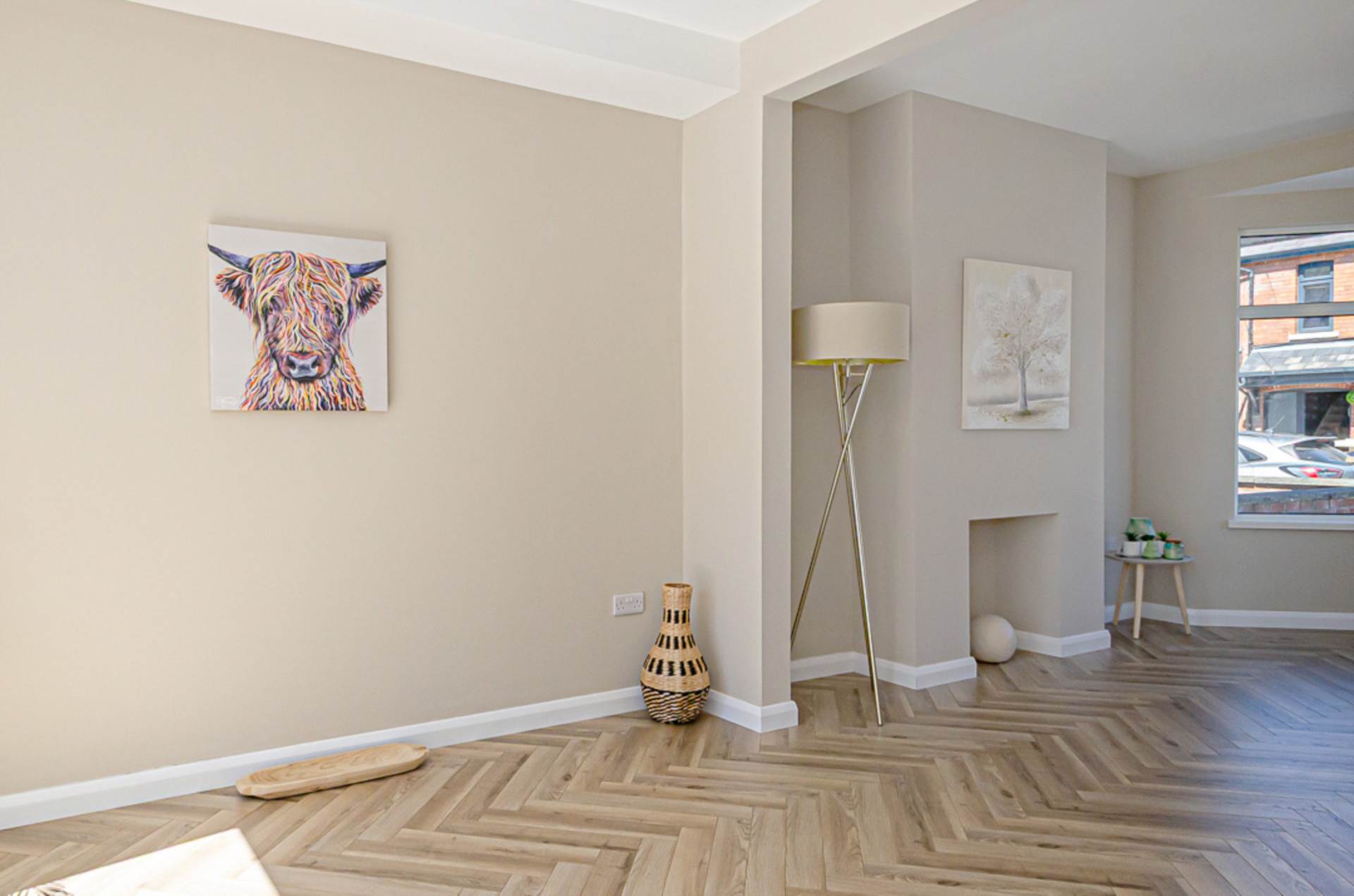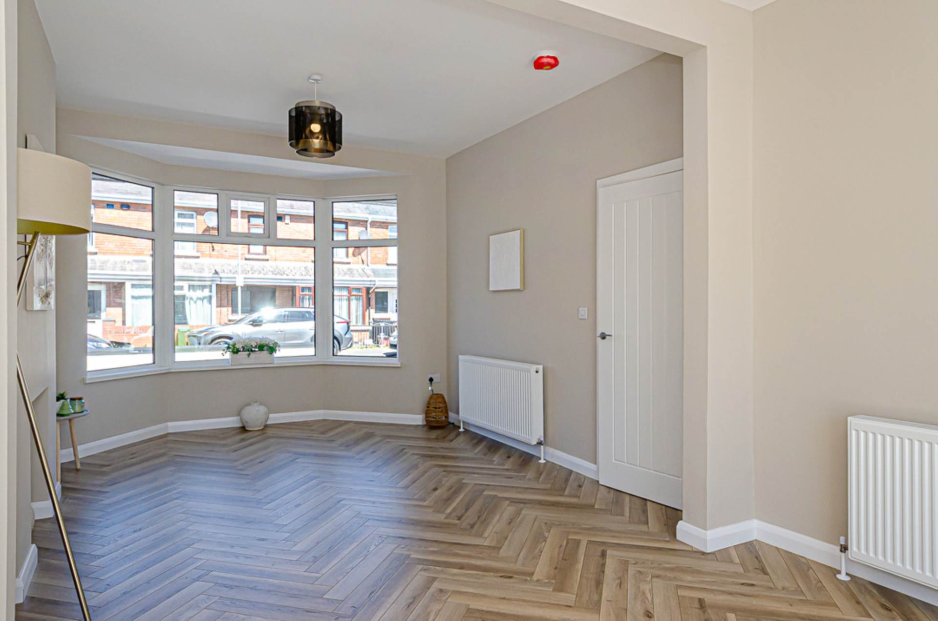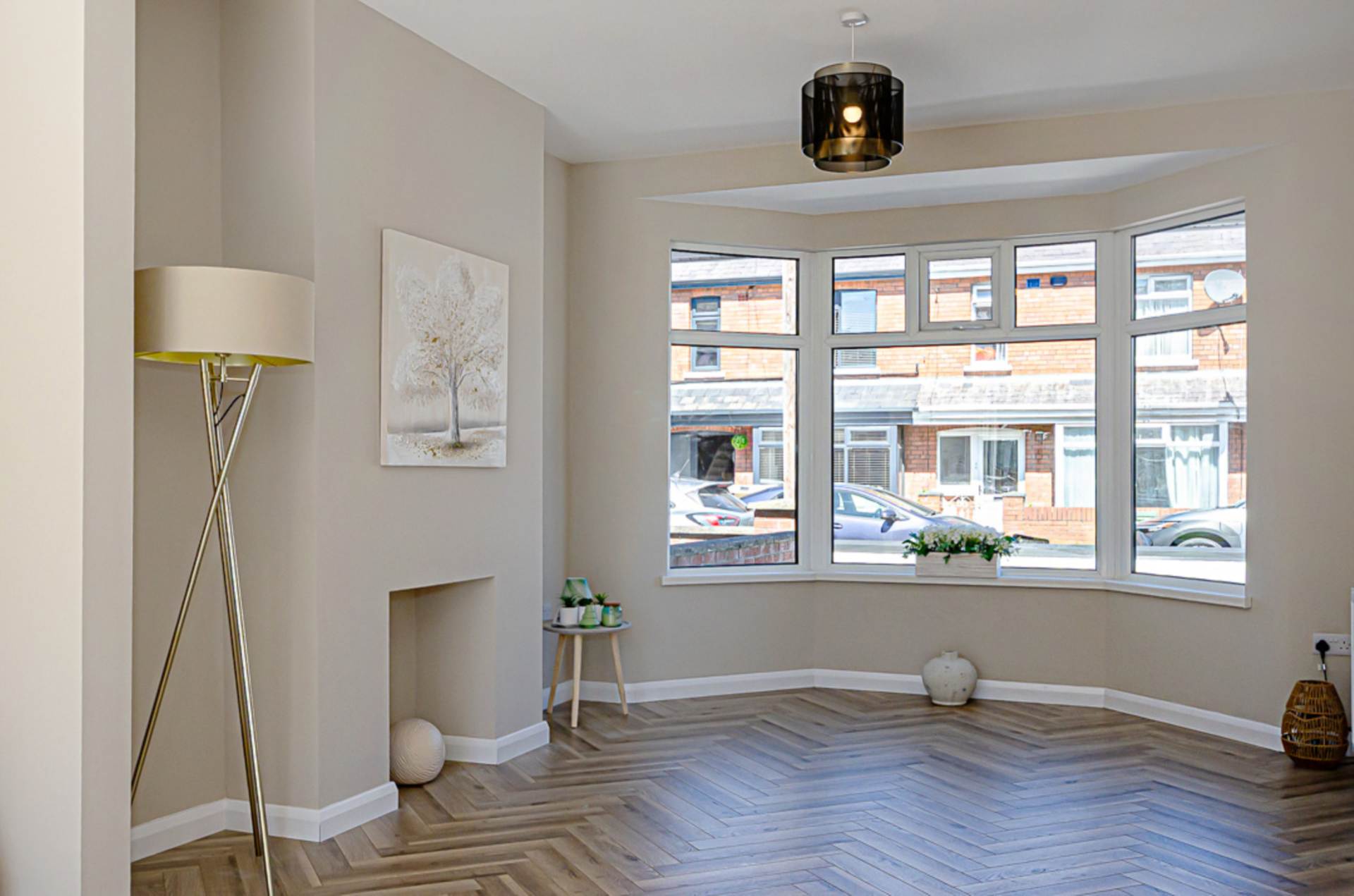 Bay window, decorative hole in the wall fireplace, herringbone timber laminate floor and French doors to garden