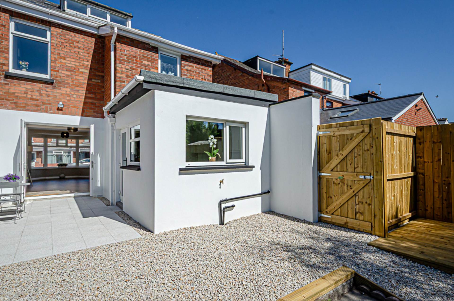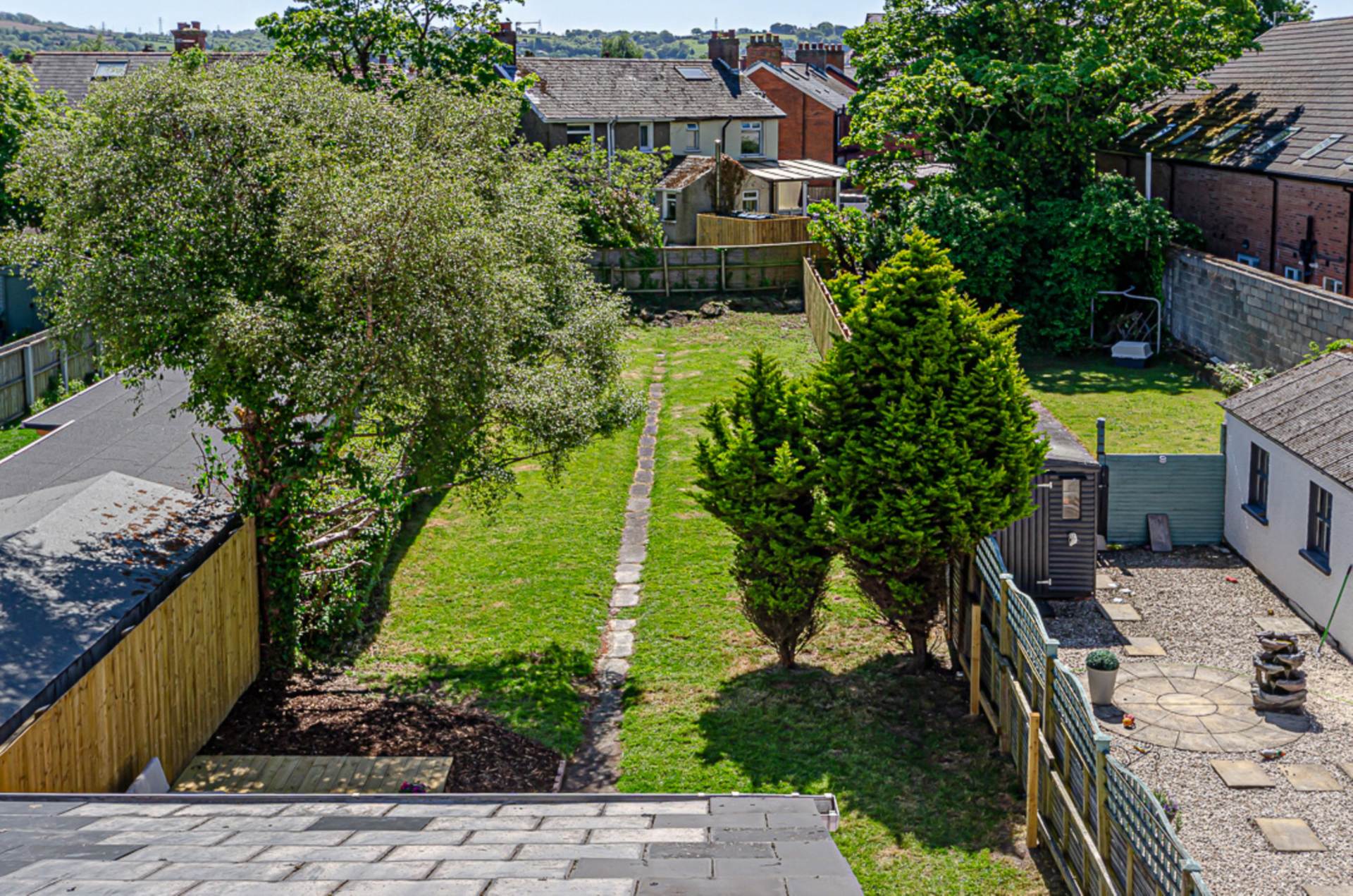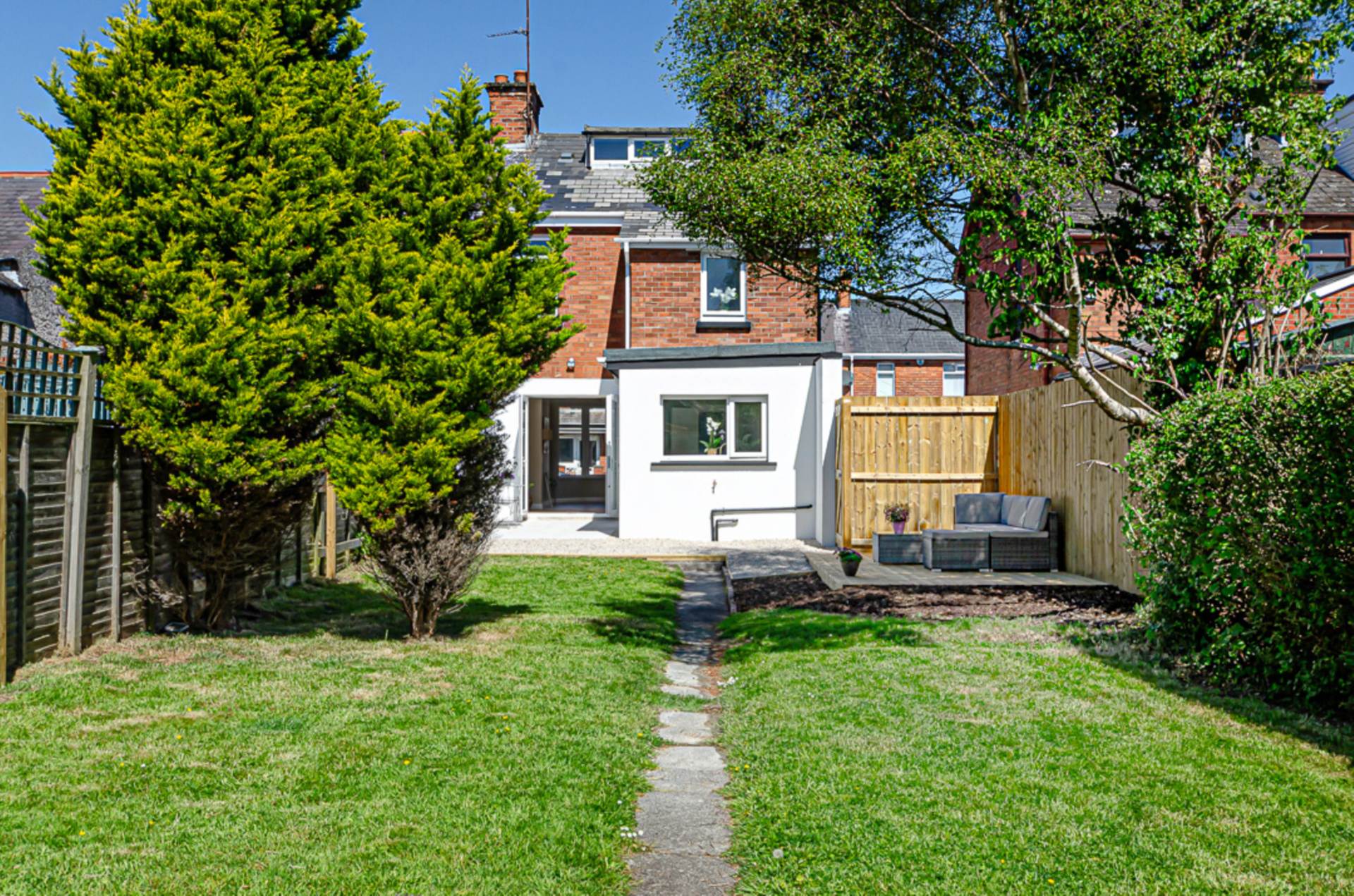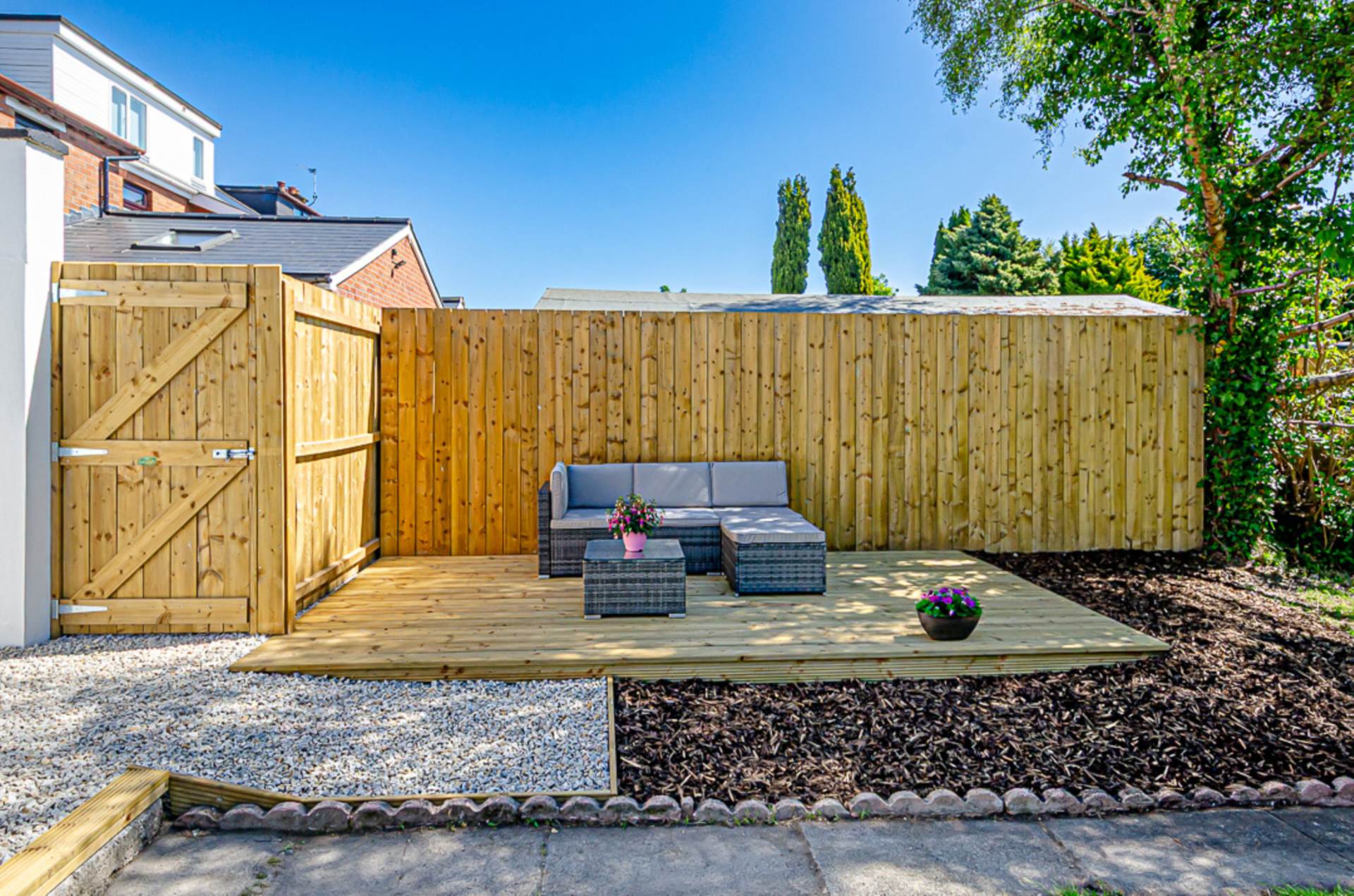 Front garden in Donegal quartz stones with adjacent driveway (Space for multiple cars). Extensive rear garden in Mayfair silver granite paved patio, small stones, shrubs and trees. Raised decked area perfect for sitting out.
