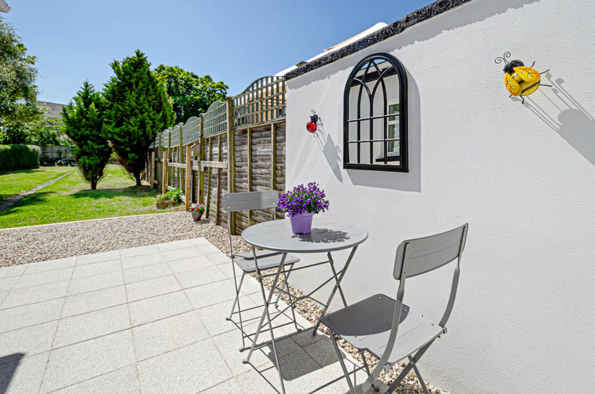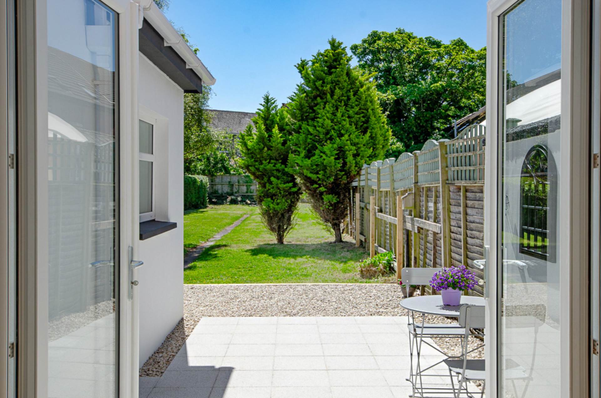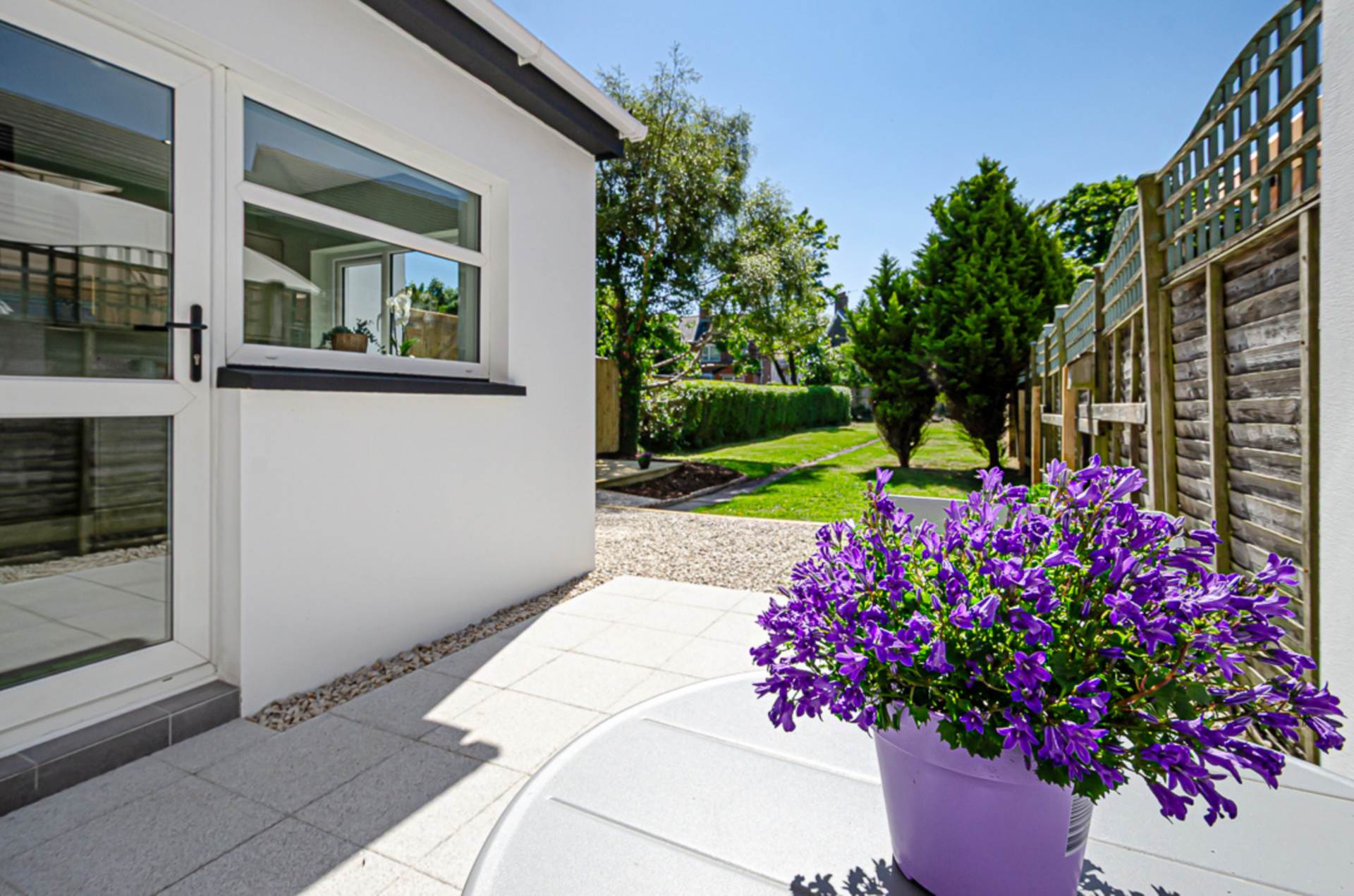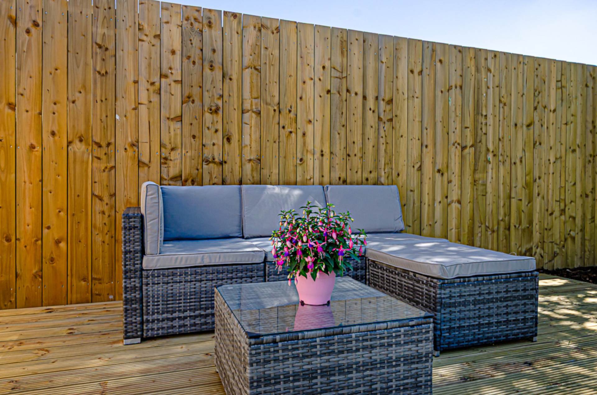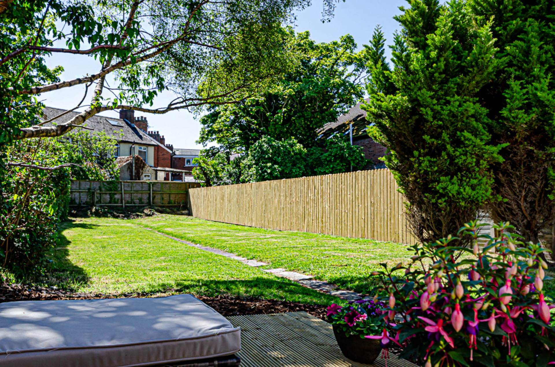 Front garden in Donegal quartz stones with adjacent driveway (Space for multiple cars). Extensive rear garden in Mayfair silver granite paved patio, small stones, shrubs and trees. Raised decked area perfect for sitting out.