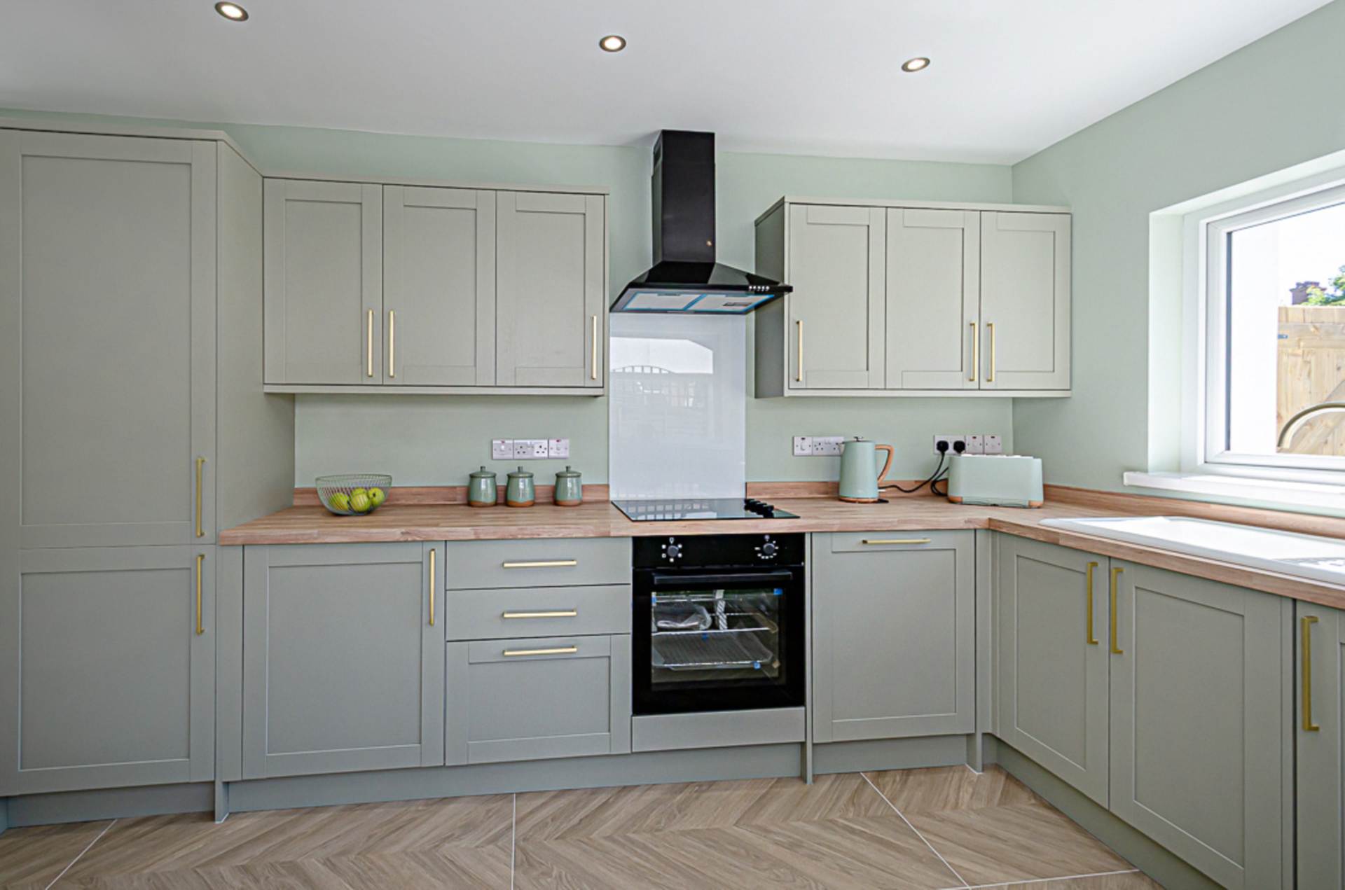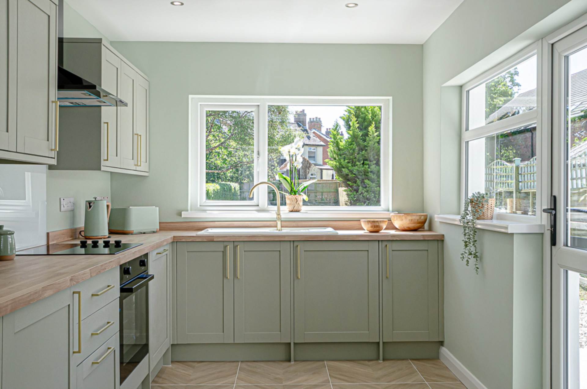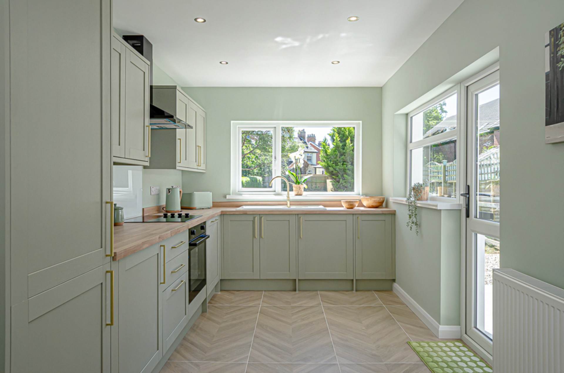 Range of high and low level fitted units in sage green finish with brass handles, integrated oven, ceramic hob, glass splash back, black extractor canopy, white ceramic sink with brass tap, space for integrated fridge freezer, space for integrated washing machine and dishwasher, chevron ceramic tiled floor, and recessed spotlights. Double aspect windows with views to garden
