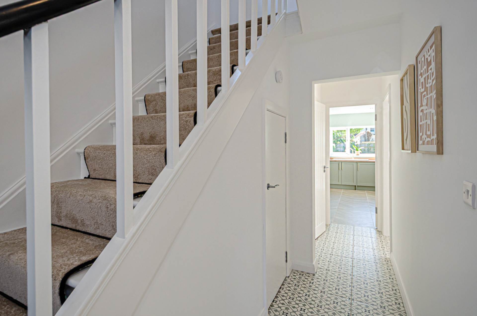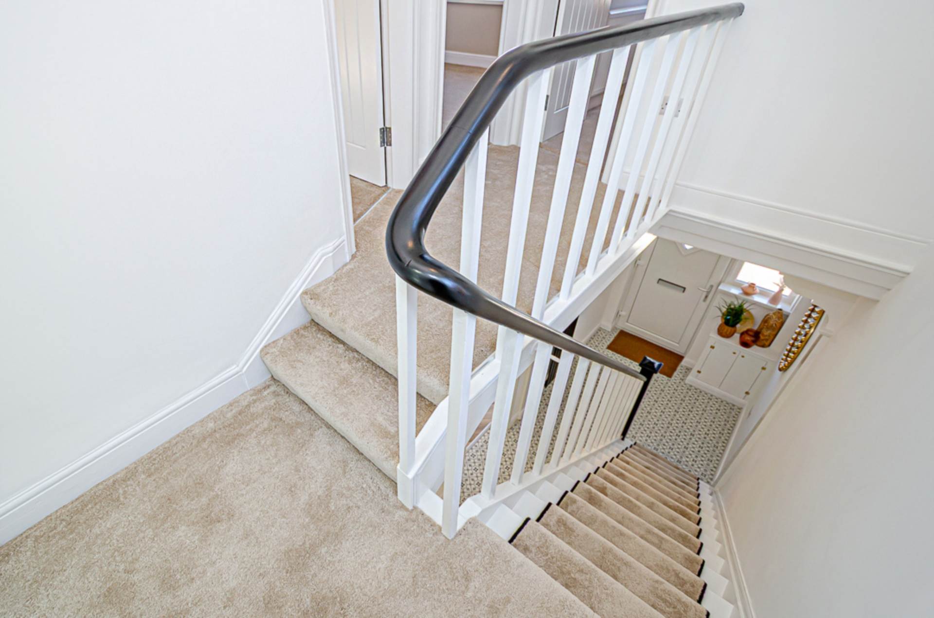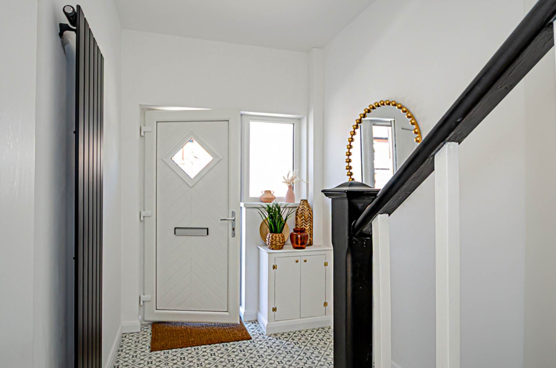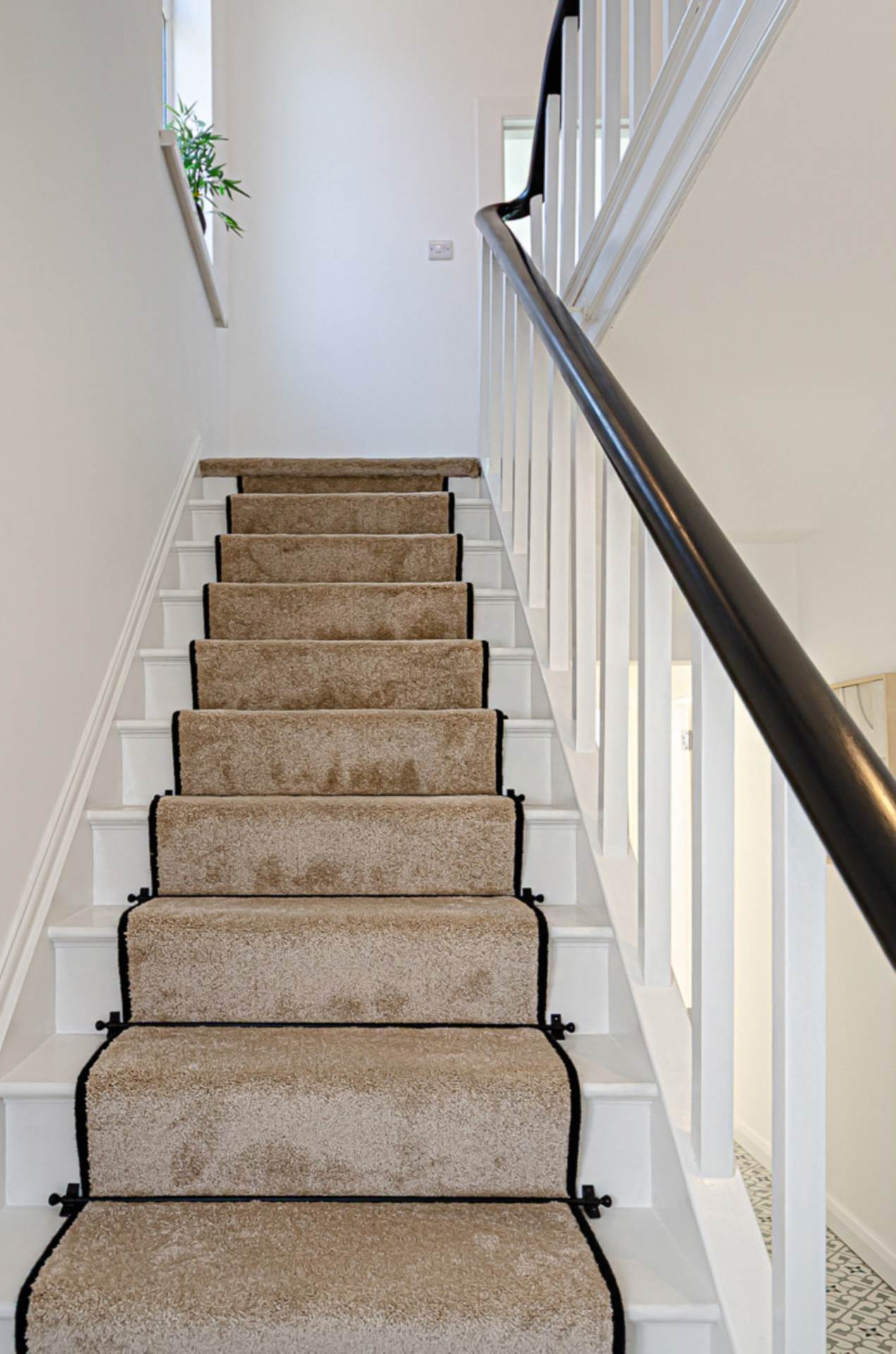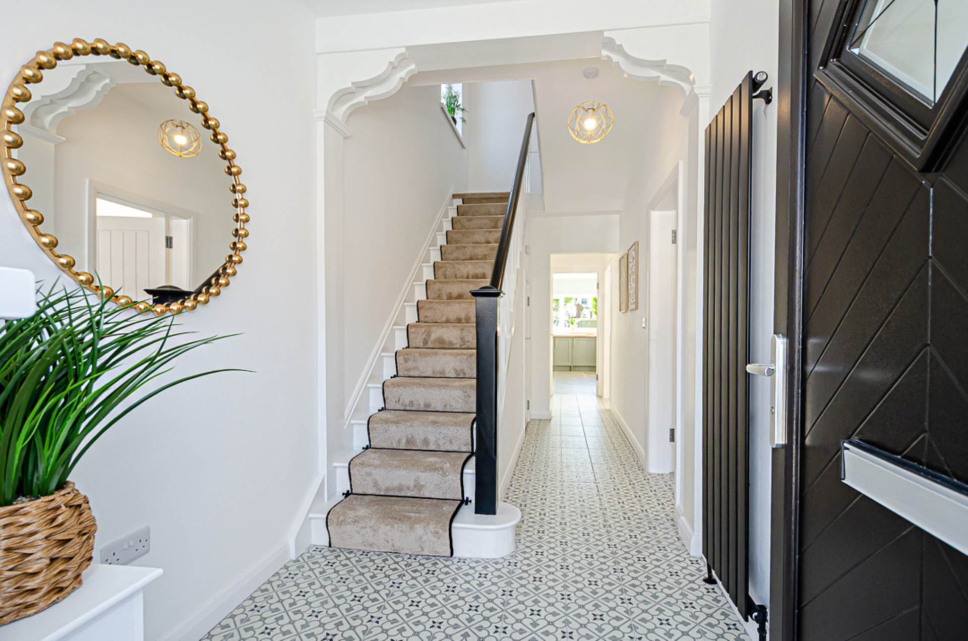 Corbels, black vertical radiator, decorative ceramic tiled floor, and storage under stairs with tiled floor and gas boiler. Stairs with black edged runner and black stair rods