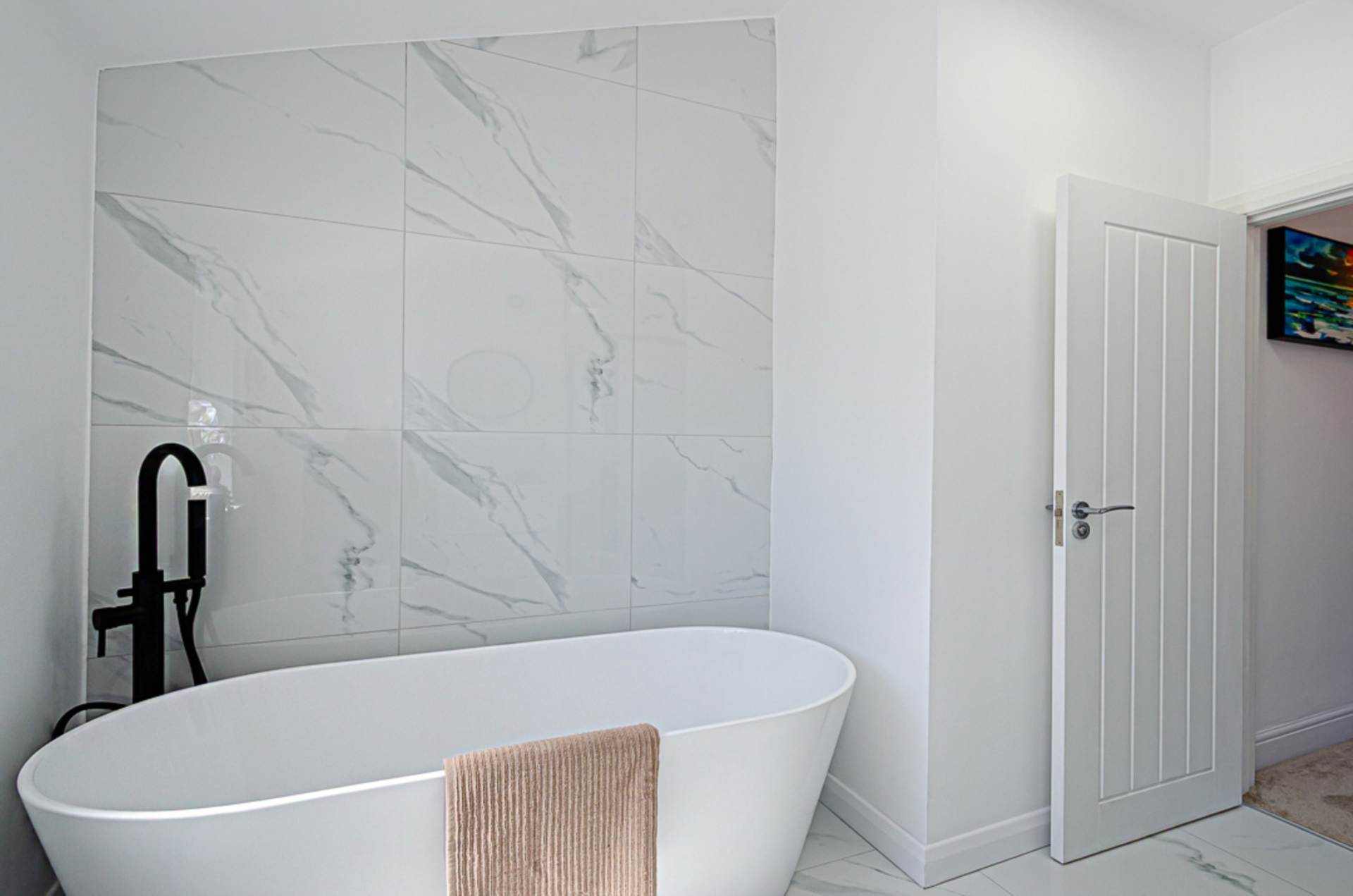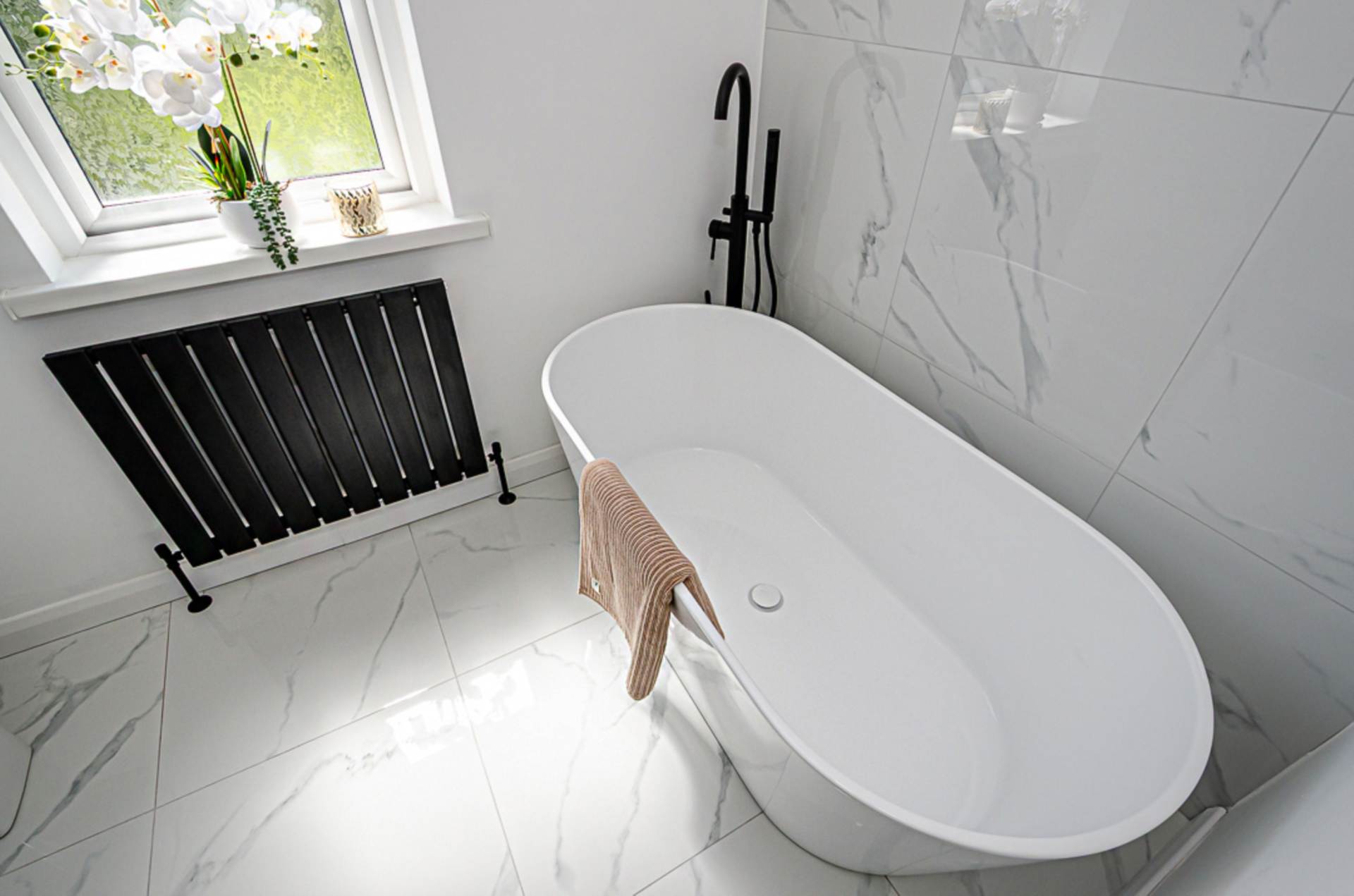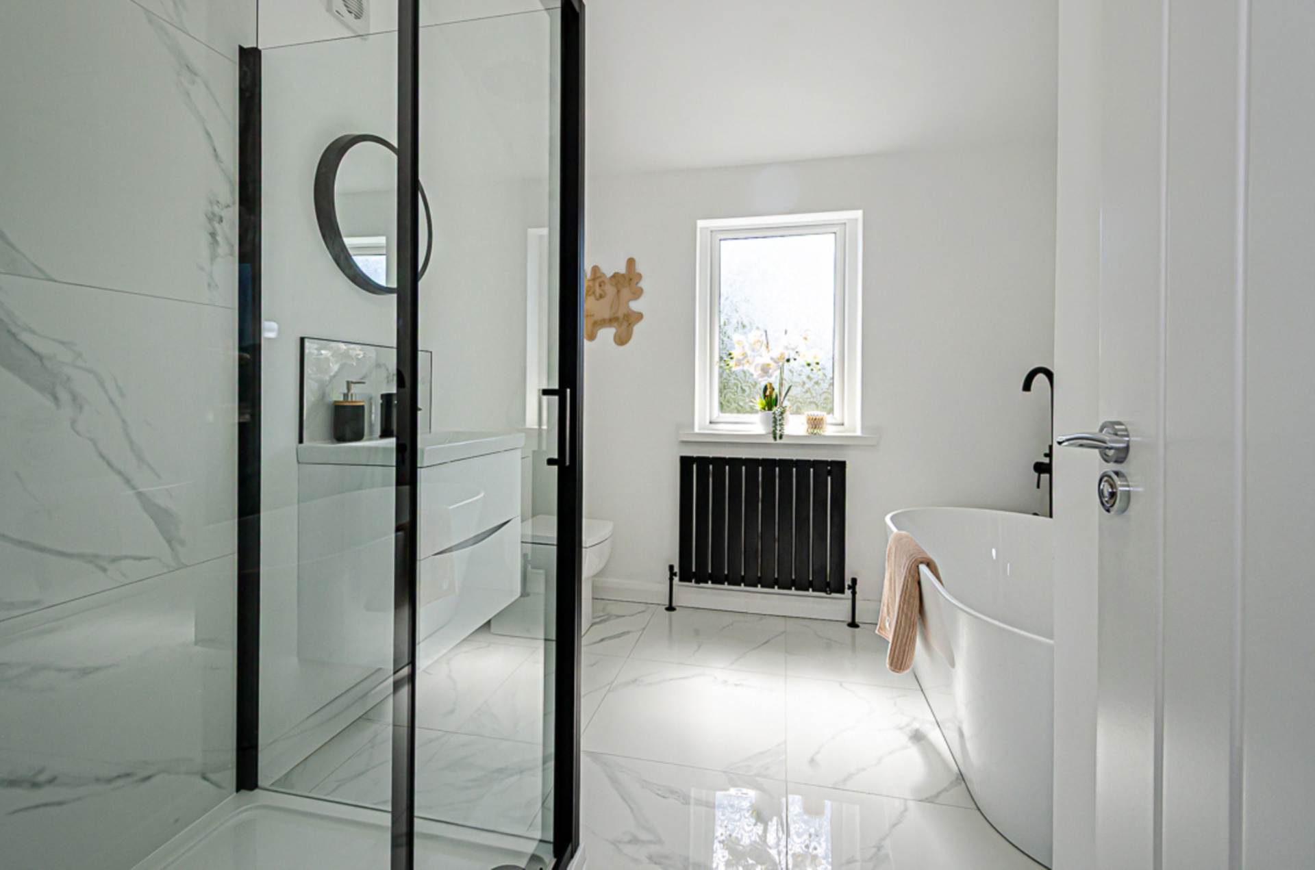 White suite. Freestanding bath with freestanding black tap and tiled bath area, large shower enclosure with black thermostatic shower, dual shower heads, and sliding door, wall hung vanity unit with black fittings and tiled splash back, W.C. black panel radiator, marble effect porcelain tiled floor, and extractor fan