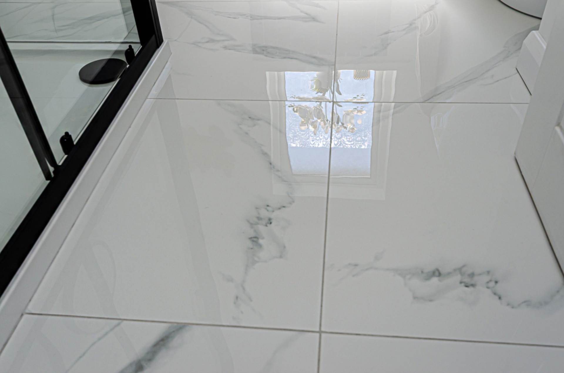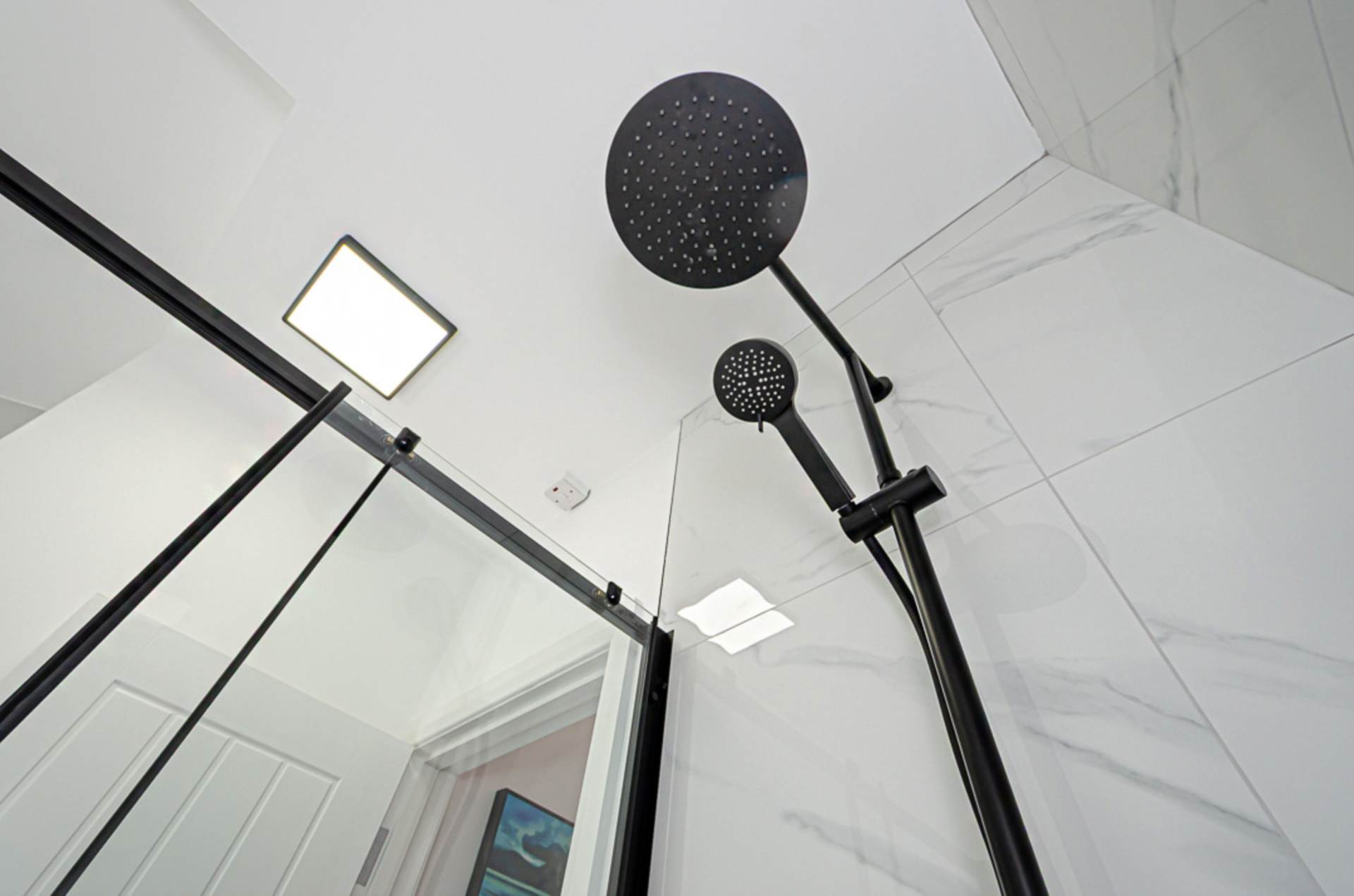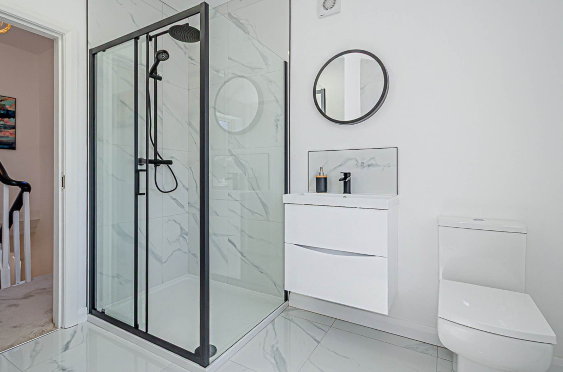 White suite. Freestanding bath with freestanding black tap and tiled bath area, large shower enclosure with black thermostatic shower, dual shower heads, and sliding door, wall hung vanity unit with black fittings and tiled splash back, W.C. black panel radiator, marble effect porcelain tiled floor, and extractor fan
