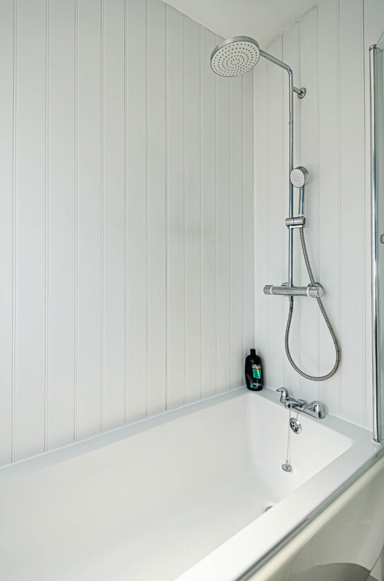 White suite with thermostatic shower and screen over bath, wash hand basin, W.C., part P.V.C. panelled walls, chrome towel rail radiator, recessed spotlights and extractor fan