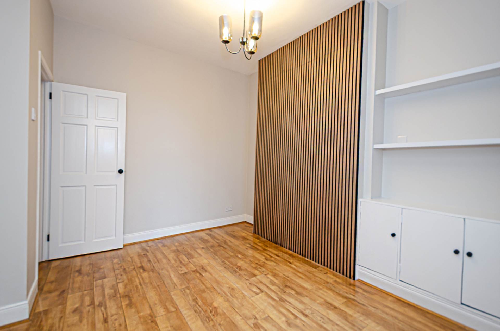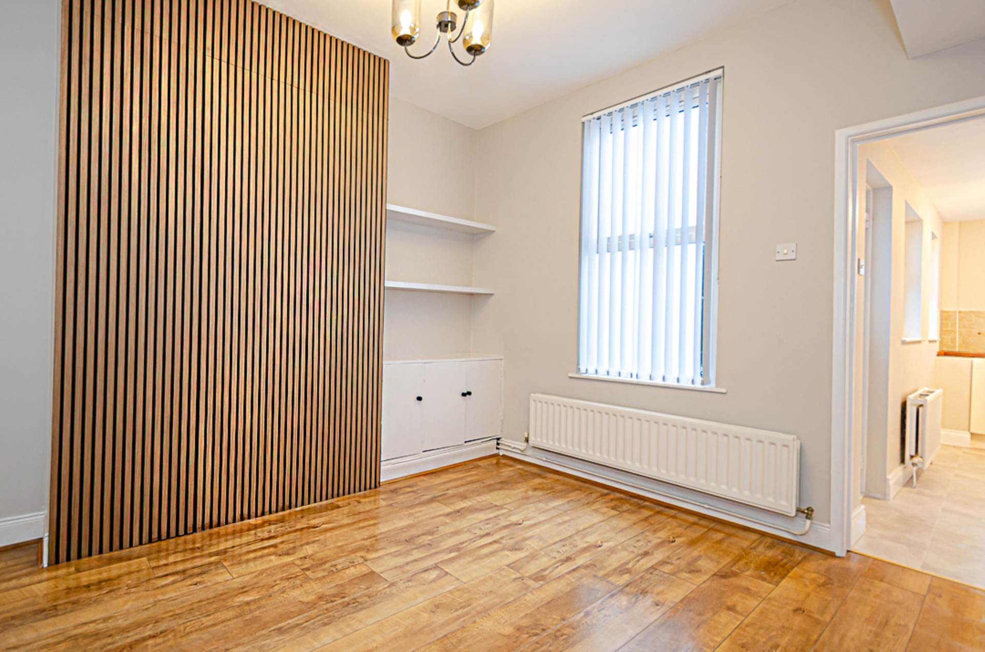 Dining room - 11'11" (3.63m) x 10'9" (3.28m)Modern panelled walls, storage under stairs, and timber laminate floor