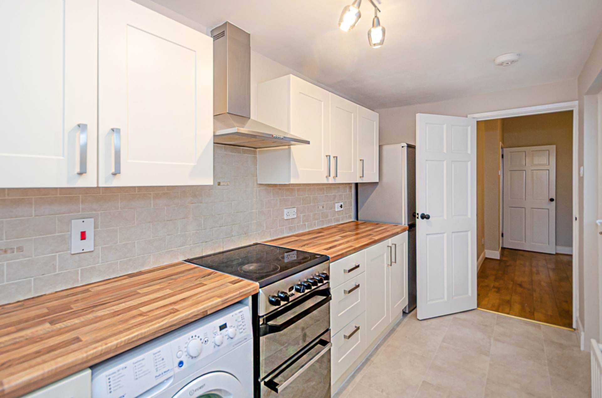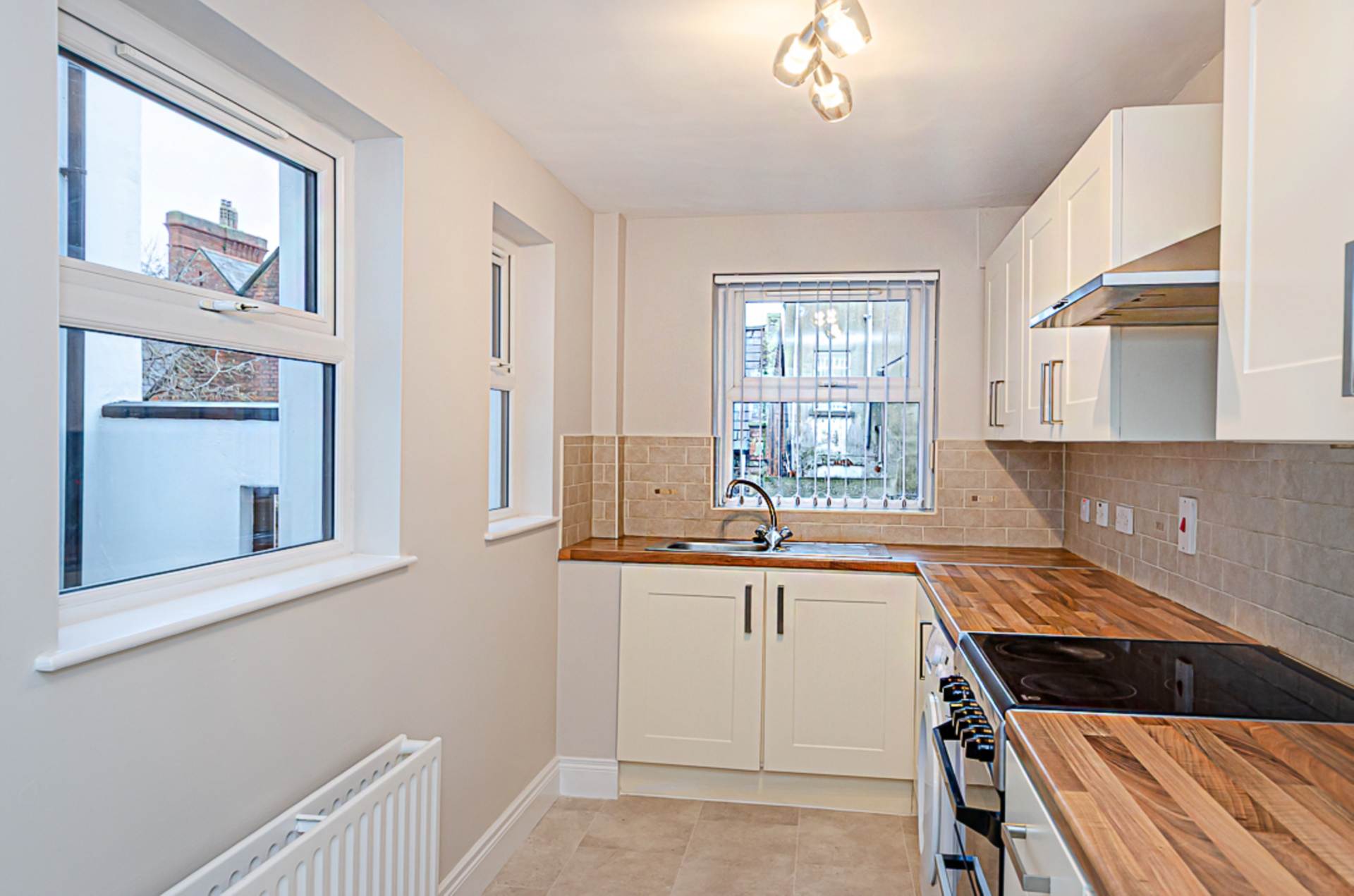 To the rear, the modern fitted kitchen enjoys pleasant open views across the garden, offering a bright, functional, and well-planned space for cooking and dining.