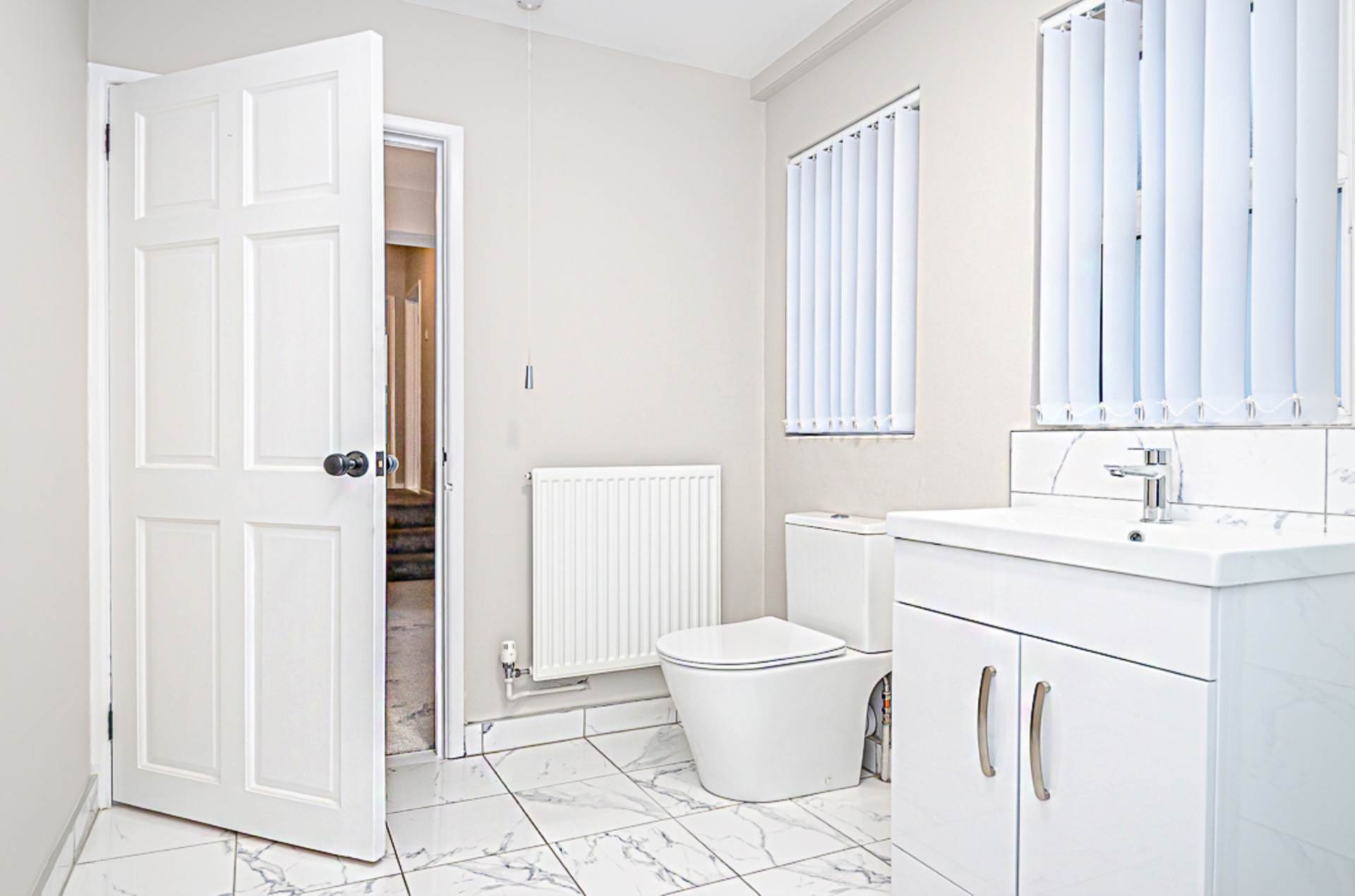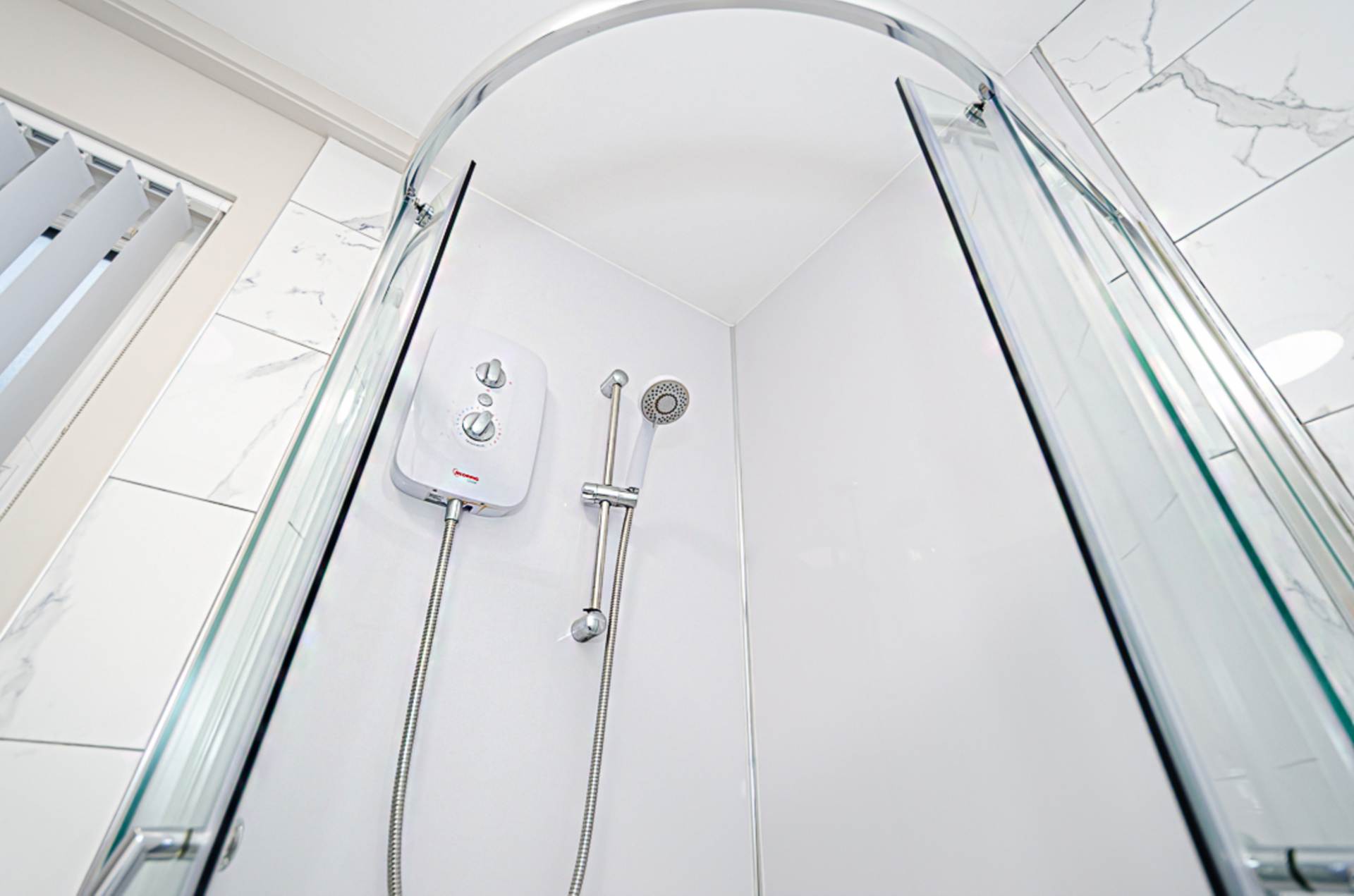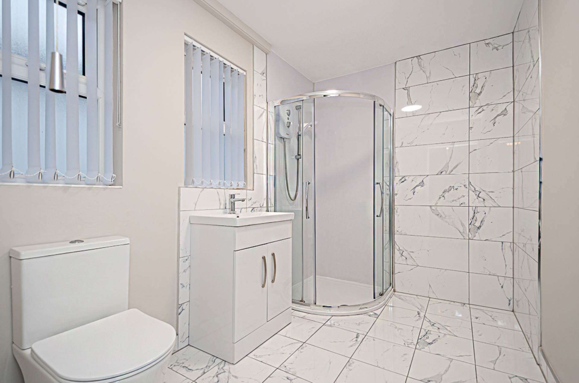 First floorBedroom 1 - 13'11" (4.24m) x 10'2" (3.1m)Bedroom 2 - 11'11" (3.63m) x 8'6" (2.59m)Shower room - 9'2" (2.79m) x 5'11" (1.8m)Corner shower cubicle with electric shower, PVC panelling and sliding doors, wash hand basin in vanity unit with chrome fittings, W.C., marble effect part tiled walls, and marble effect ceramic tiled floor