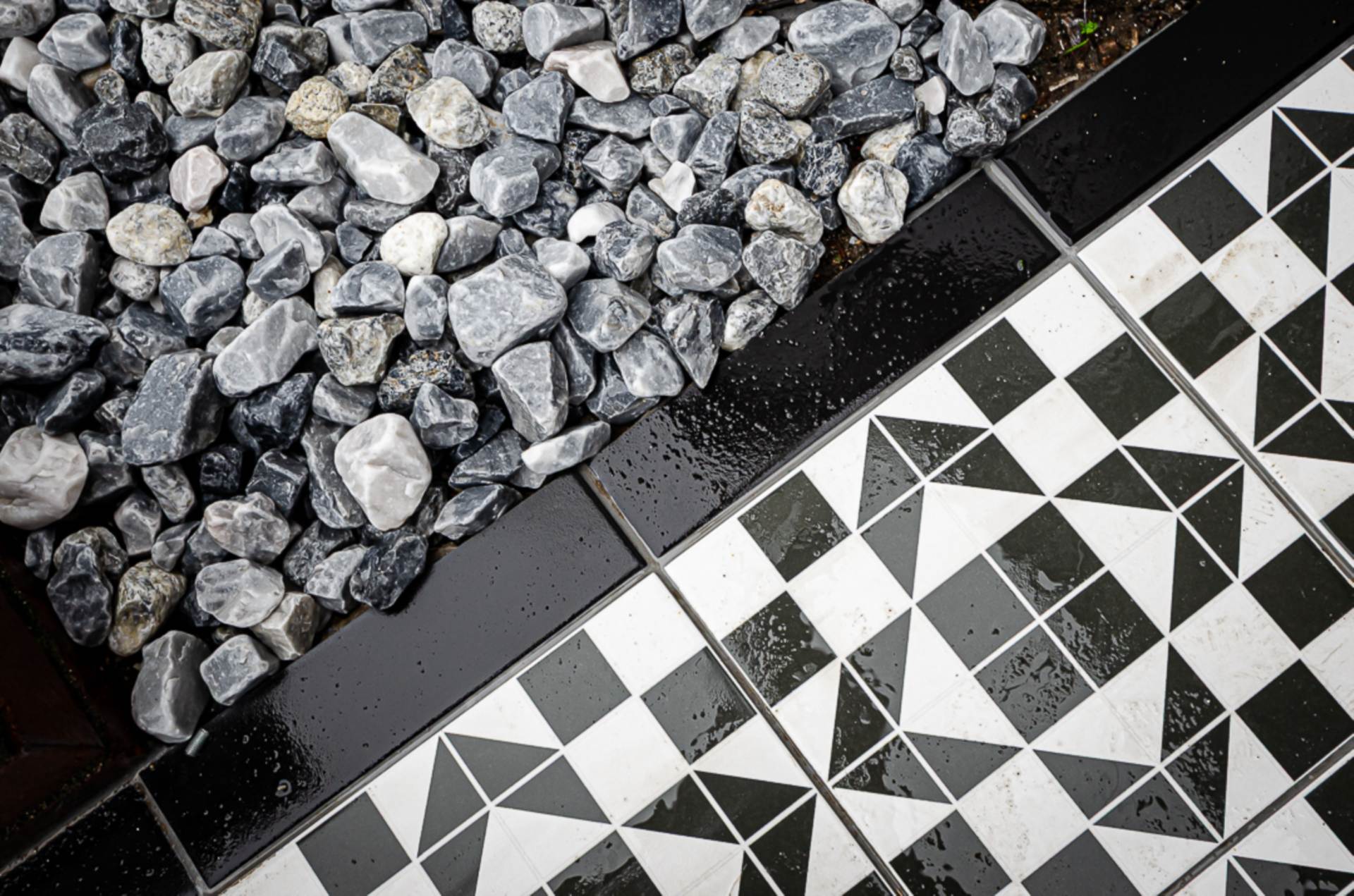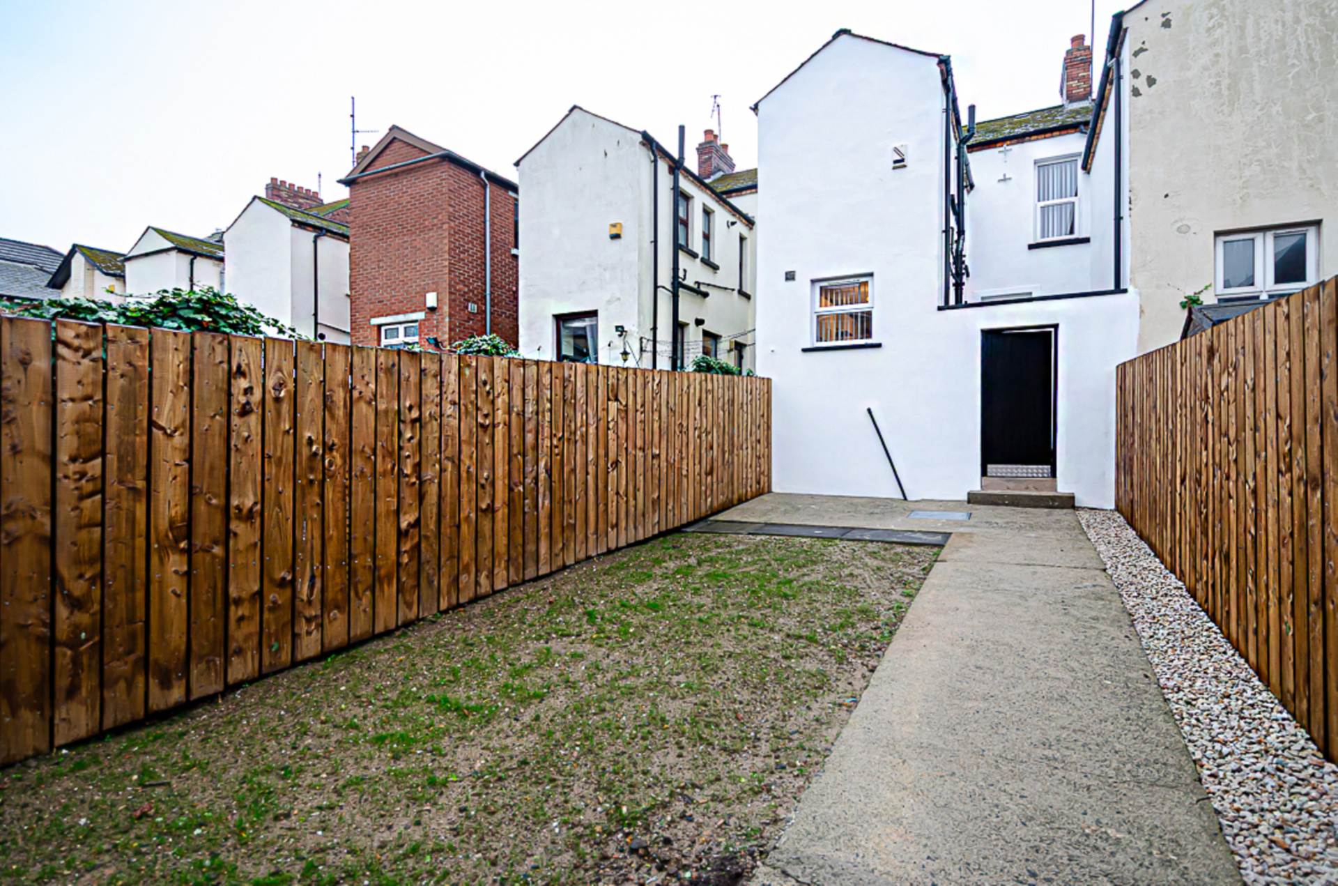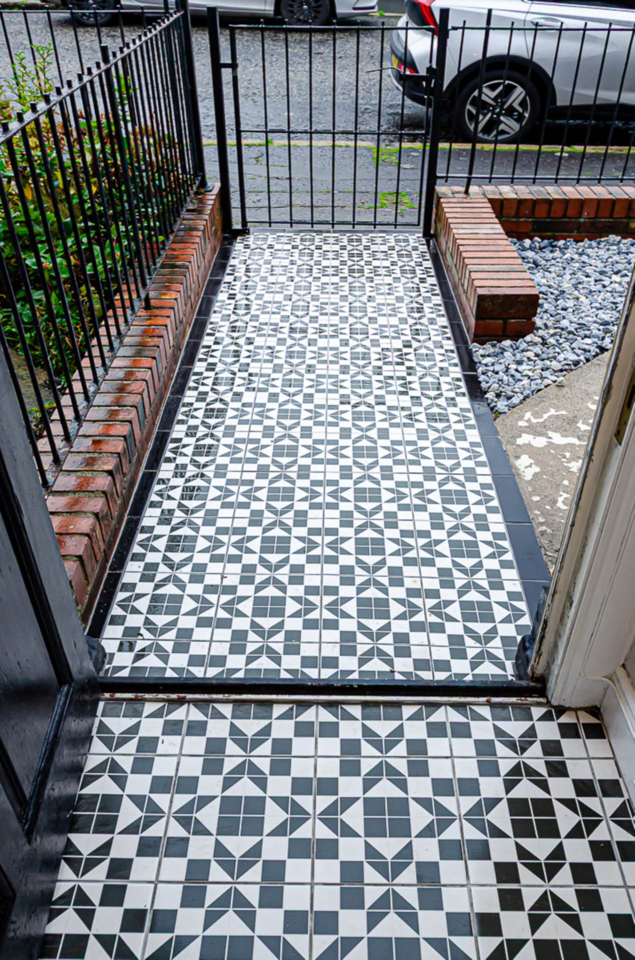 OutsideForecourt in stones and decorative tiled path. Rear yard with access to rear garden in small stones, path and lawn