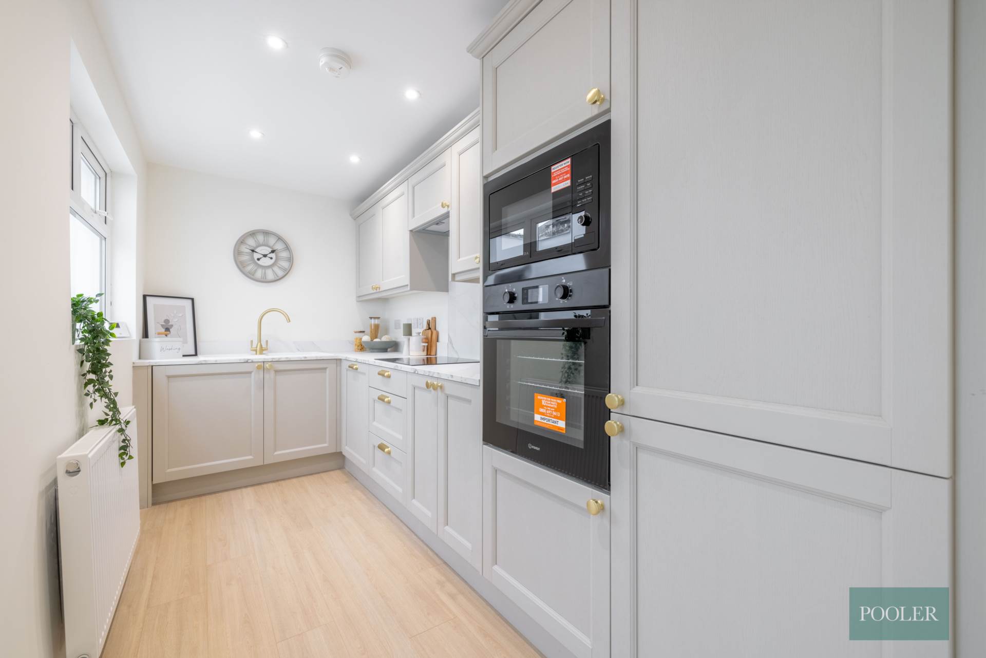 Newly fitted range of high and low level units in light grey finish with brass handles, integrated oven and microwave, ceramic hob, splashback, concealed extractor fan, integrated fridge freezer, integrated dishwasher, integrated washing machine, white sink with brass mixer tap, timber laminate floor, and recessed spotlights
