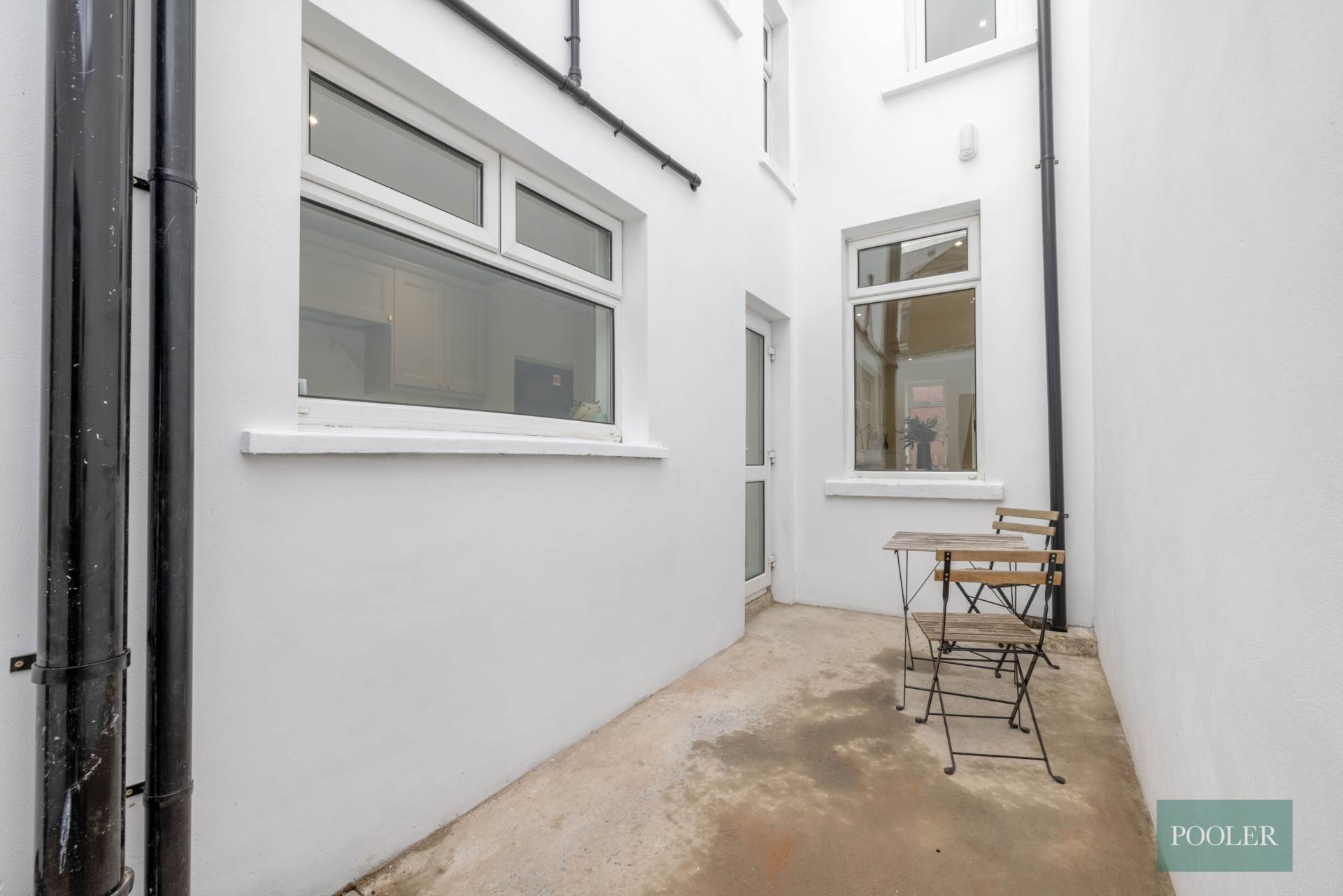 To the rear, a private courtyard provides a versatile outdoor space, perfect for dining al fresco, entertaining friends, or simply enjoying a quiet moment with a good book.