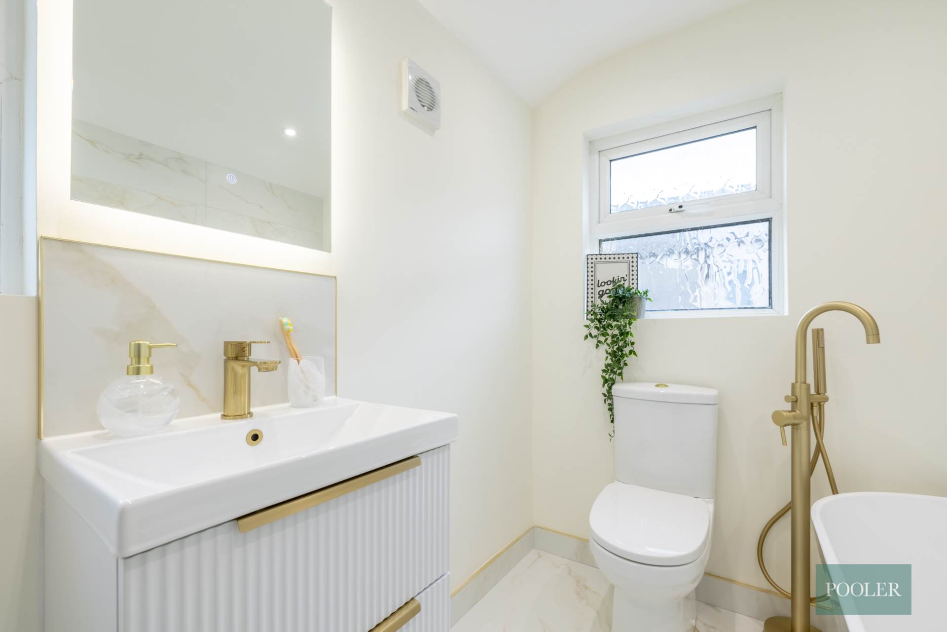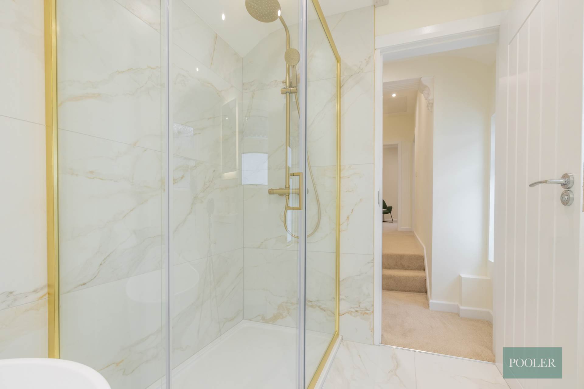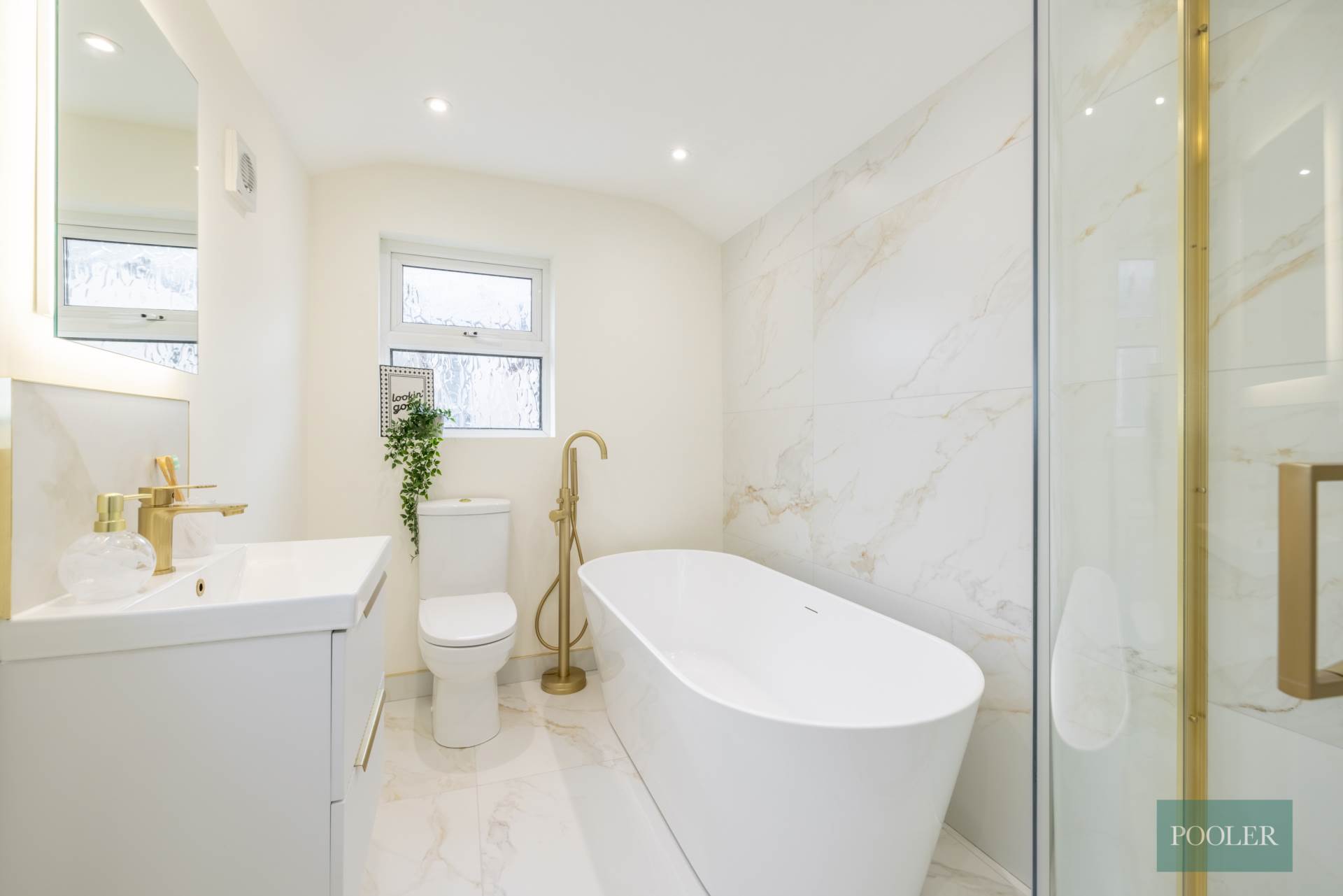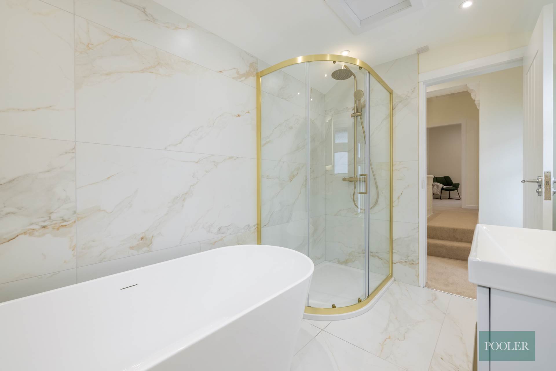Upstairs, the stunning bathroom is a true highlight, featuring a freestanding bath, a separate shower cubicle, and striking brushed brass fittings that bring a touch of luxury and sophistication. It`s a spa-like haven to enjoy at the end of the day.
