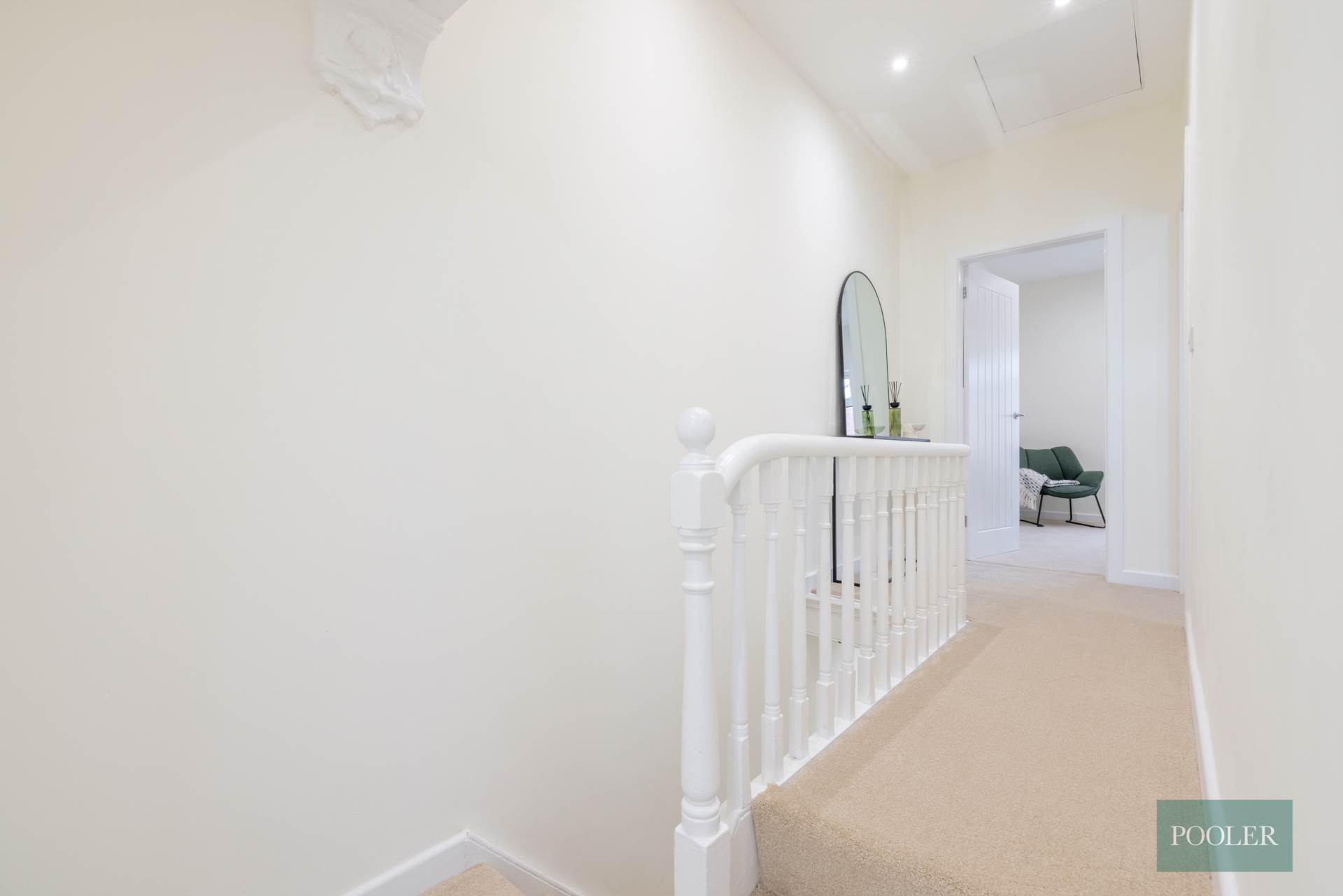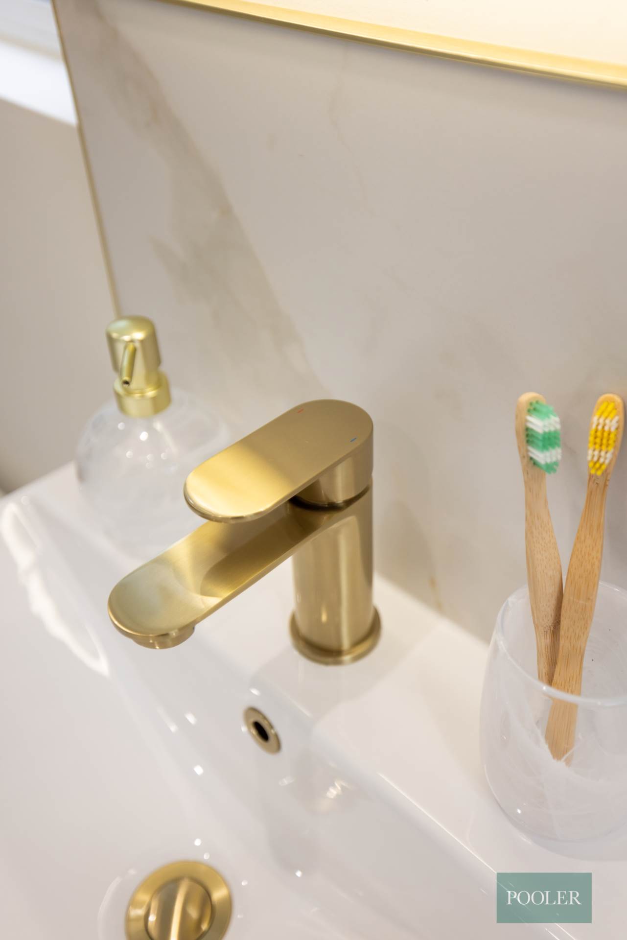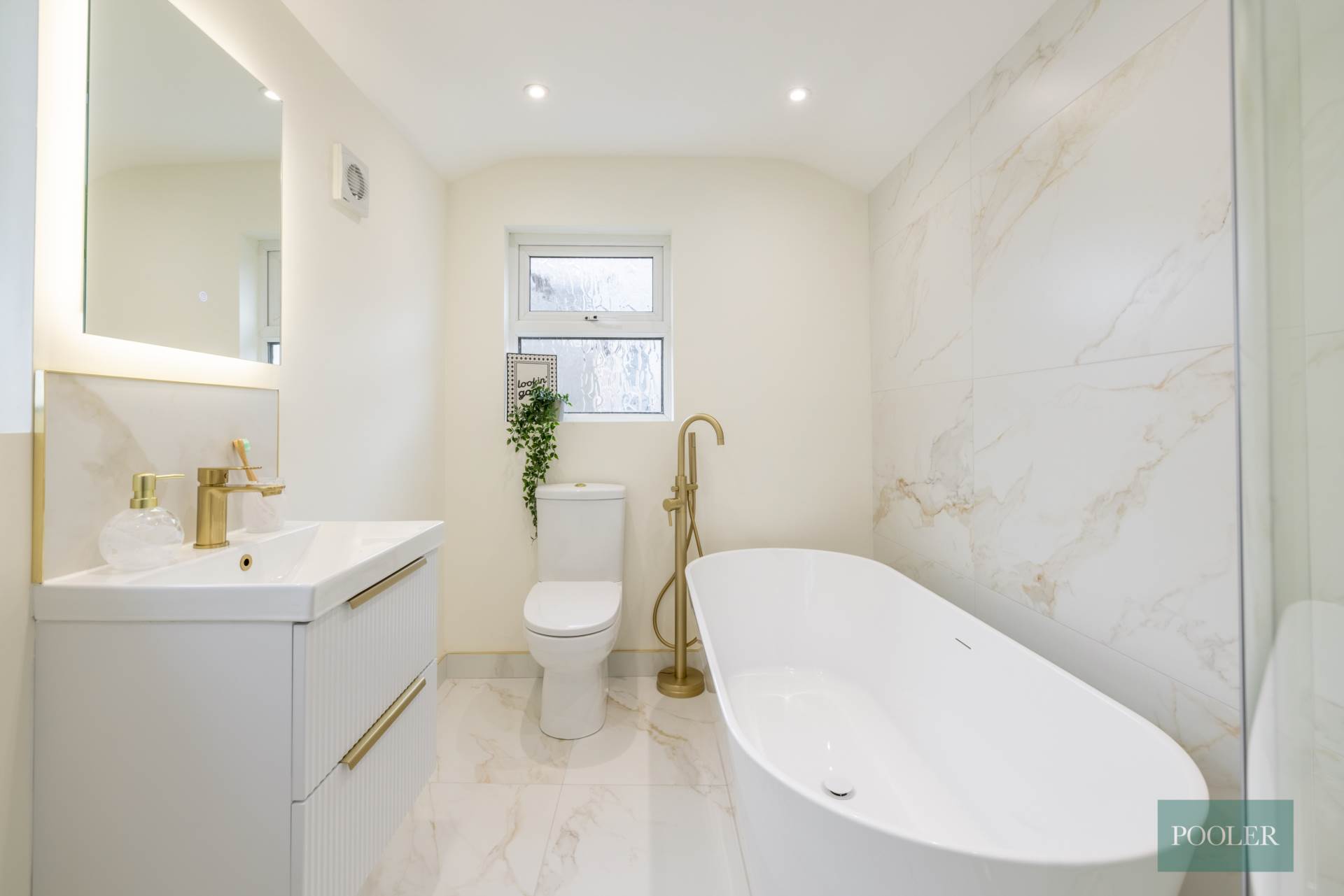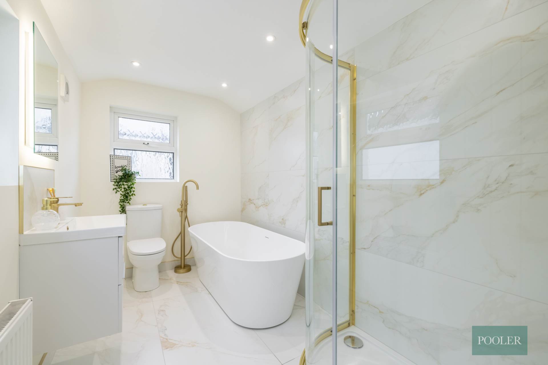 Upstairs, the stunning bathroom is a true highlight, featuring a freestanding bath, a separate shower cubicle, and striking brushed brass fittings that bring a touch of luxury and sophistication. It`s a spa-like haven to enjoy at the end of the day.
