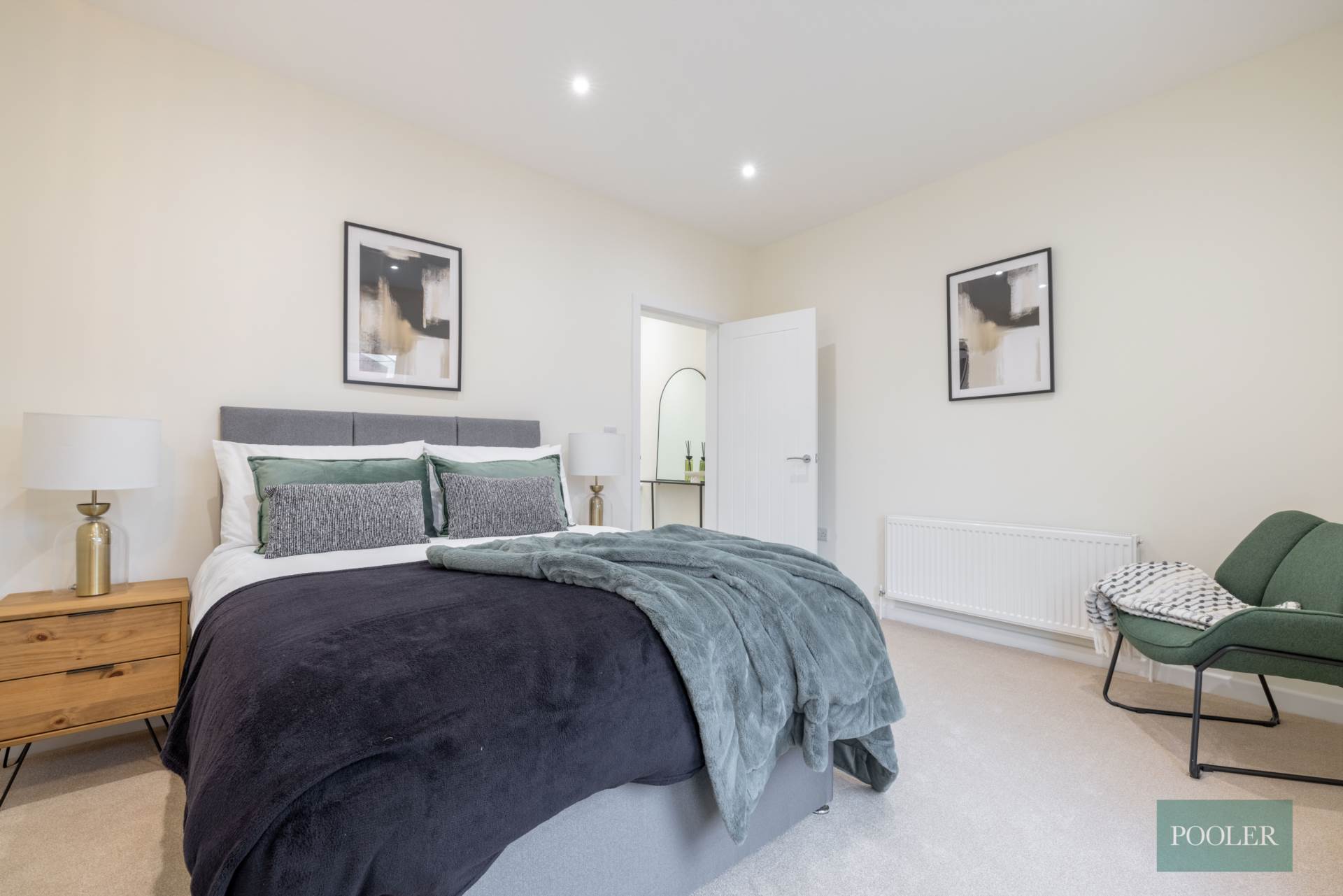 The living room is a relaxing retreat, complete with a feature electric fire that adds warmth and ambience, while modern lighting enhances the bright and uplifting atmosphere.