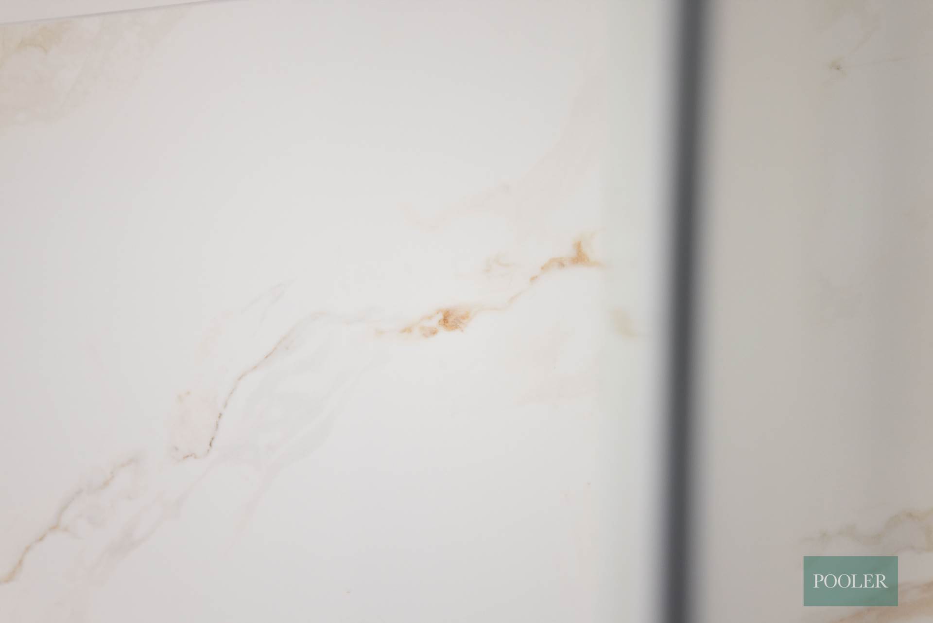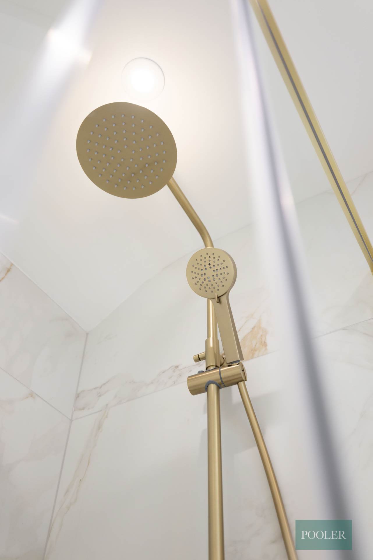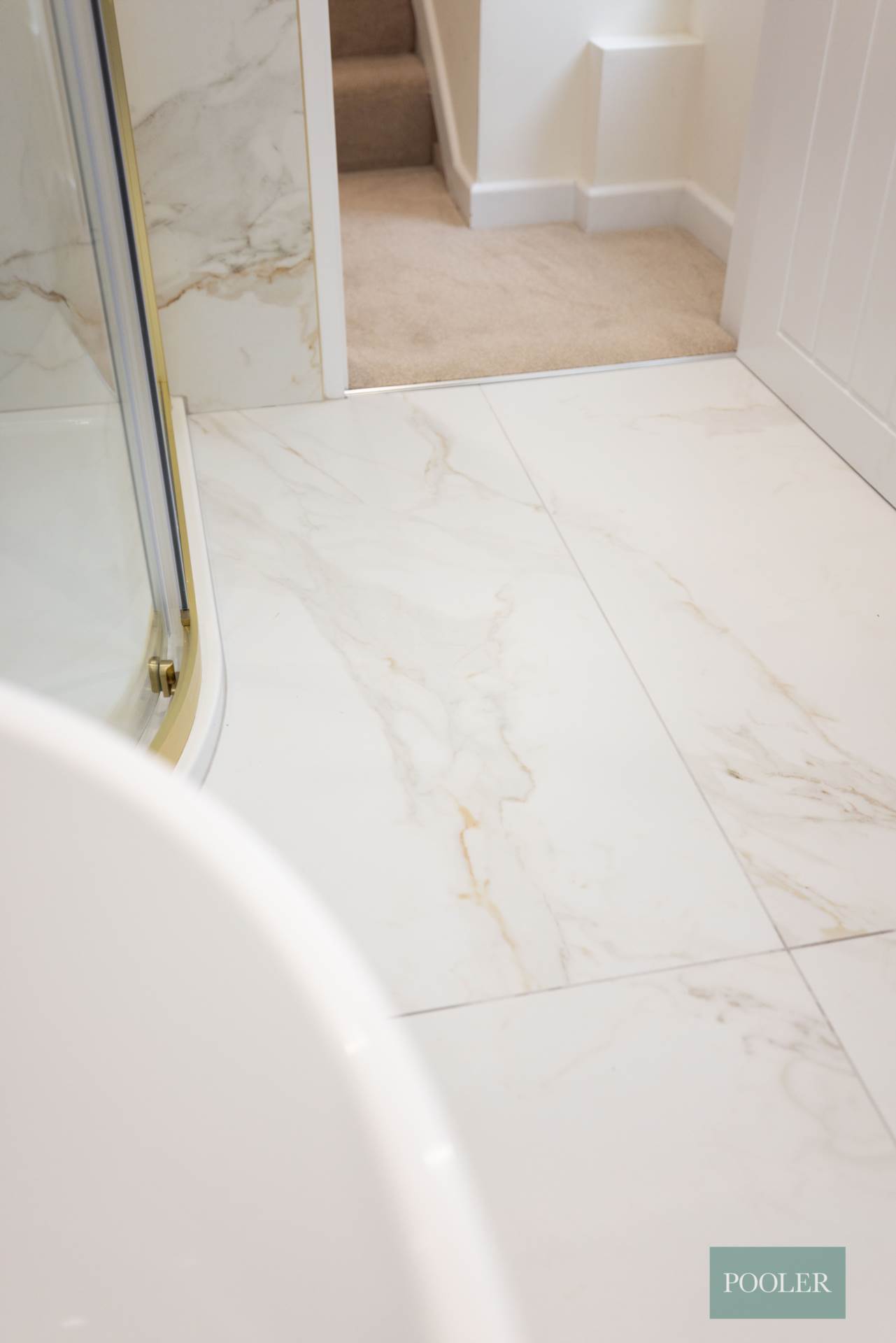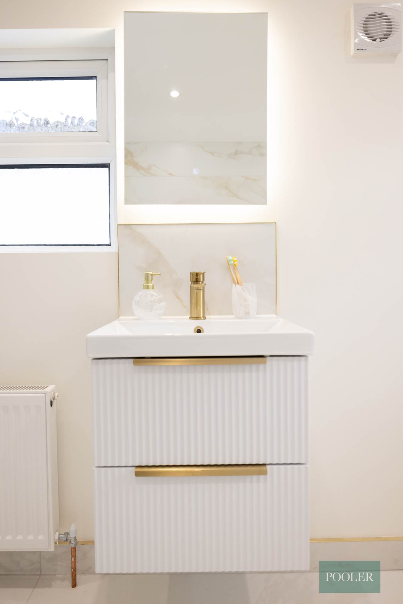 White suite - freestanding bath with brushed brass mixer tap, wash hand basin in two drawer, wall hung vanity unit with brushed brass taps and splashback, W.C., separate shower cubicle with brushed brass thermostatic shower, dual shower heads, and sliding doors, marble effect wall tiling, marble effect floor tiling and upstand, and extractor fan
