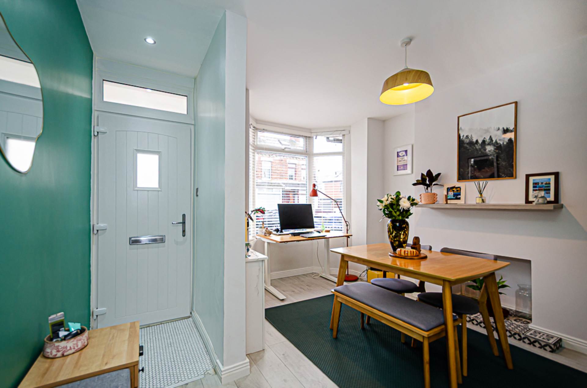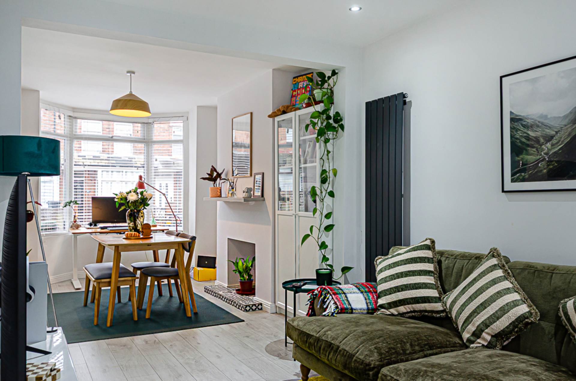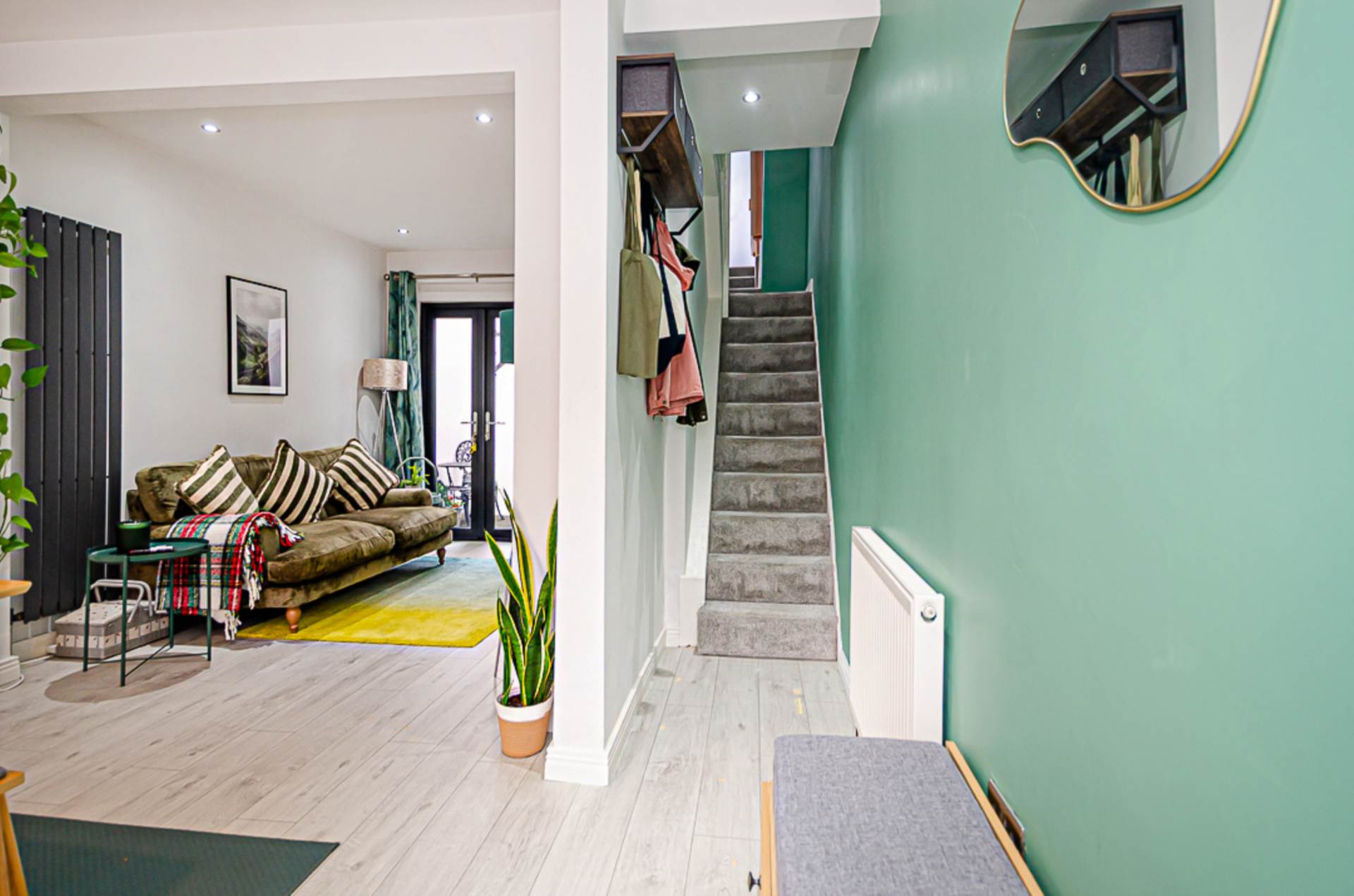Through lounge - 24'1" (7.34m) x 9'6" (2.9m)Bay window, hole-in-the-wall fireplace, anthracite vertical radiator, storage under stairs, recessed spotlights, and anthracite double doors to yard