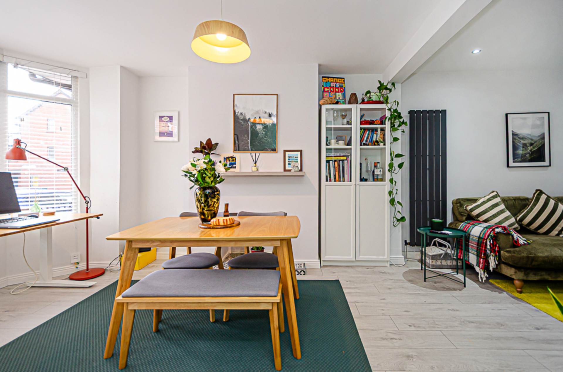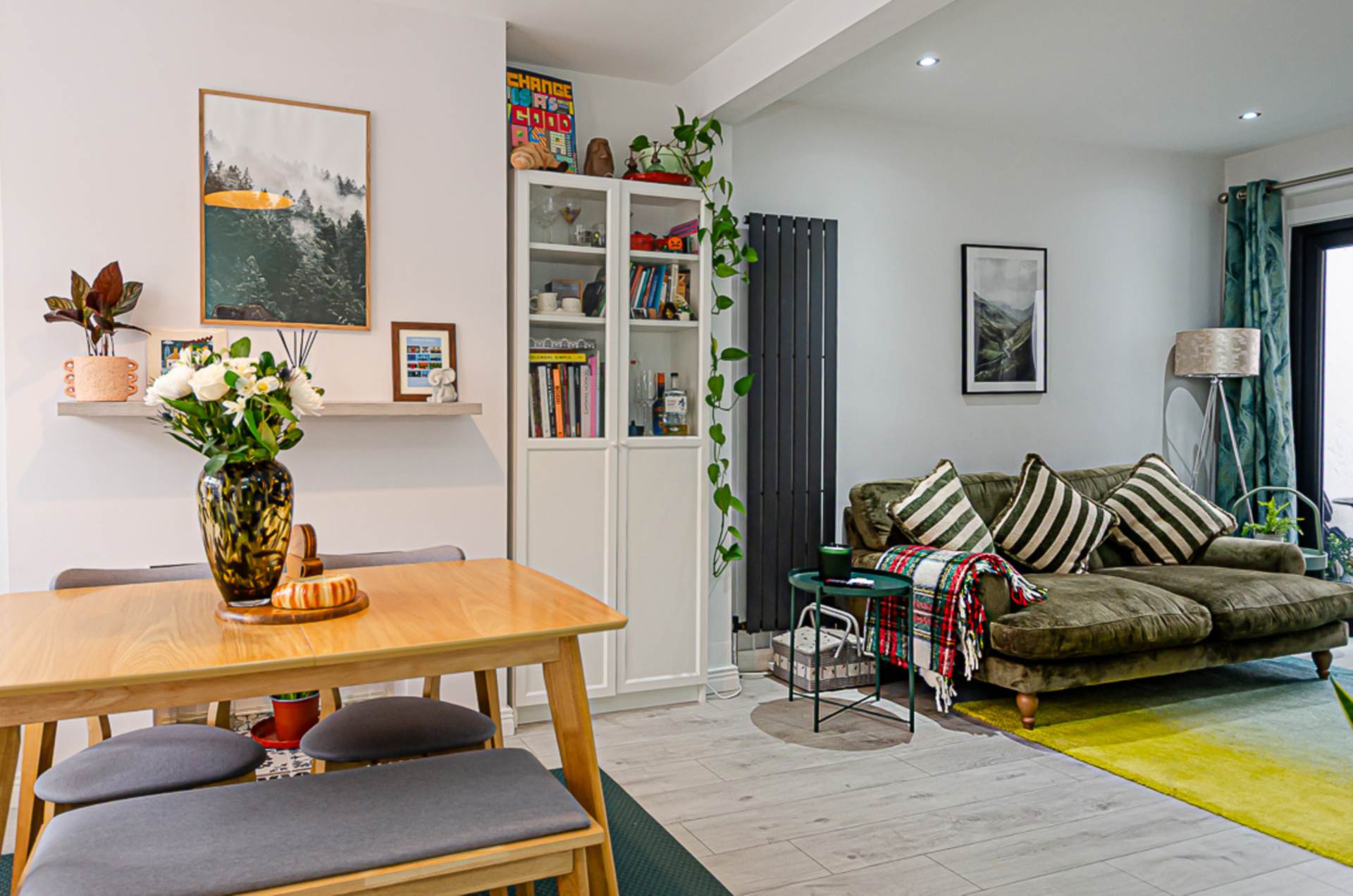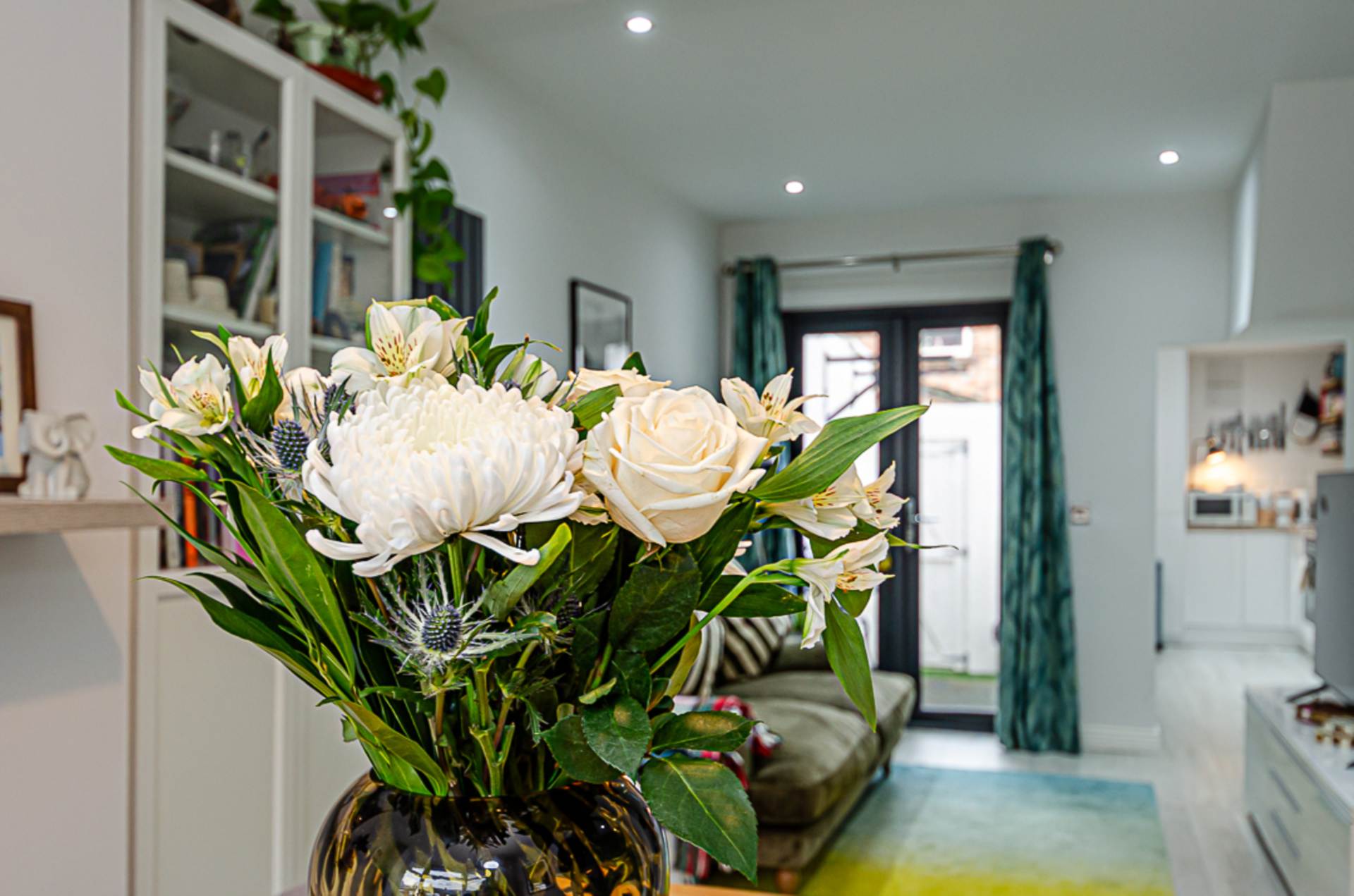 Through lounge - 24'1" (7.34m) x 9'6" (2.9m)Bay window, hole-in-the-wall fireplace, anthracite vertical radiator, storage under stairs, recessed spotlights, and anthracite double doors to yard