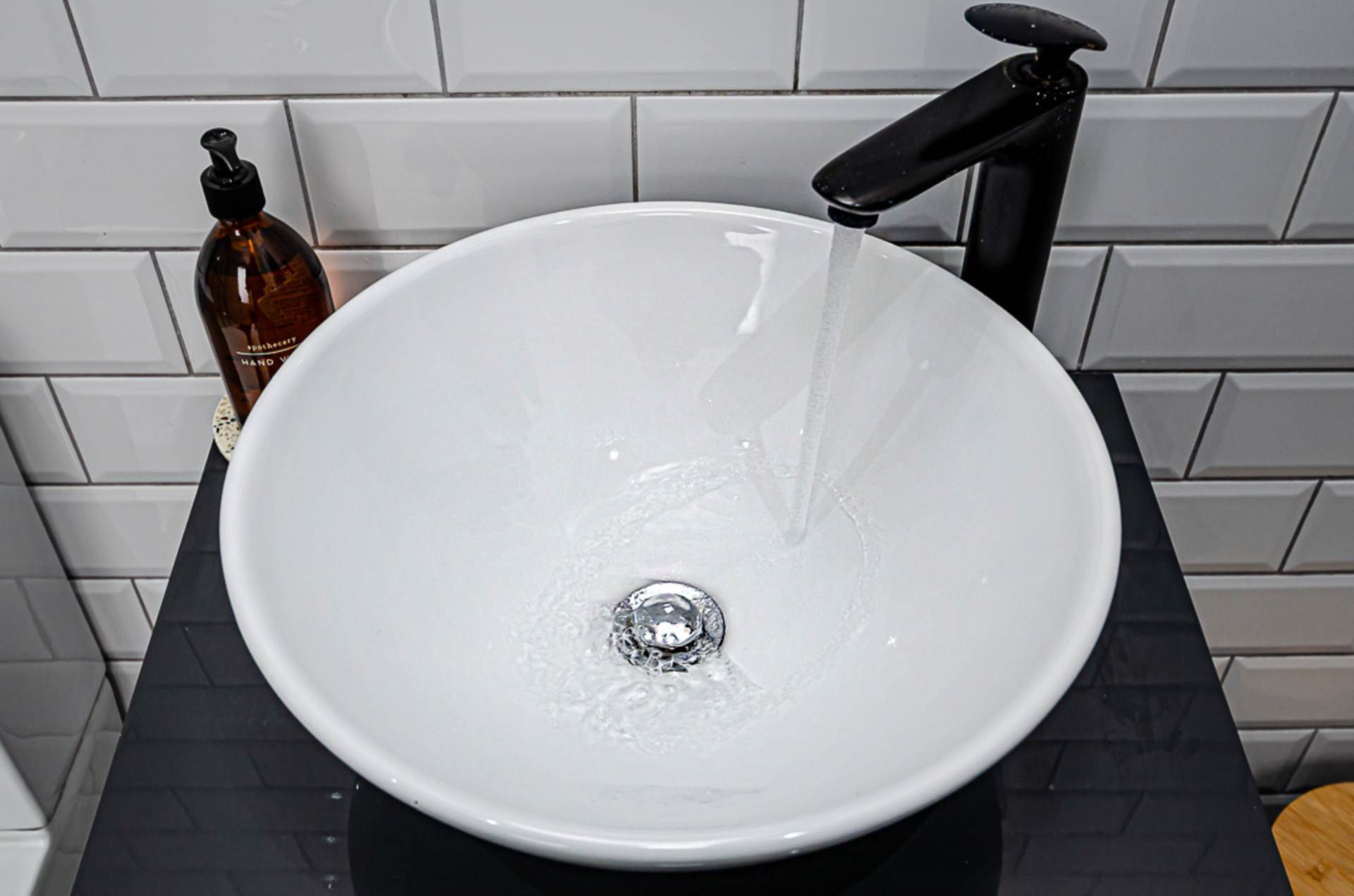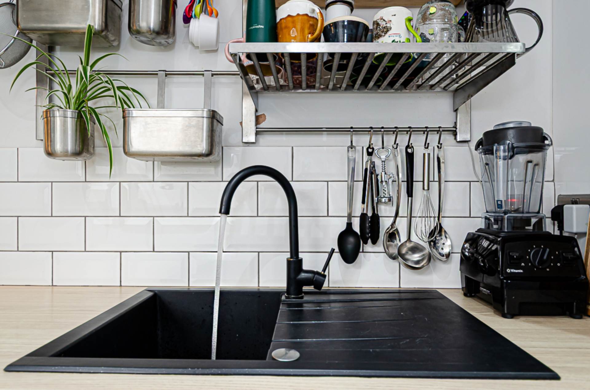 The modern fitted kitchen is thoughtfully designed and finished to a high standard, featuring a striking black sink and matching tap, stylish bevelled wall tiling and smart floor tiling, along with a range of integrated appliances.
