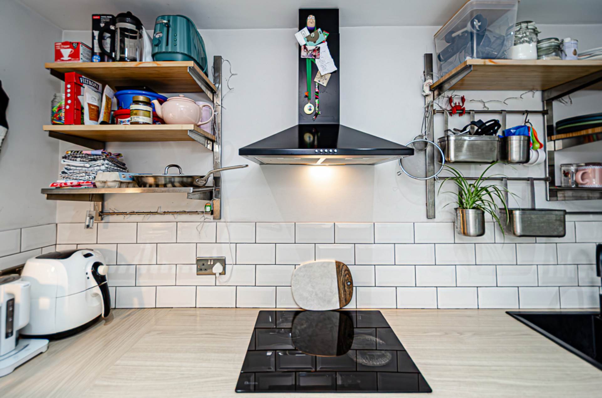 Kitchen - 14'0" (4.27m) x 5'10" (1.78m)Modern range of high and low level units, stainless steel oven, ceramic hob, black extractor fan, black sink and tap, integrated fridge freezer, part tiled walls, timber laminate floor, recessed spotlights and gas boiler in cupboard