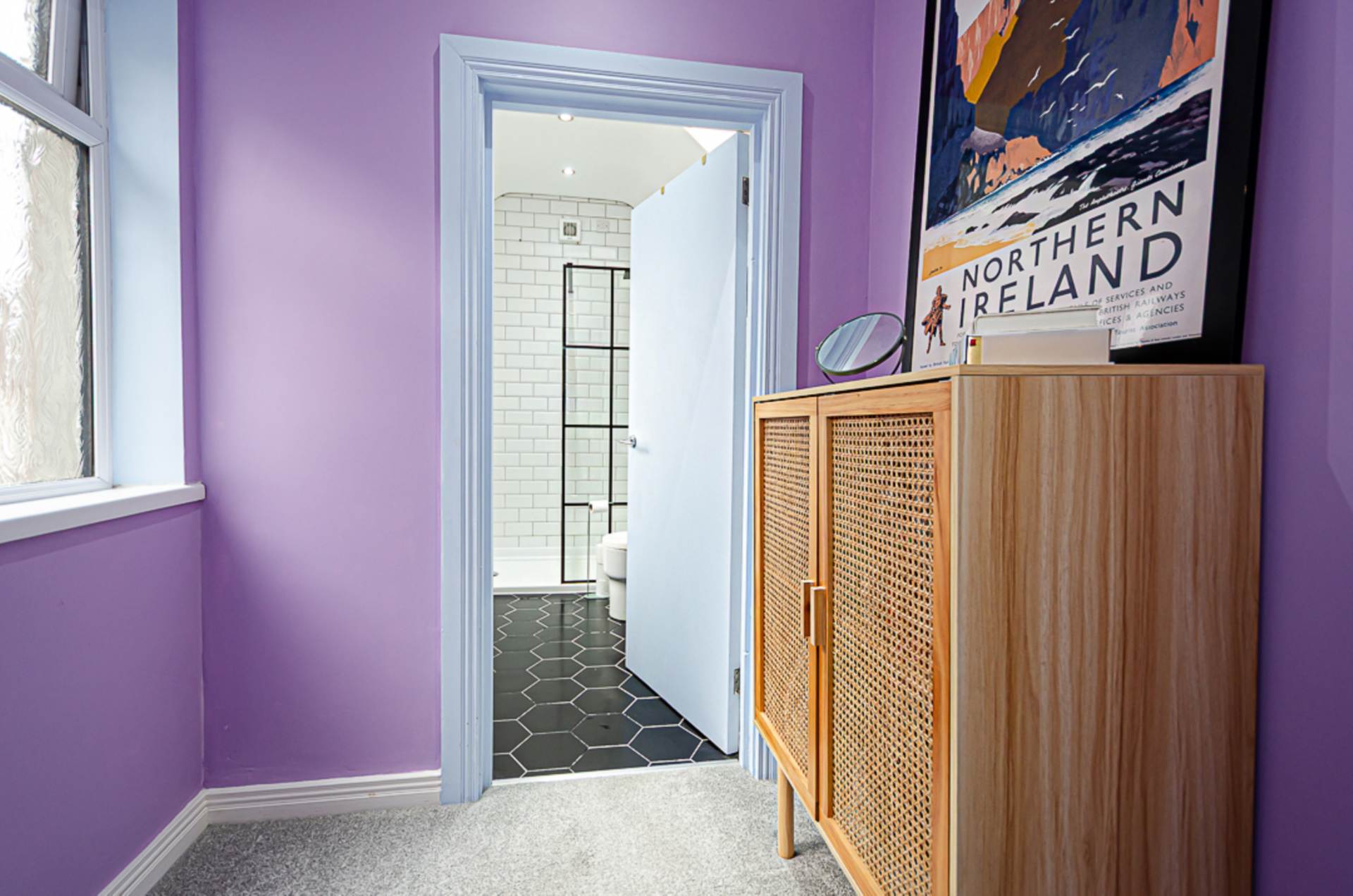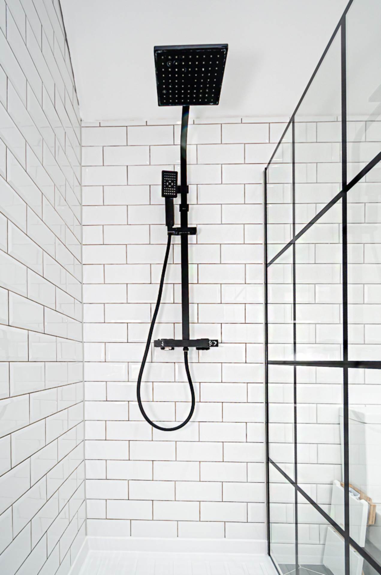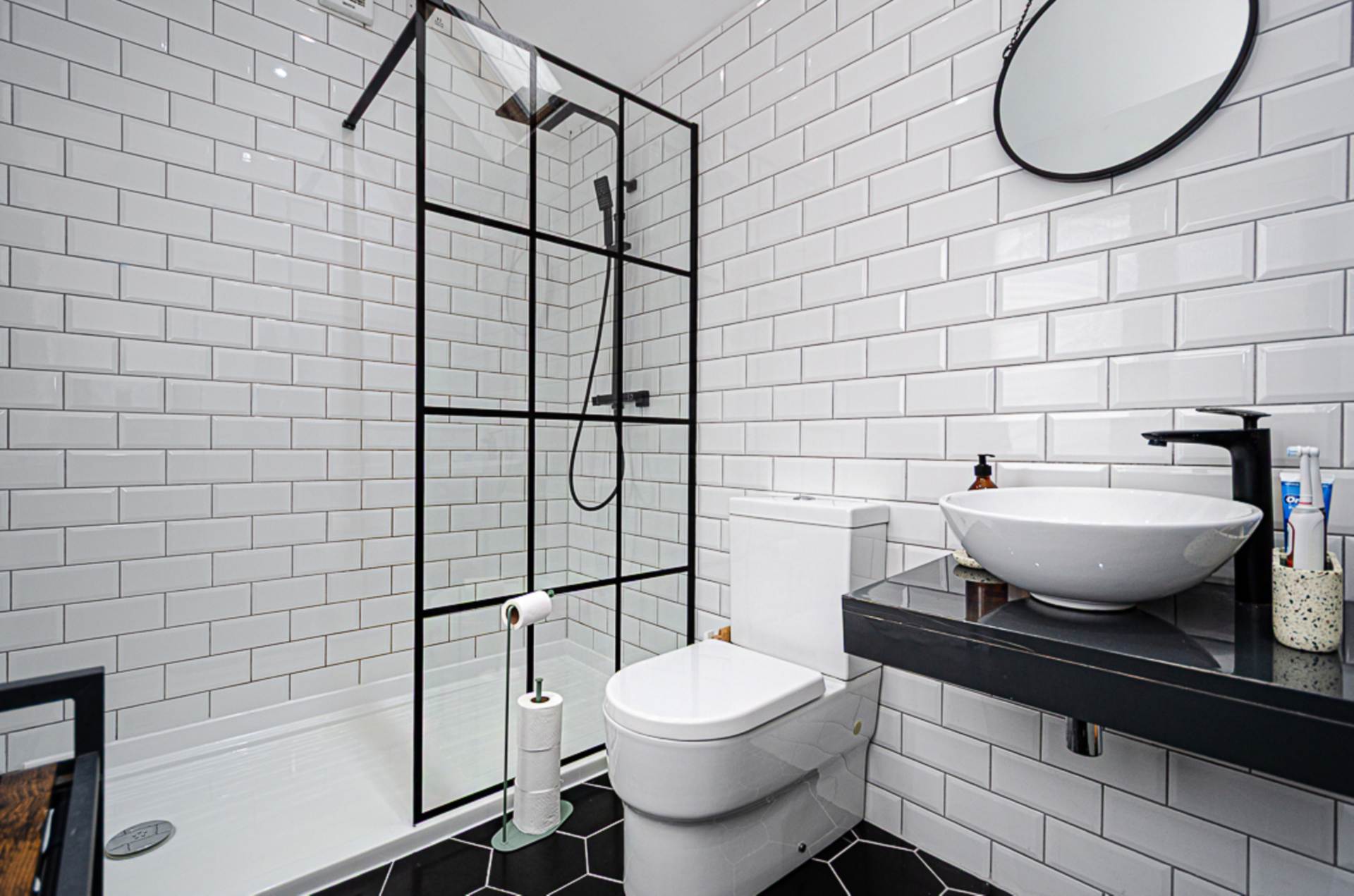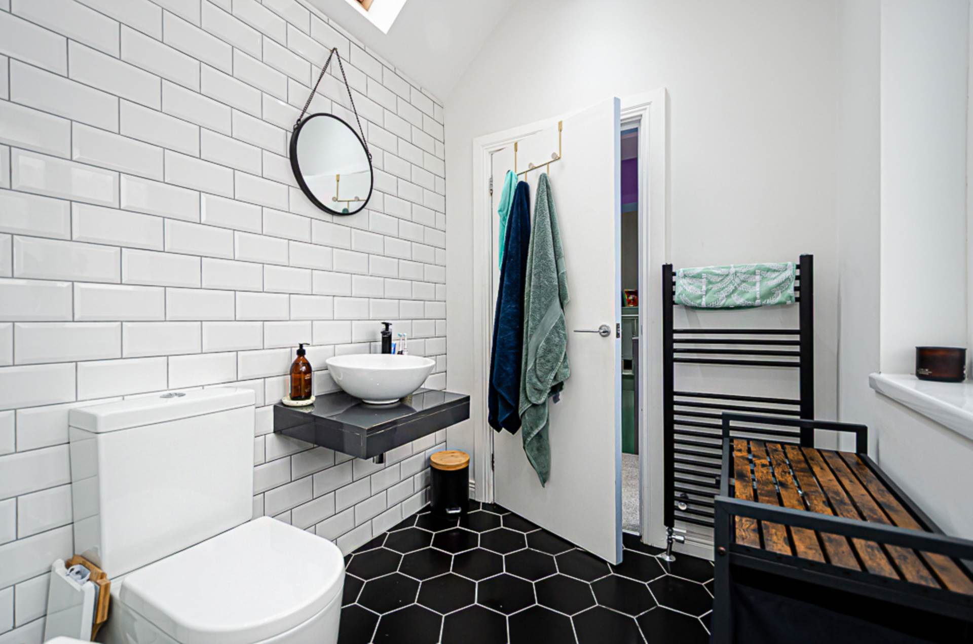 Bedroom 2 - 10'8" (3.25m) x 8'2" (2.49m)LandingShower room - 8'10" (2.69m) x 5'9" (1.75m)Large walk in shower cubicle with black thermostatic shower, dual shower heads, and black framed shower screen, wash hand basin on wall mounted plinth with black mixer tap, W.C., part tiled walls, hexagonal ceramic tiled floor, black towel rail radiator, vaulted ceiling with velux window and extractor fan