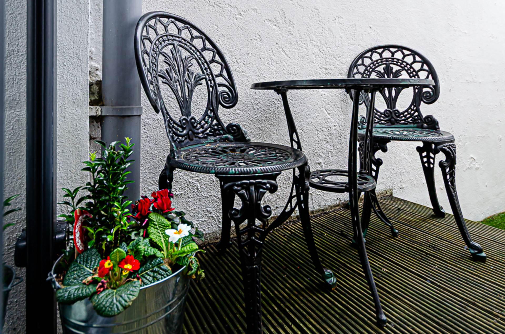 OutsideForecourt and rear yard with raised decking and artificial grass - space for sitting out