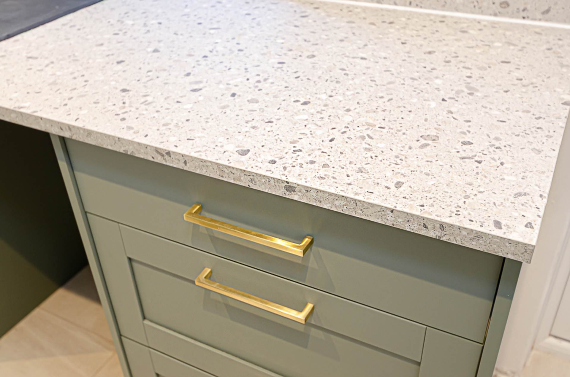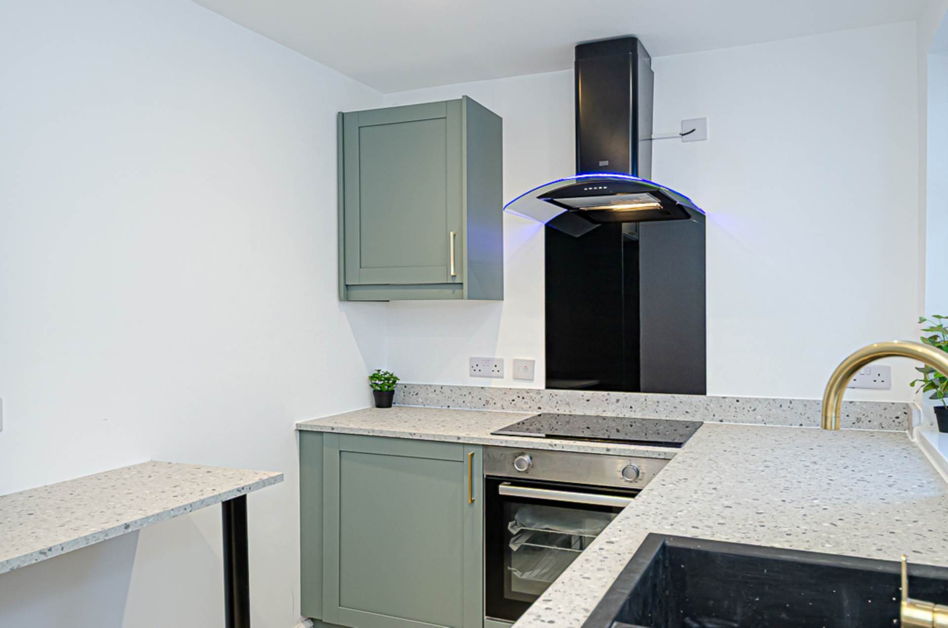 Newly fitted range of high and low level units in green finish, stainless steel oven, ceramic hob, black glass splash back, black and glass extractor canopy, black sink with brass mixer tap, recess for fridge freezer, ceramic tiled floor and recessed spotlights