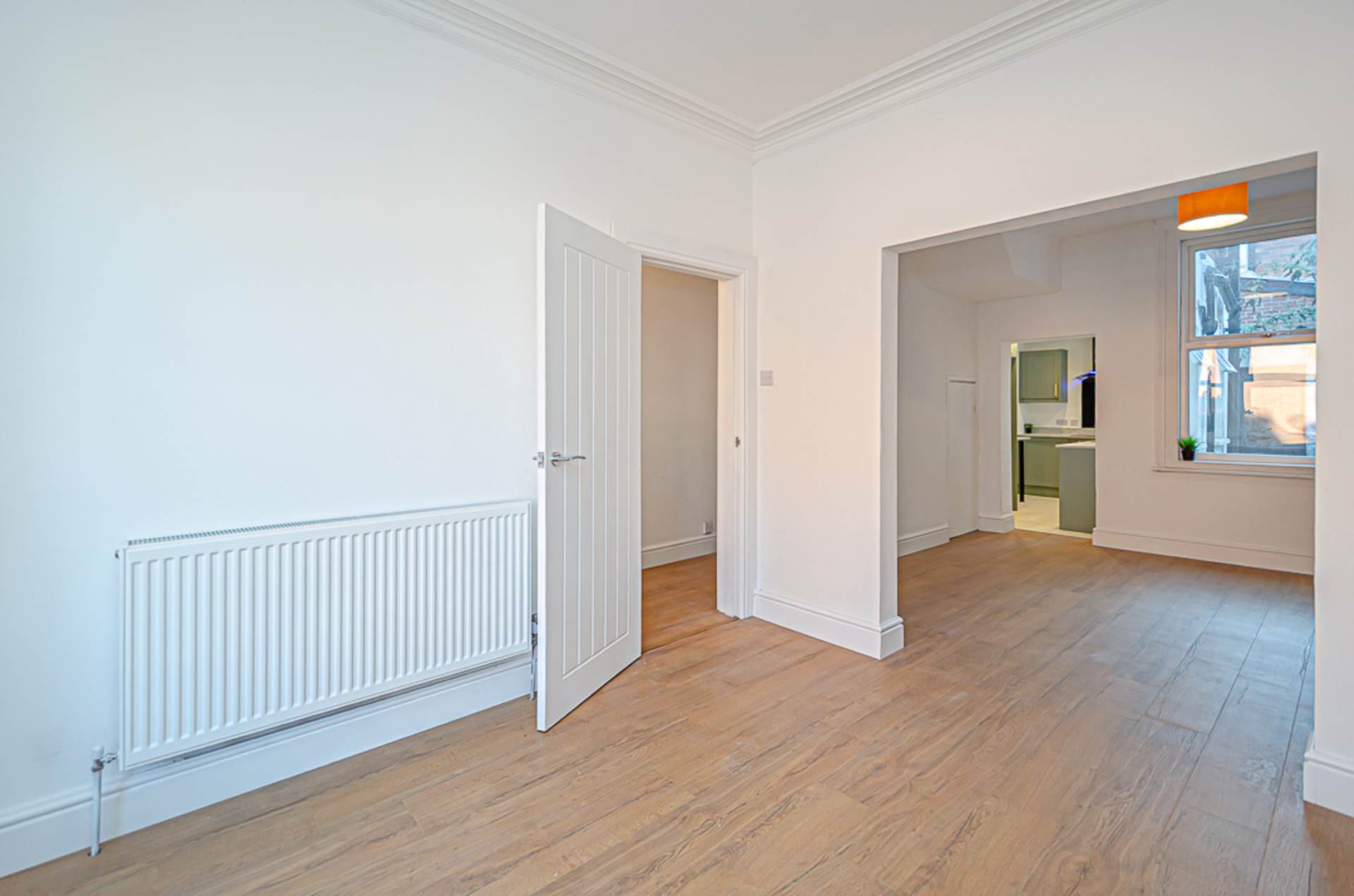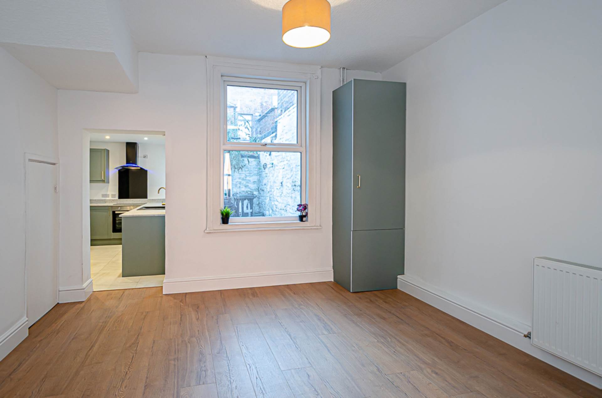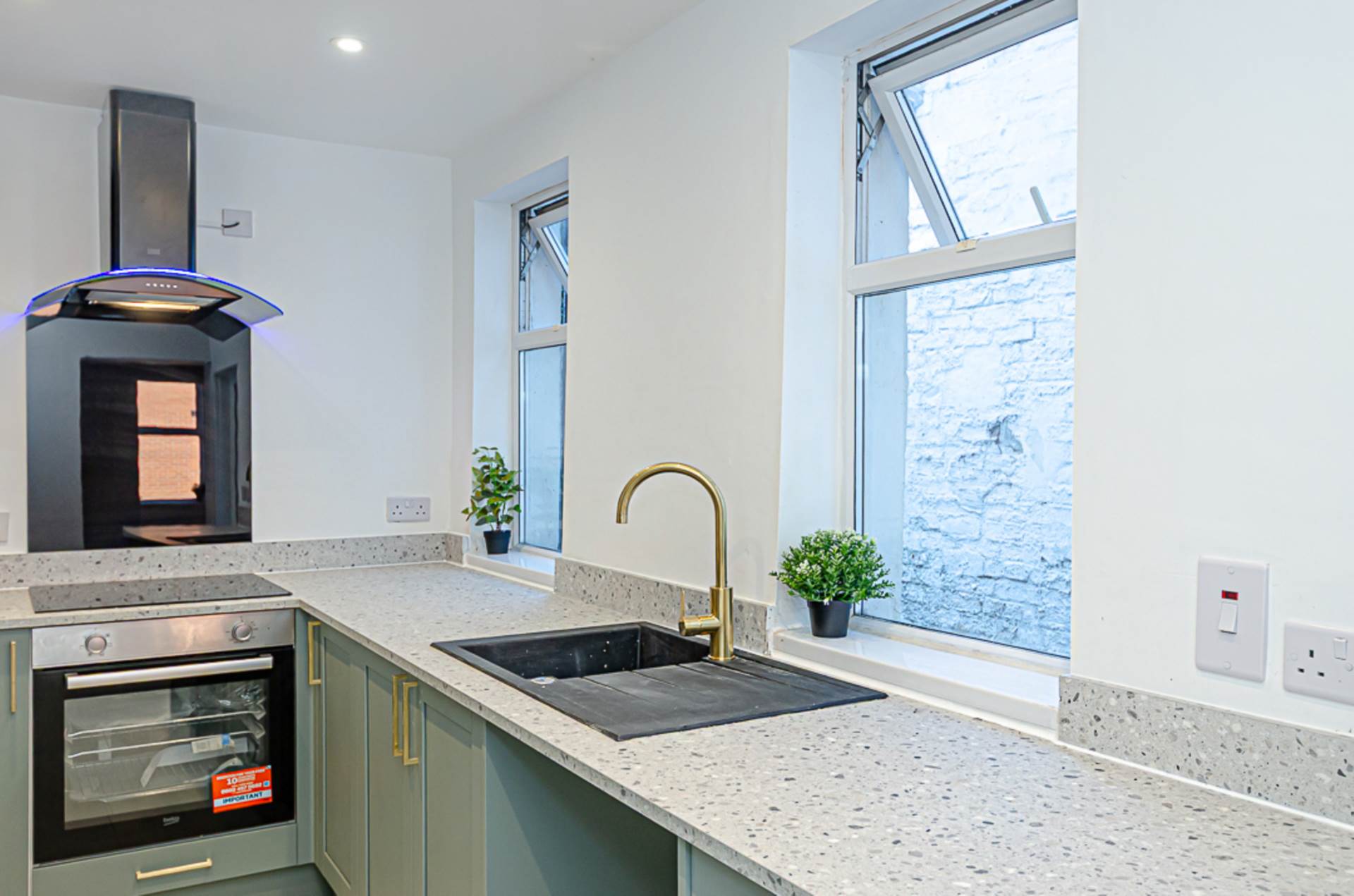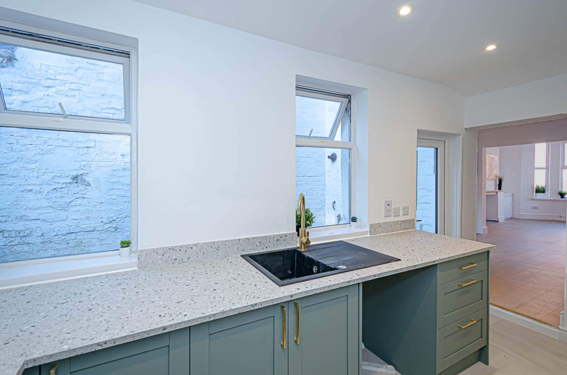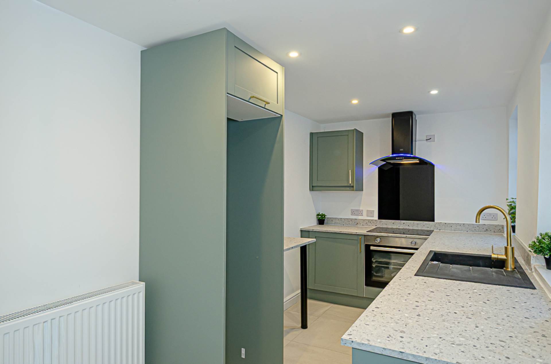 The newly fitted kitchen boasts a fresh green finish and modern fittings, creating a stylish and functional hub for cooking and gatherings. Upstairs, there are two generously sized bedrooms, complemented by a large, contemporary bathroom finished to a high standard.