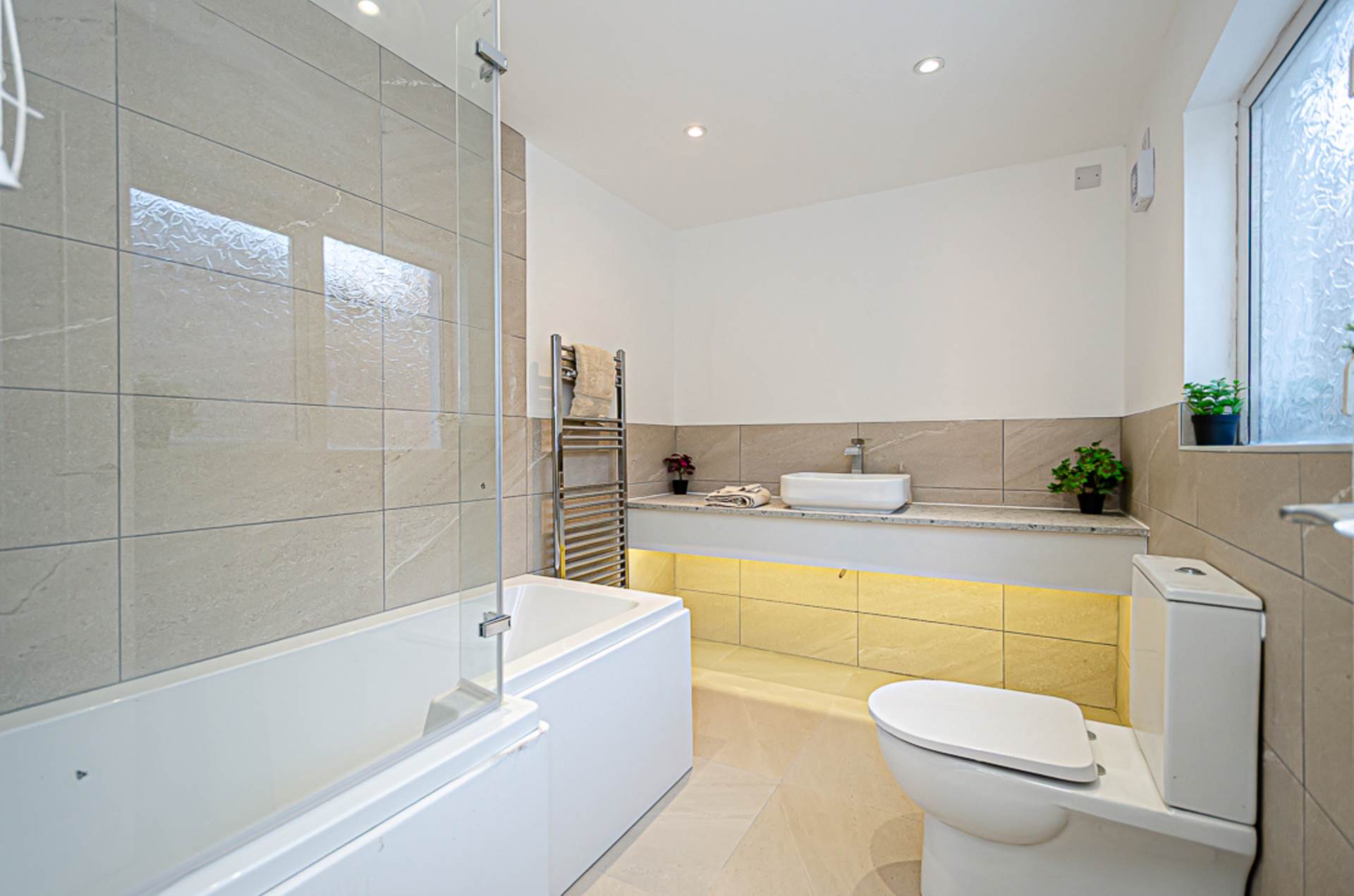 B shaped bath with shower attachment and screen over bath, part tiled walls, wash hand basin on bench with chrome mixer taps, W.C., part tiled walls, ceramic tiled floor, recessed spotlights and extractor fan
