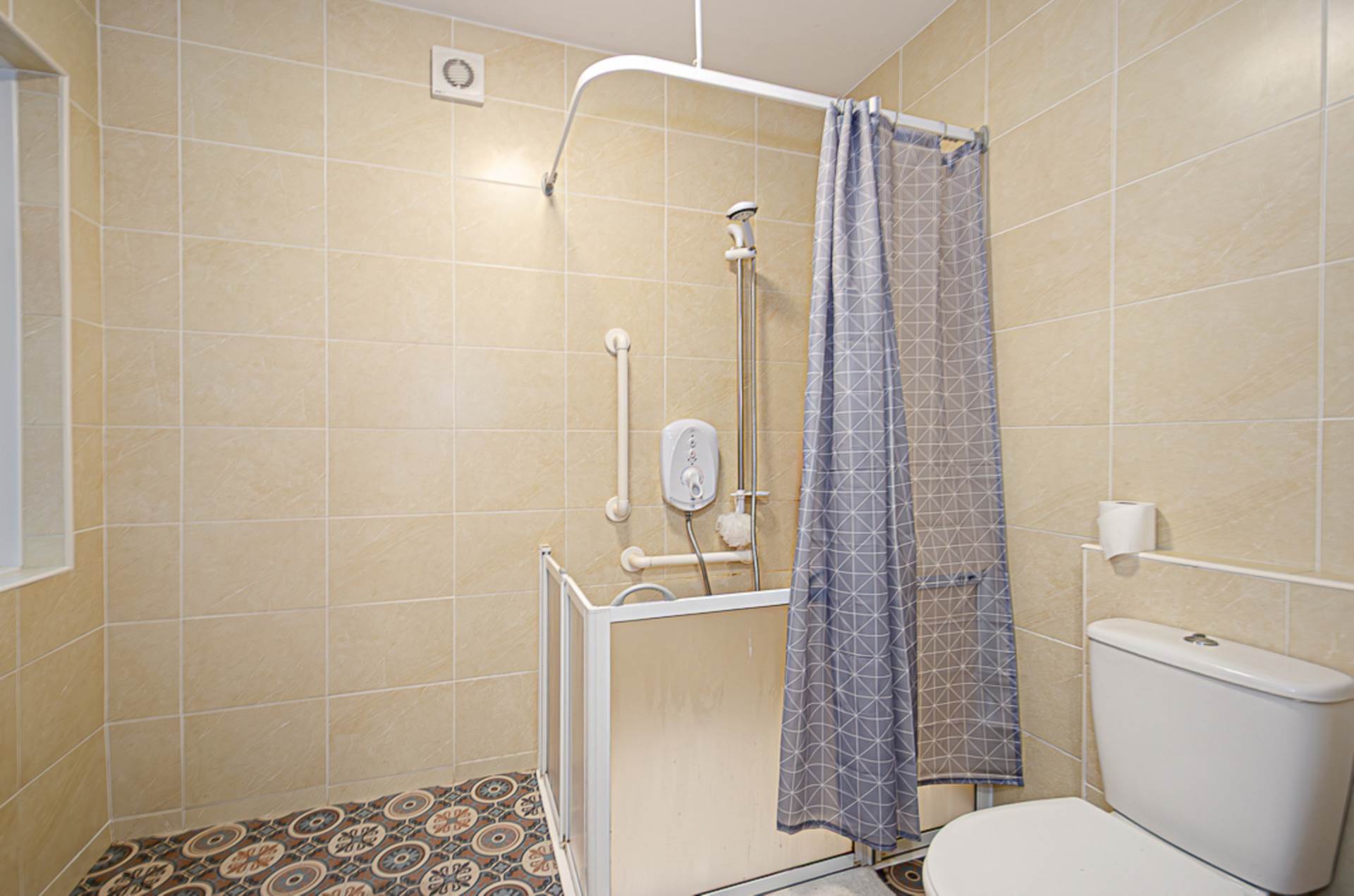 Easy access shower with electric shower, wash hand basin in vanity unit, W.C., modern tiled walls, and extractor fan