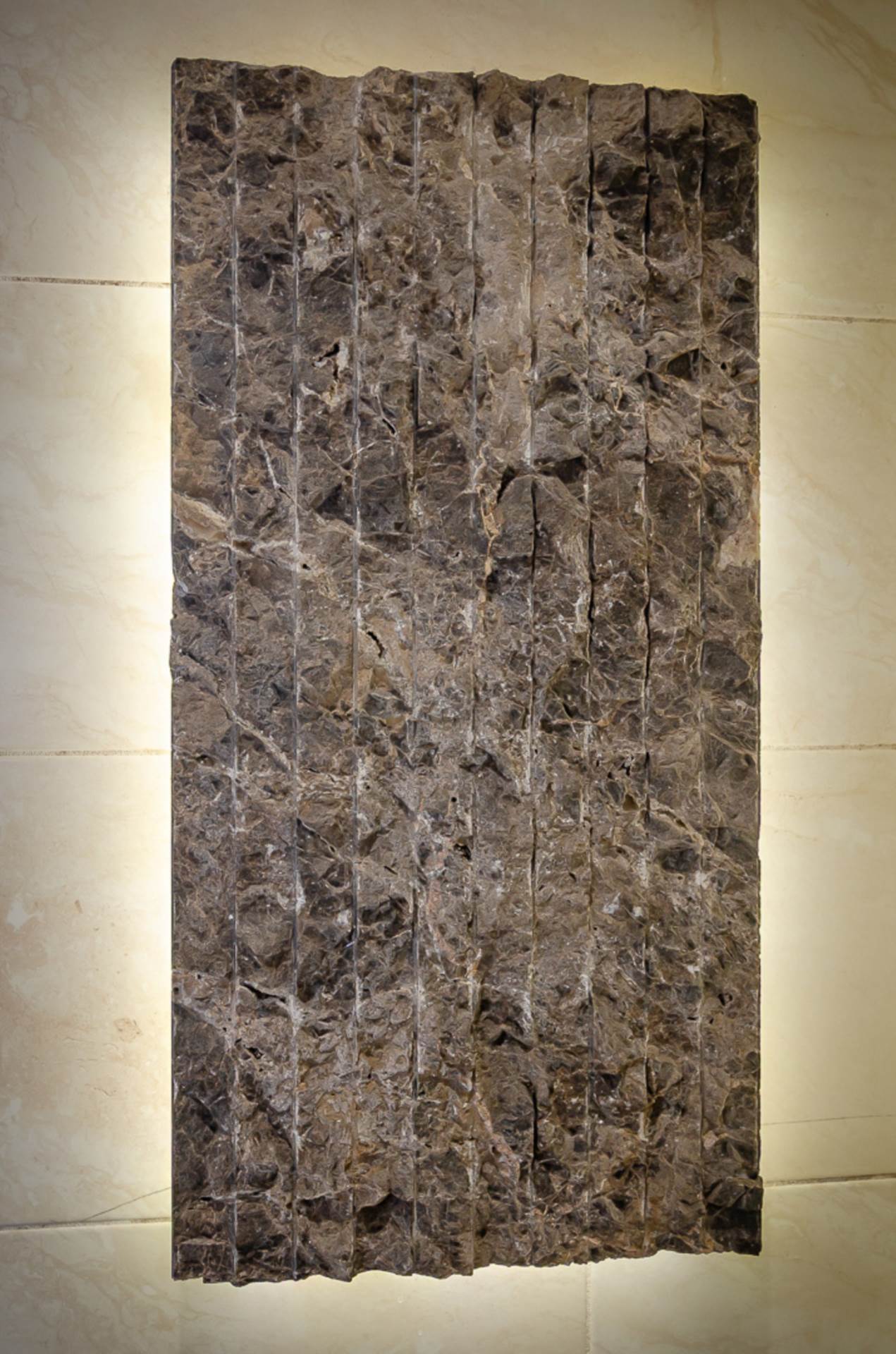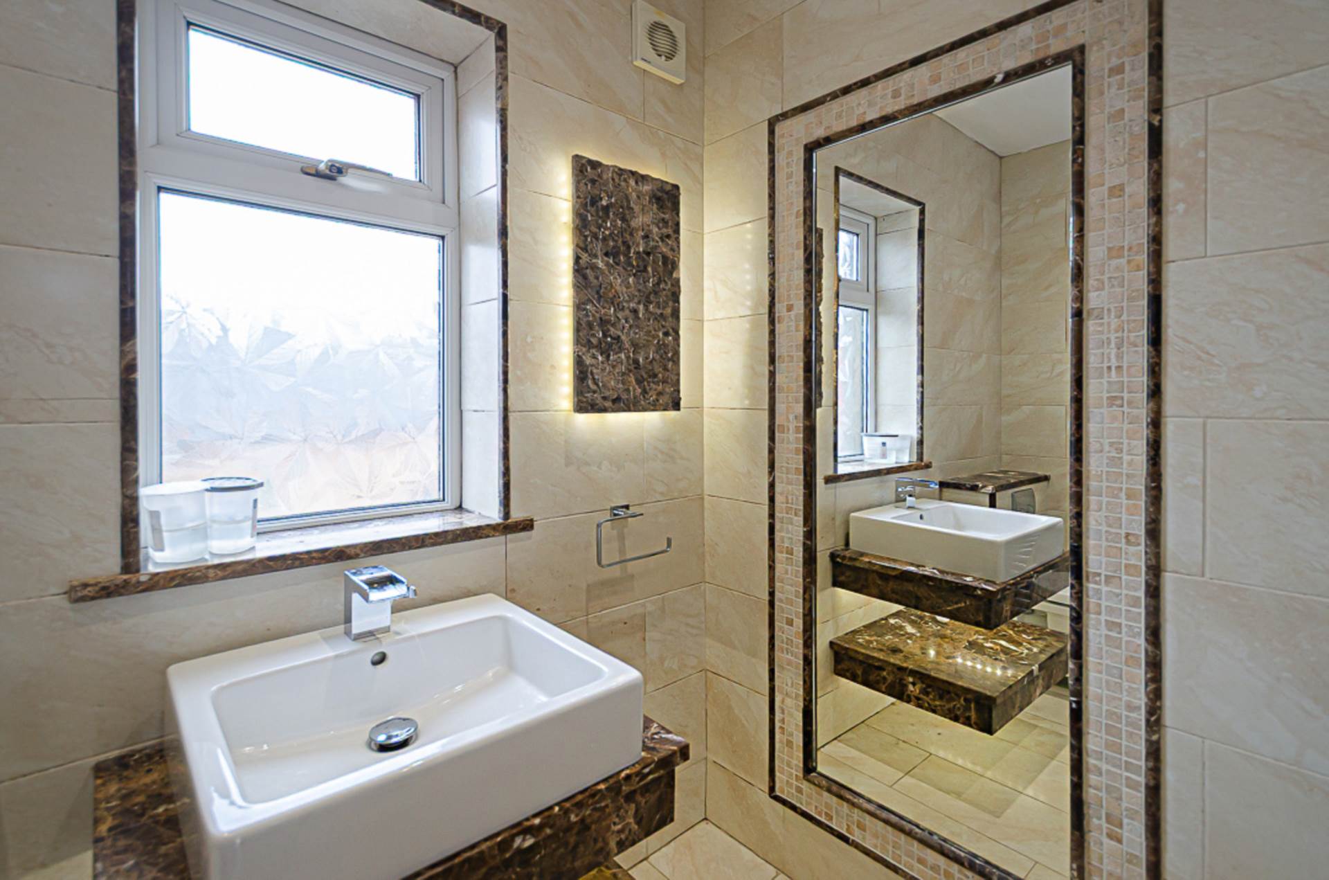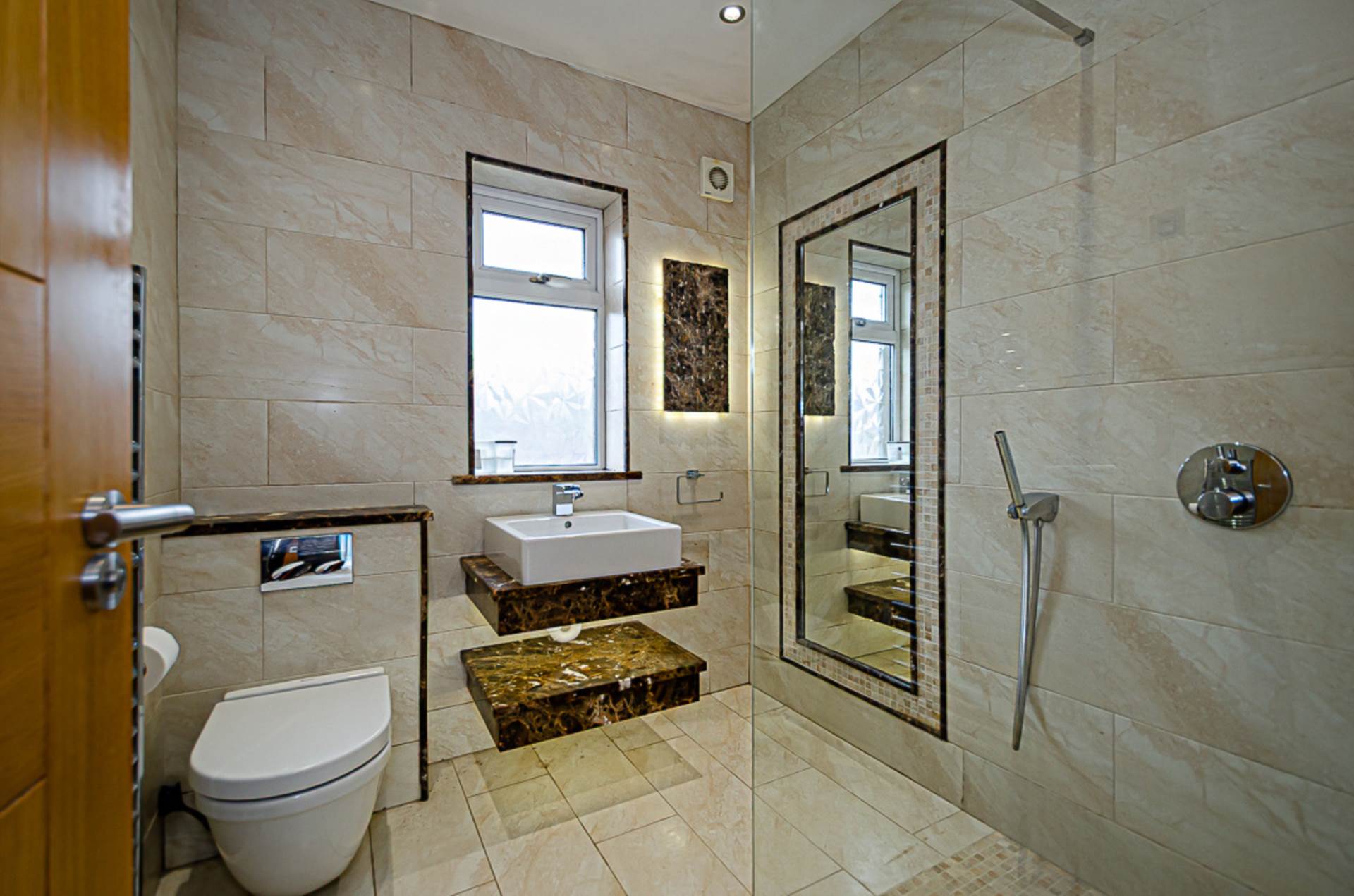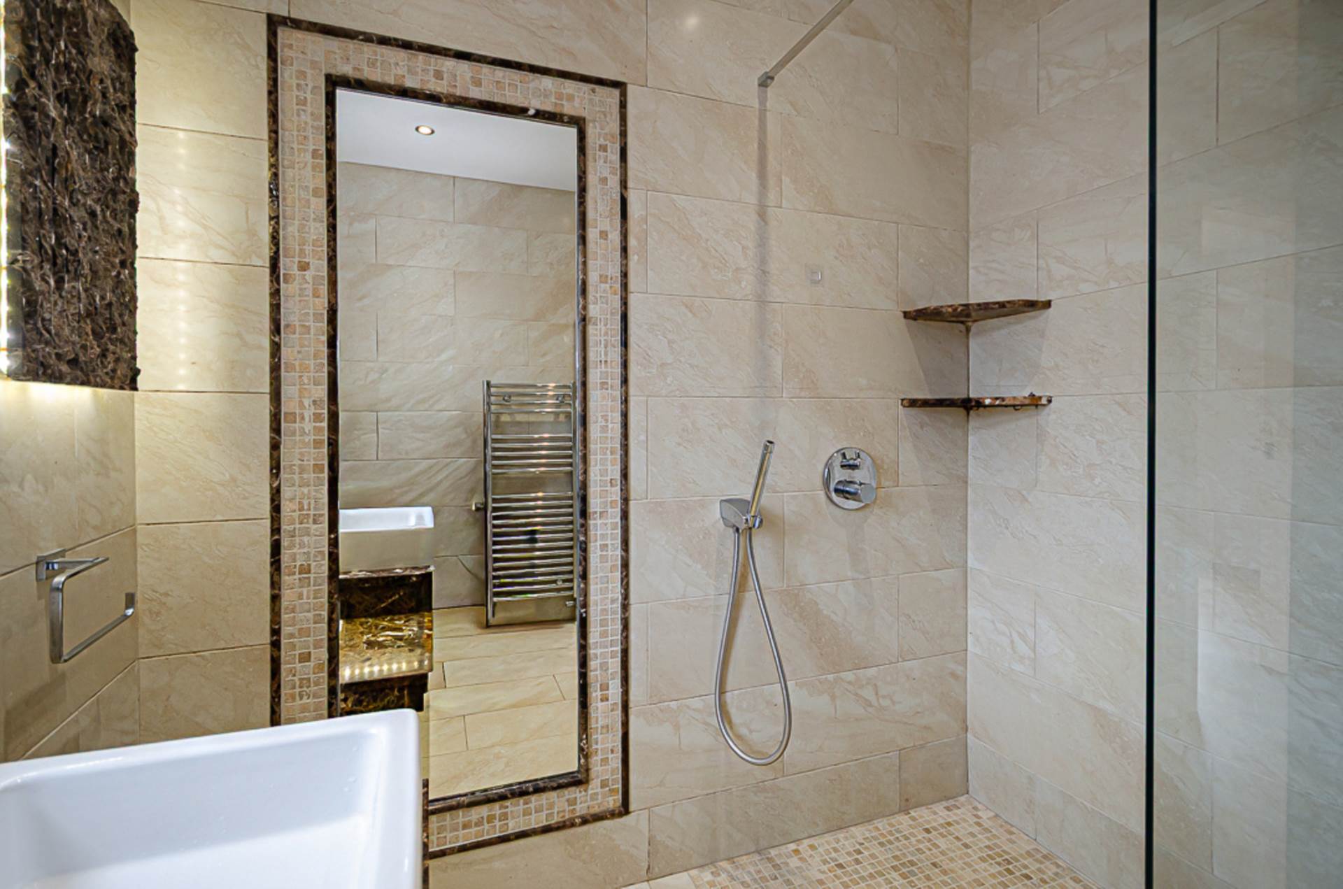 Walk in shower cubicle with thermostatic shower, rainfall shower head and separate attachment, wash hand basin on stone plinth with stone shelf below, W.C. with concealed cistern, fully modern tiled walls, ceramic tiled floor, large built in mirrored, chrome towel rail radiator, recessed spotlights and extractor fan