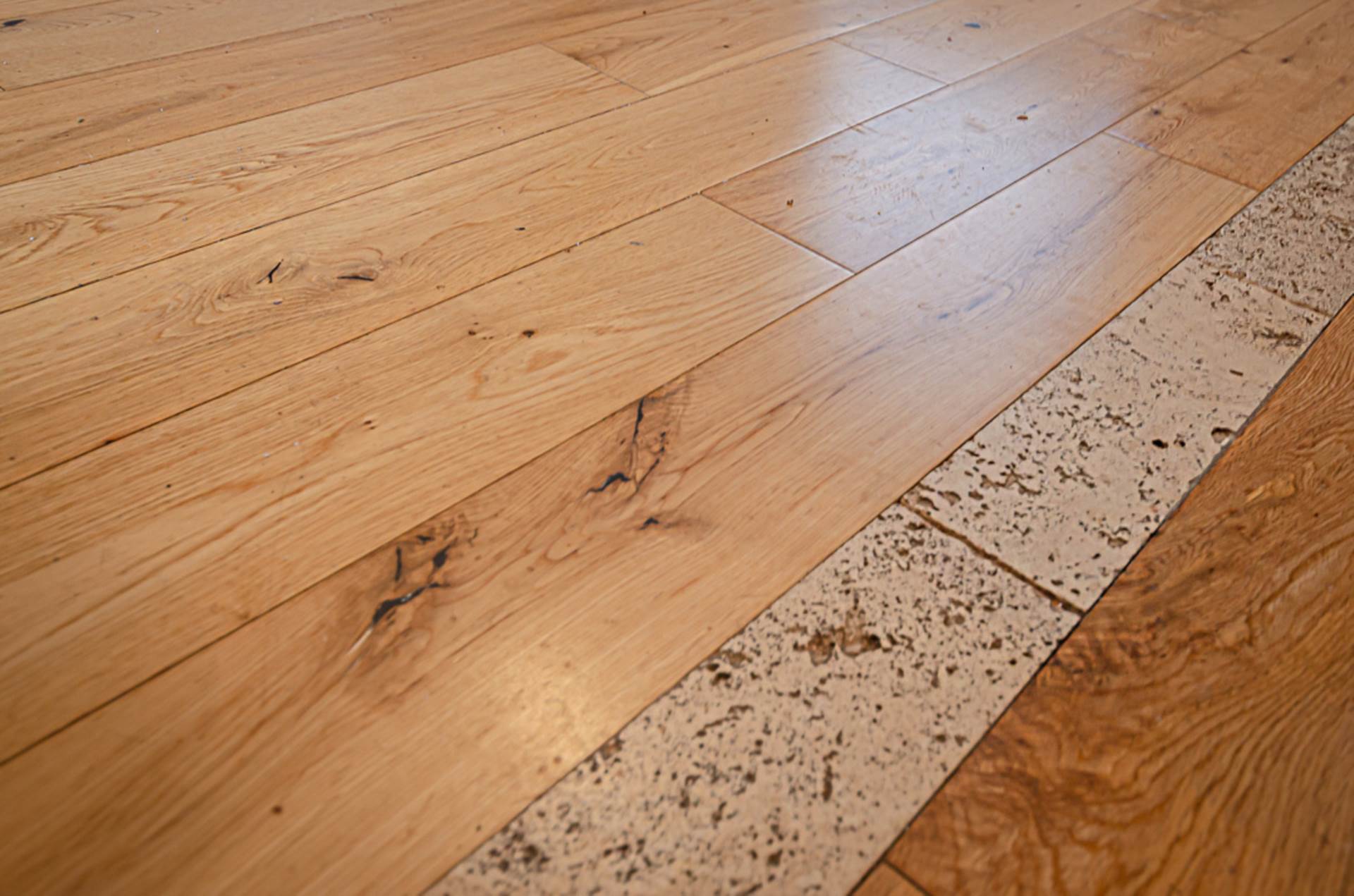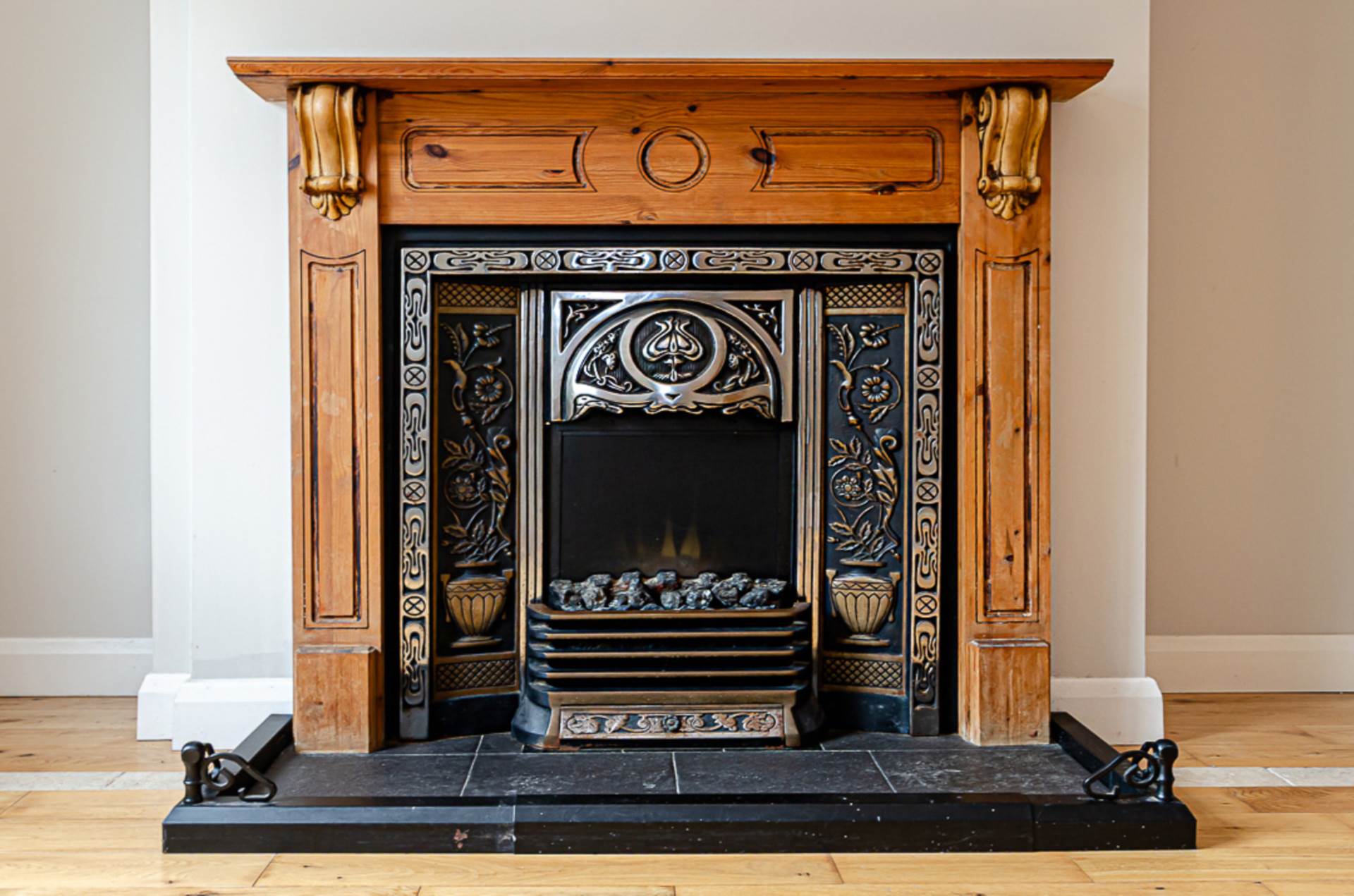 Feature fireplace with timber surround, cast iron inset and tiled hearth, and statement solid timber floor with ceramic tile detailing