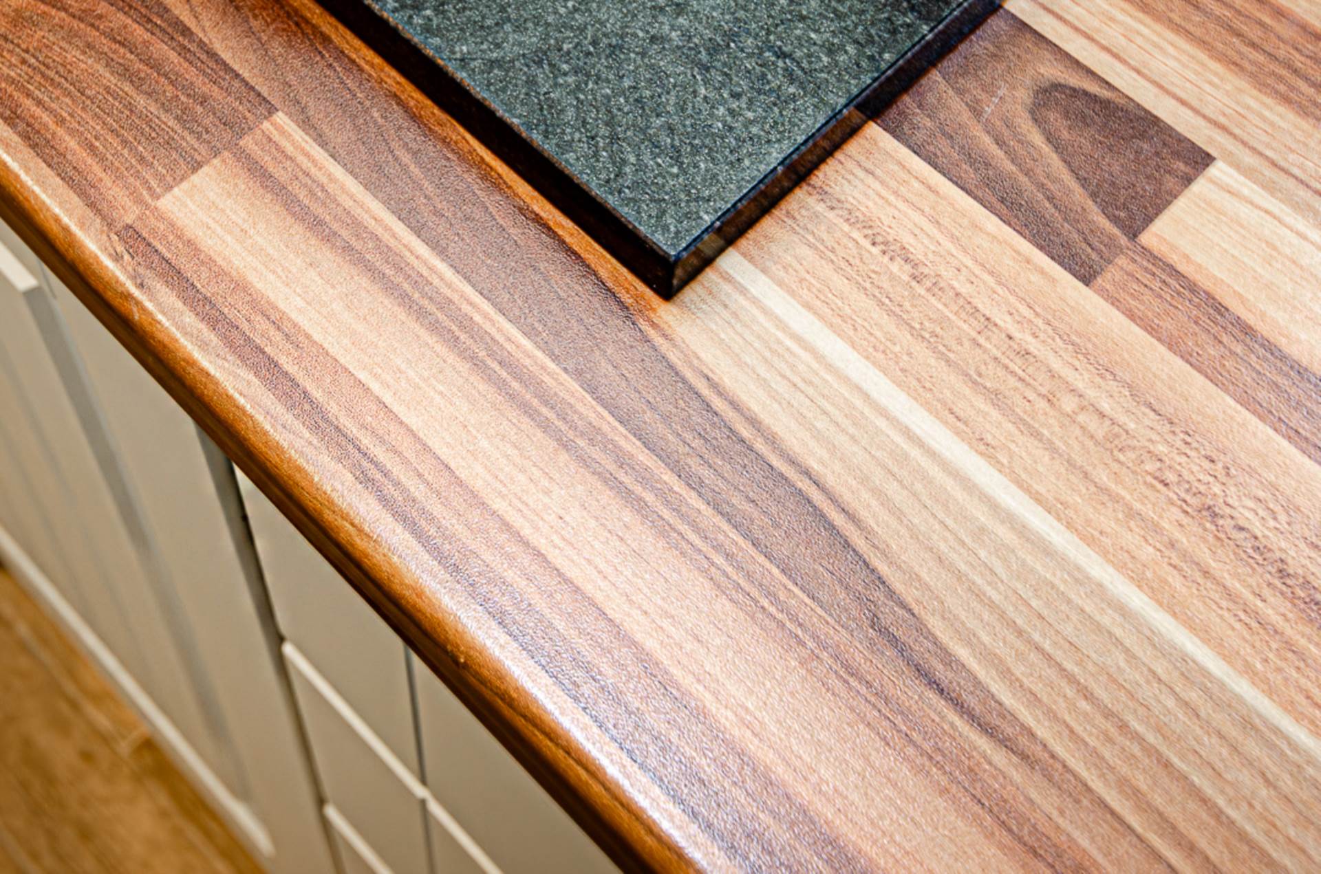 Range of high and low level fitted units, stainless steel extractor fan, part tiled walls, wine rack, spotlights, and space for small dining table