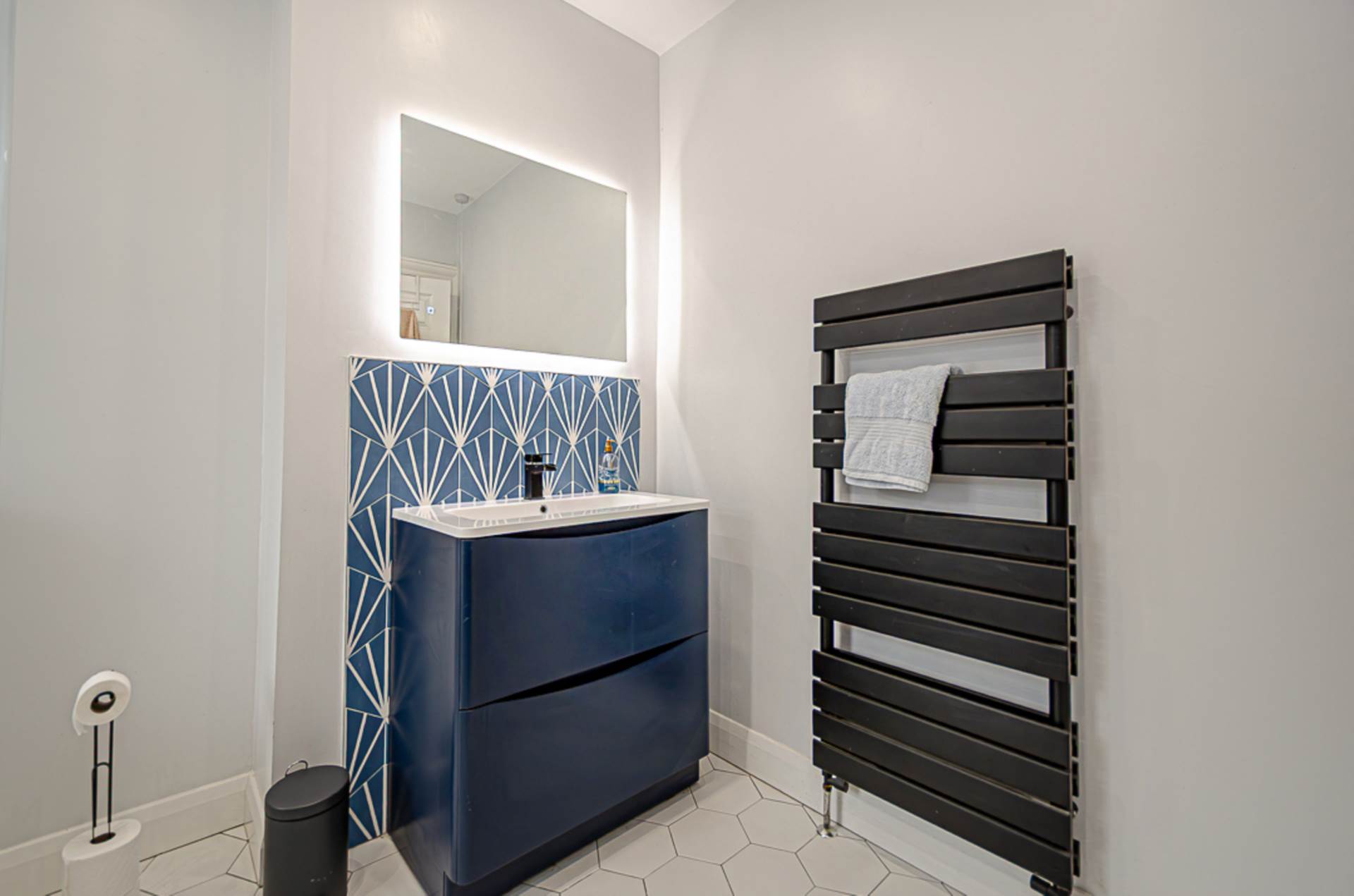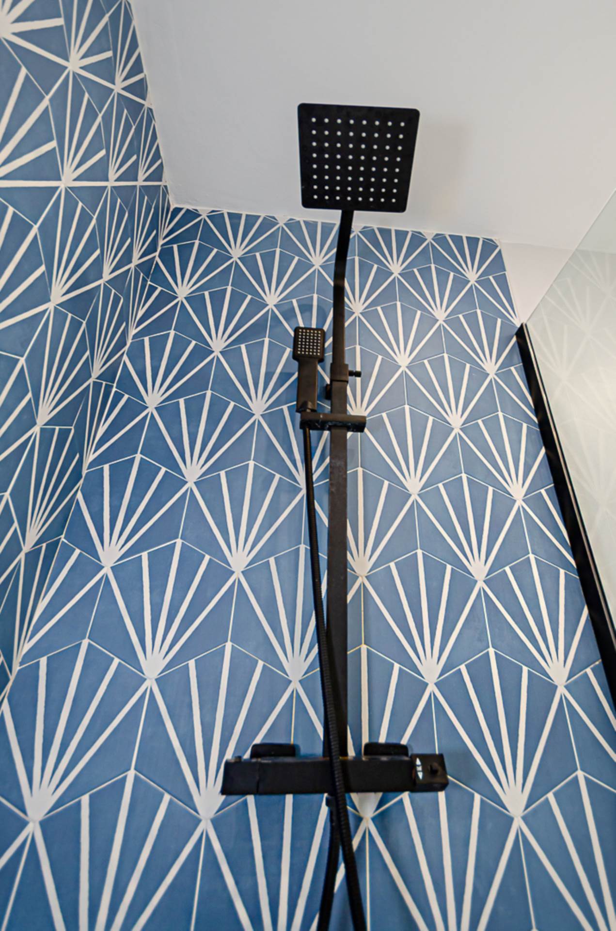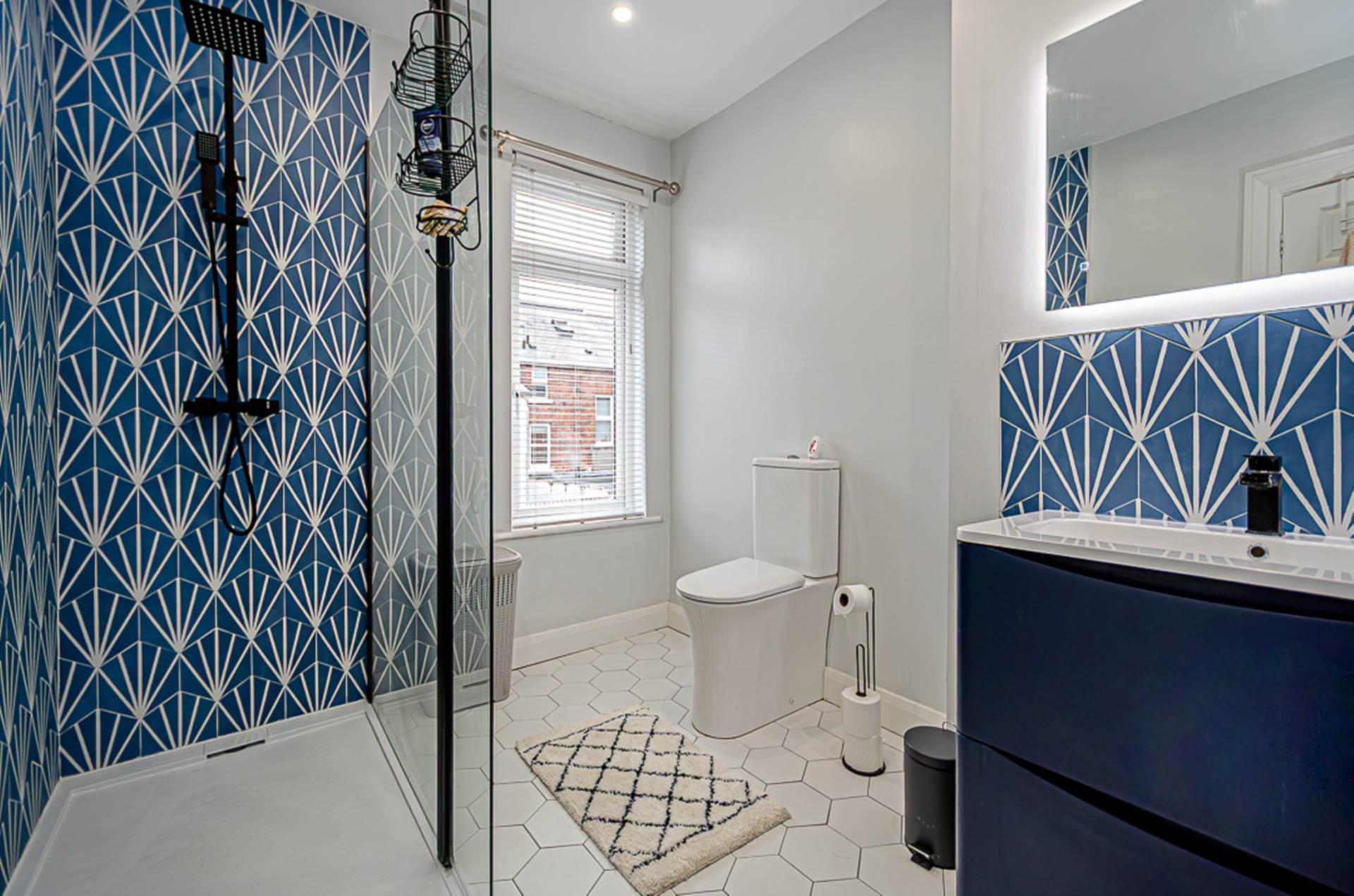 Large walk in shower enclosure with black thermostatic shower, dual shower heads, wash hand basin in navy two drawer vanity with black mixer tap, W.C., decorative wall tiling, black towel rail radiator, LED mirror and recessed spotlights