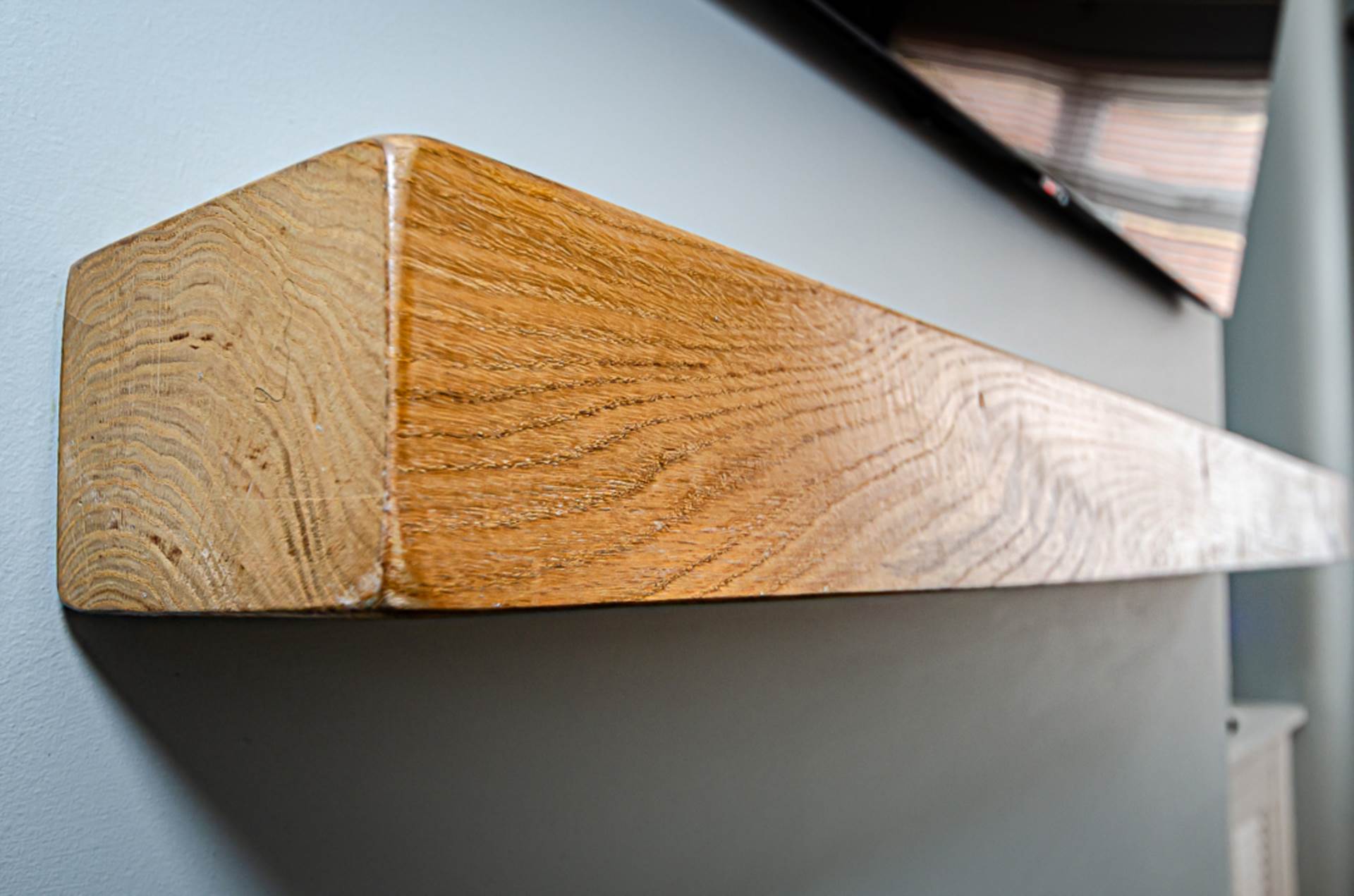 Bay window, hole in the wall fireplace with timber mantle, LVT flooring, cornice, ceiling rose and storage under stairs