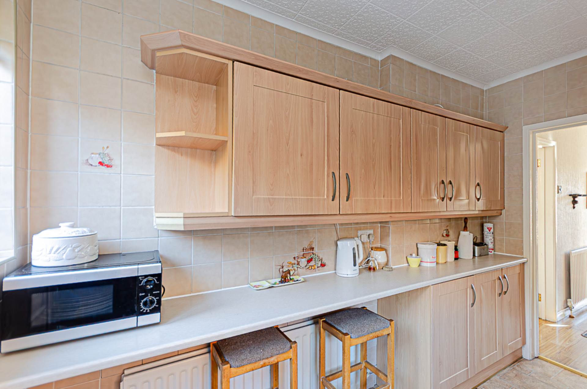 Range of high and low level units, breakfast bar, tiled walls and extractor fan
