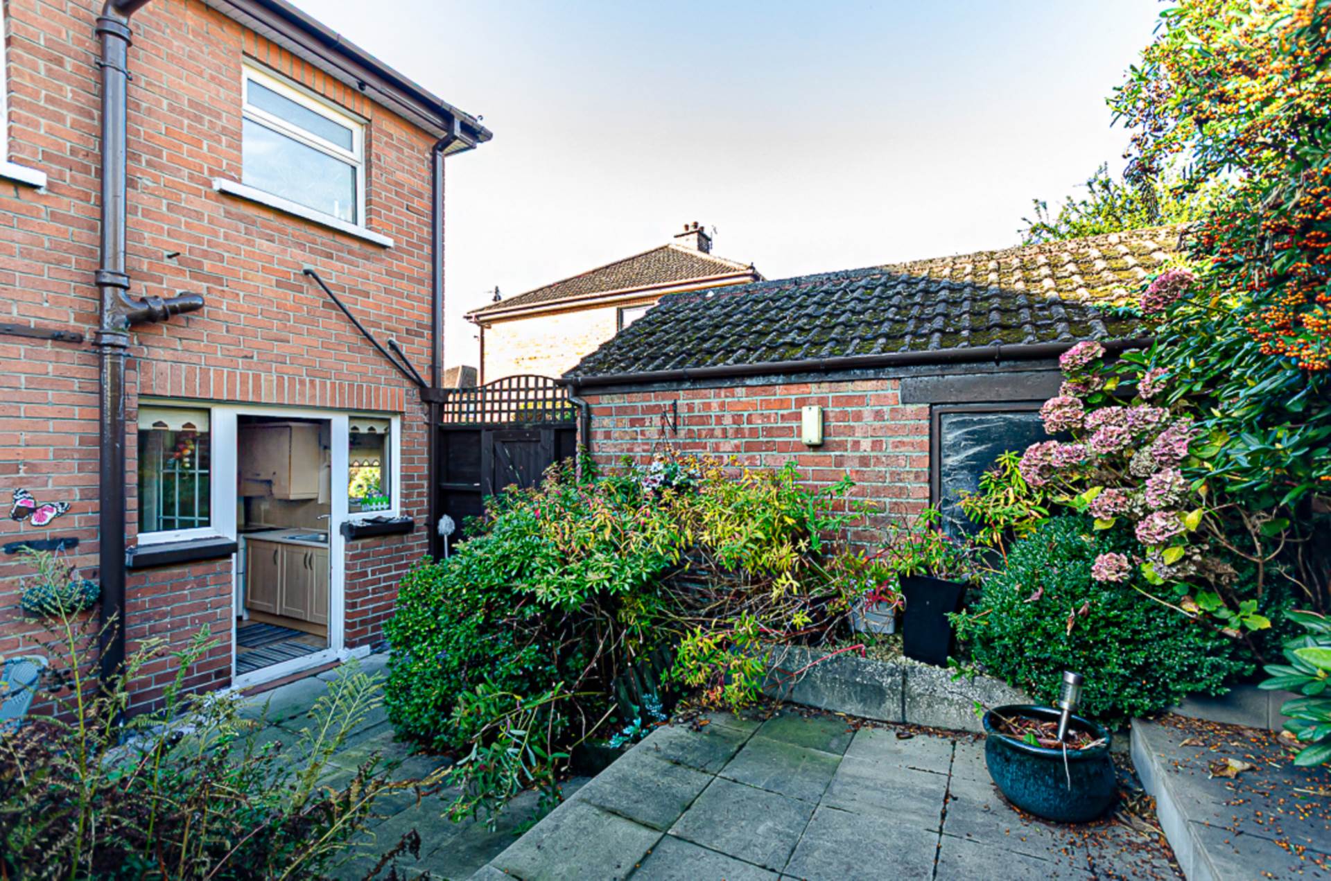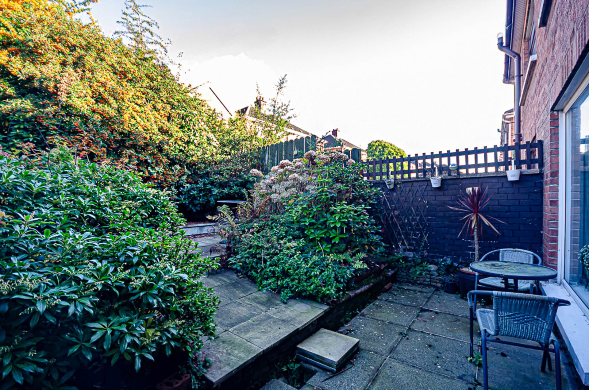 Front garden in artificial grass, small stones with shrub beds. Paved driveway and side garden in lawn and shrubs. Stepped rear garden in paving, shrubs and trees