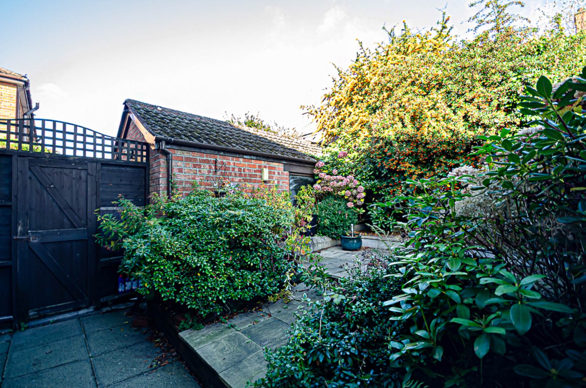 Externally, the home enjoys front, side, and rear gardens, offering excellent outdoor space for recreation or gardening enthusiasts. A detached red brick garage provides additional storage or secure parking.