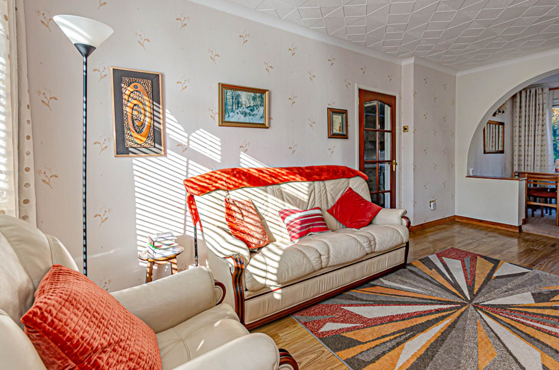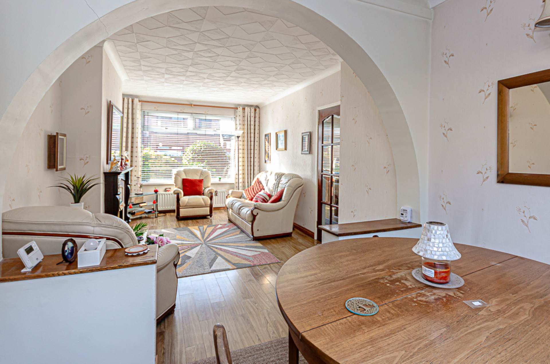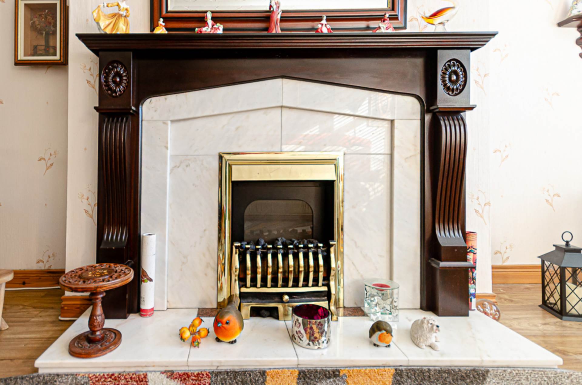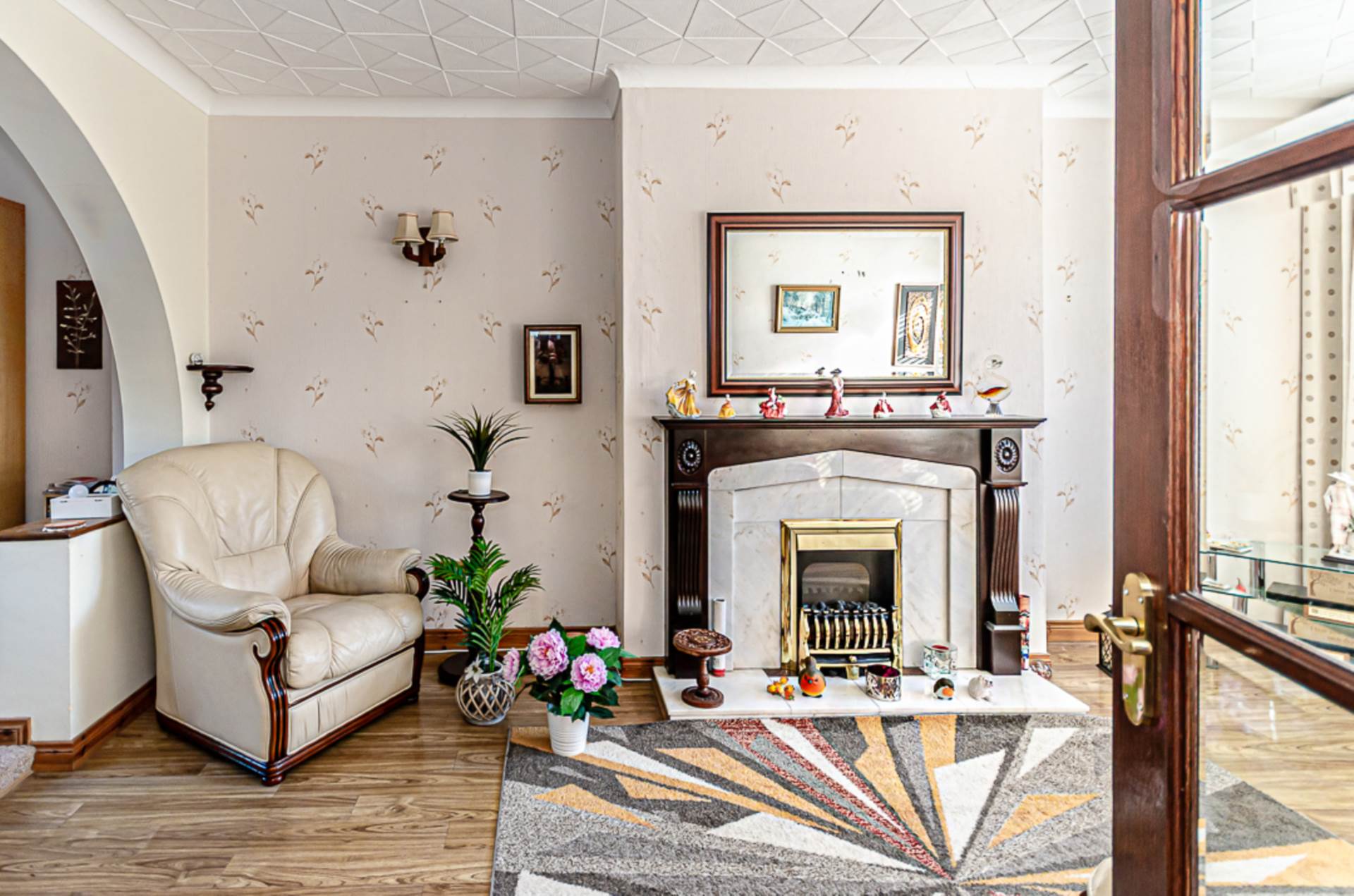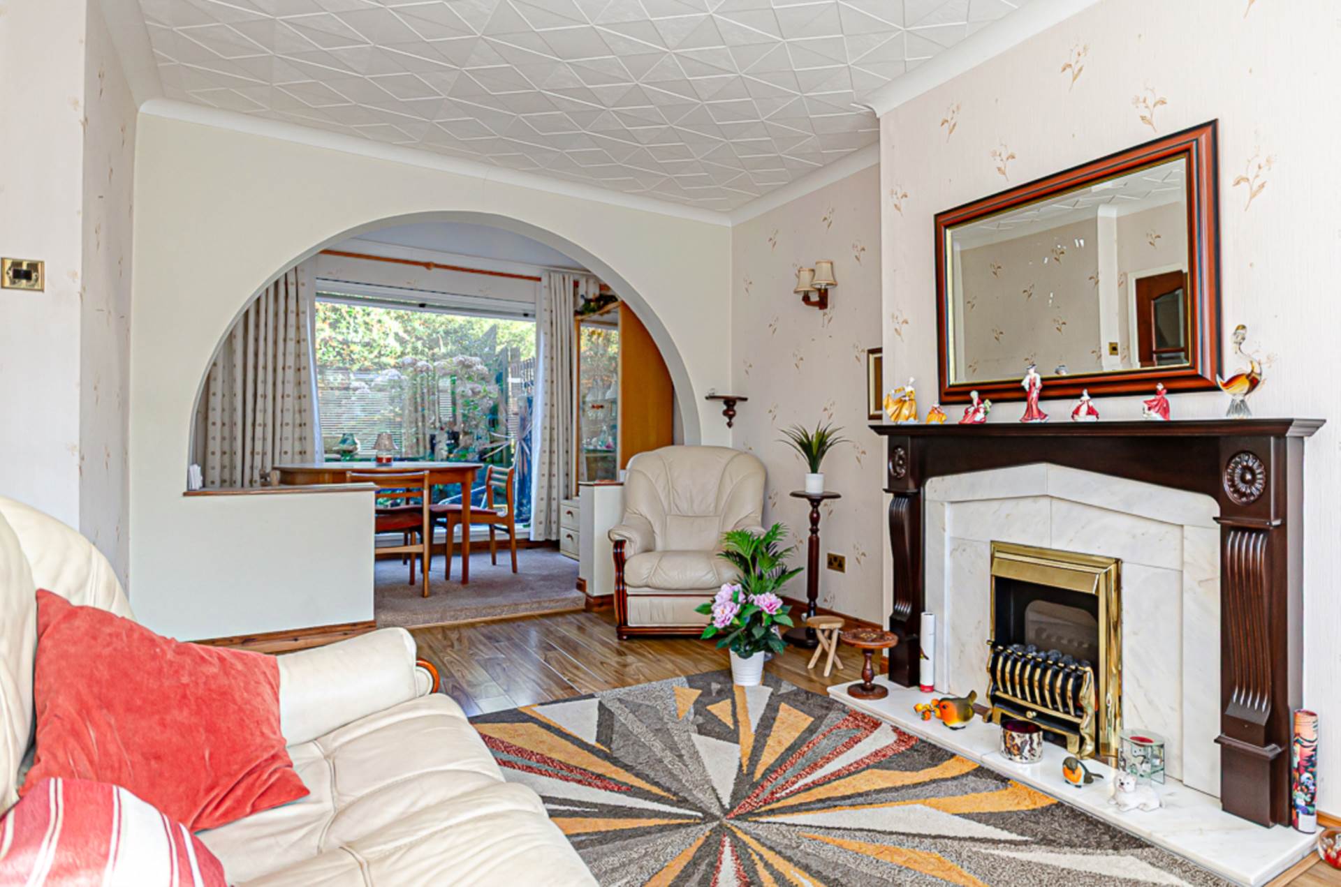 Feature fireplace with timber surround and marble hearth, and archway to raised dining area