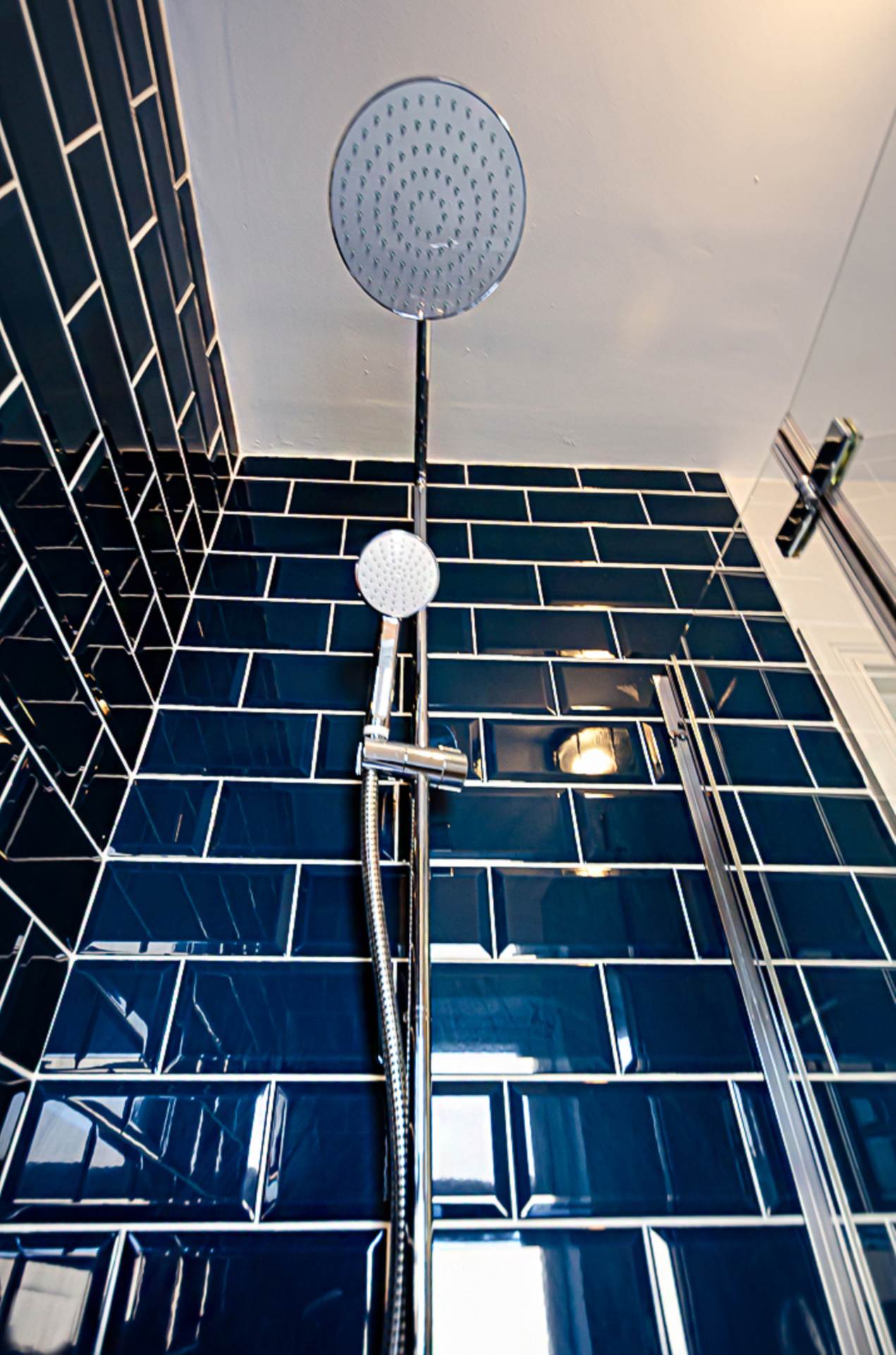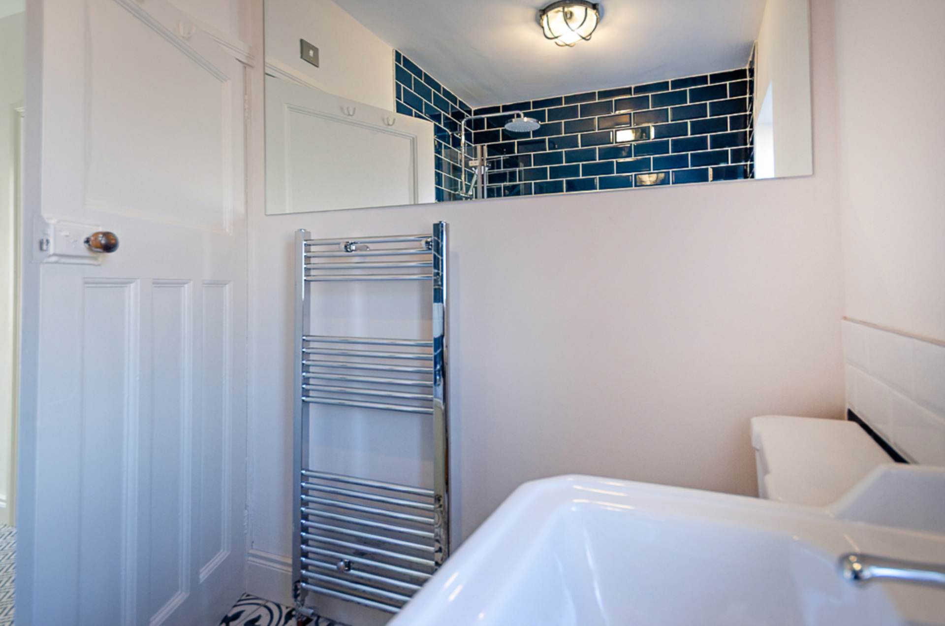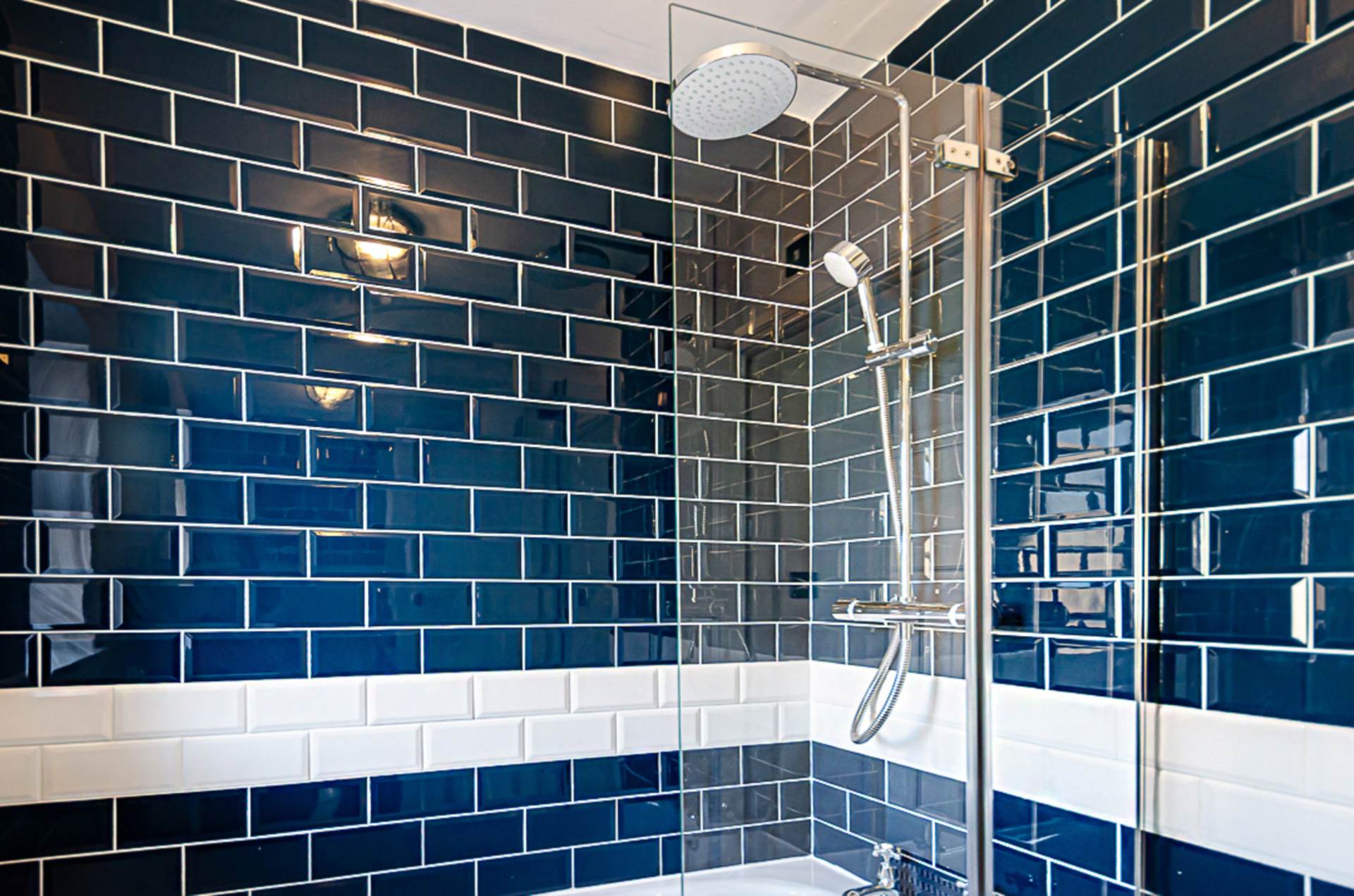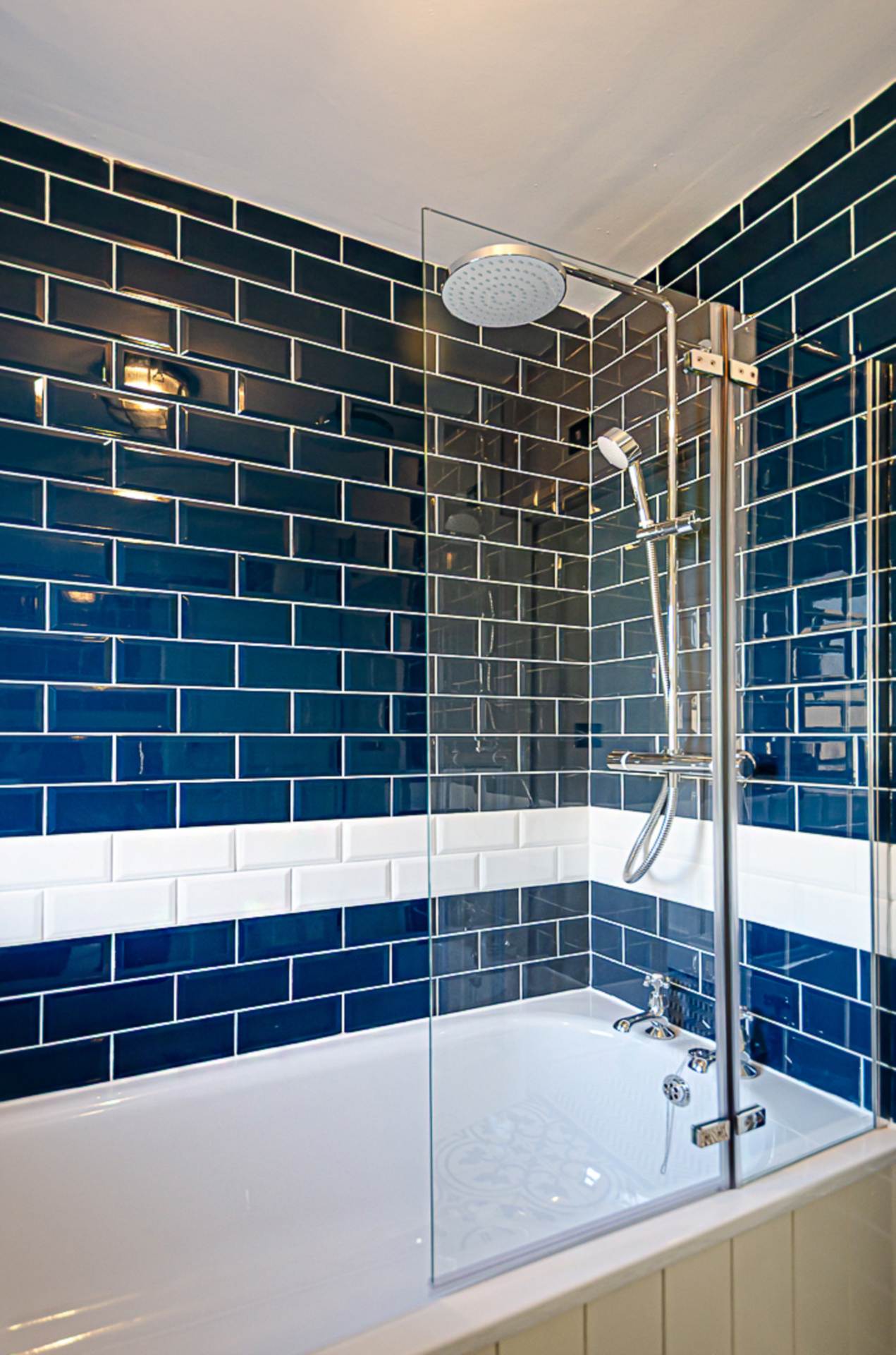 Bathroom - 5'6" (1.68m) x 5'5" (1.65m)Traditional style bathroom - bath with thermostatic shower, dual shower heads, and screen, pedestal wash hand basin, W.C., part tiled walls in navy and white, chrome towel rail radiator, and antique style light