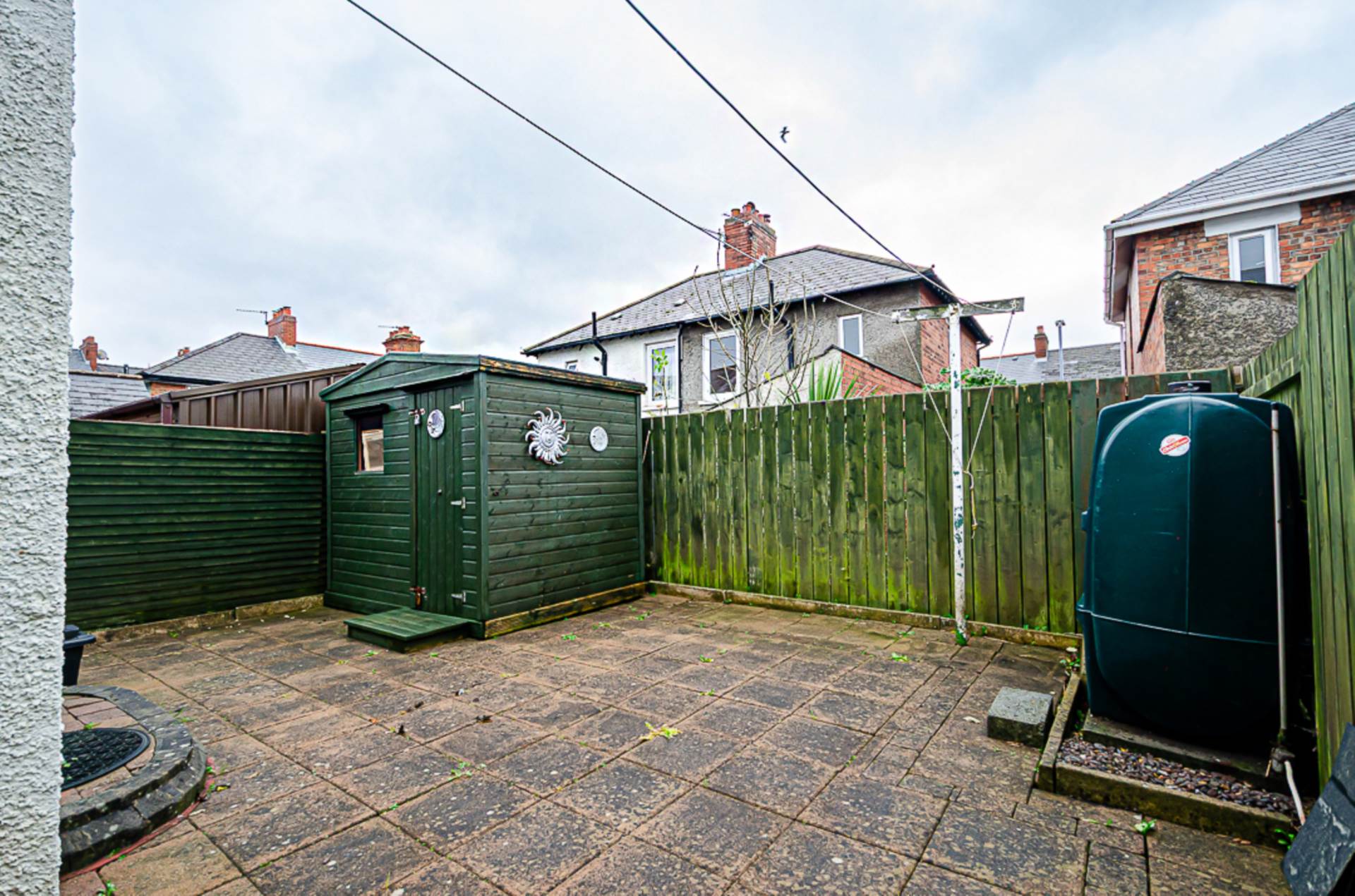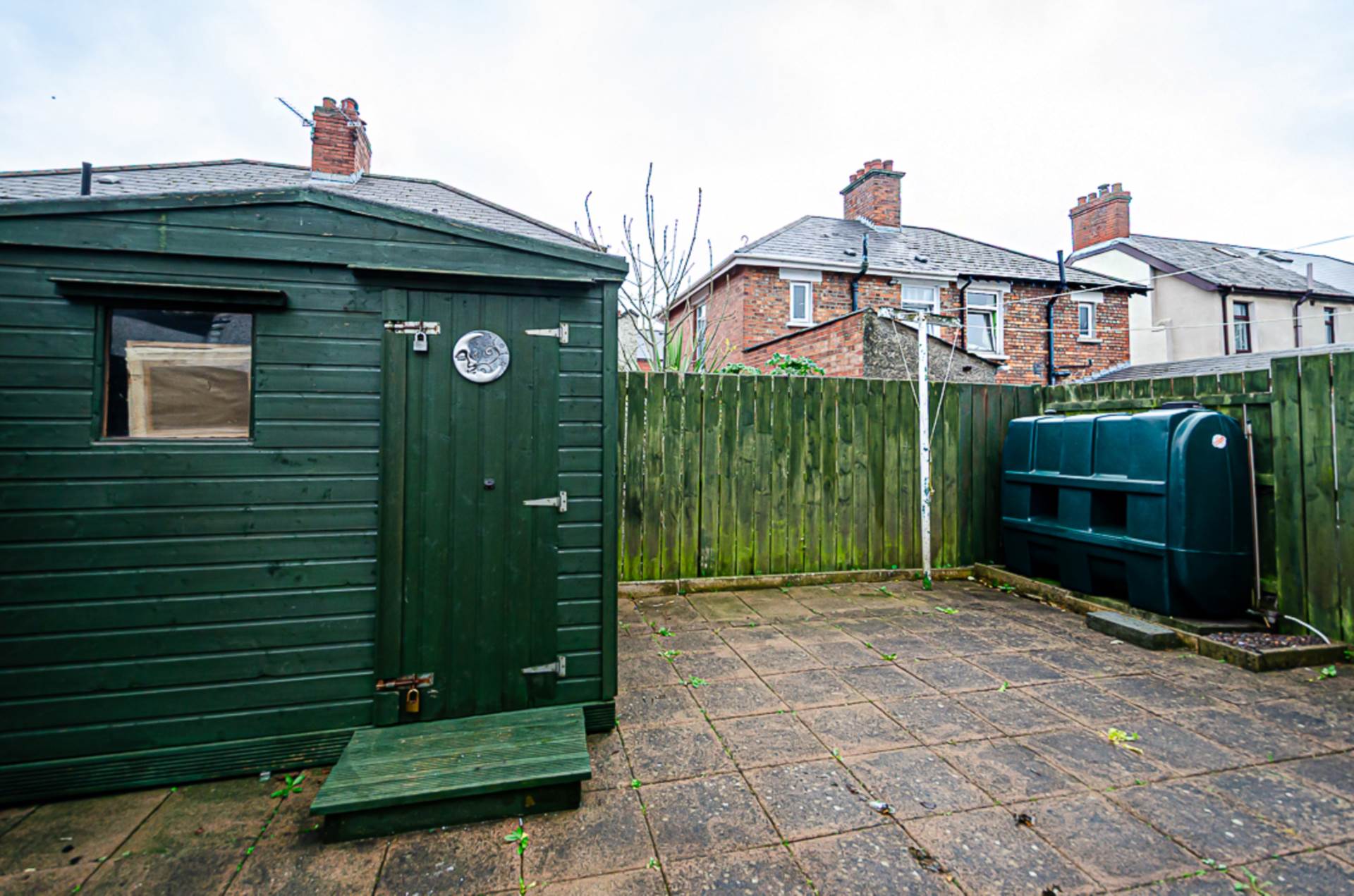 Front garden in paving and small stones with paved path to side. Rear garden in paving with garden shed, oil fired boiler in housing and oil storage tank