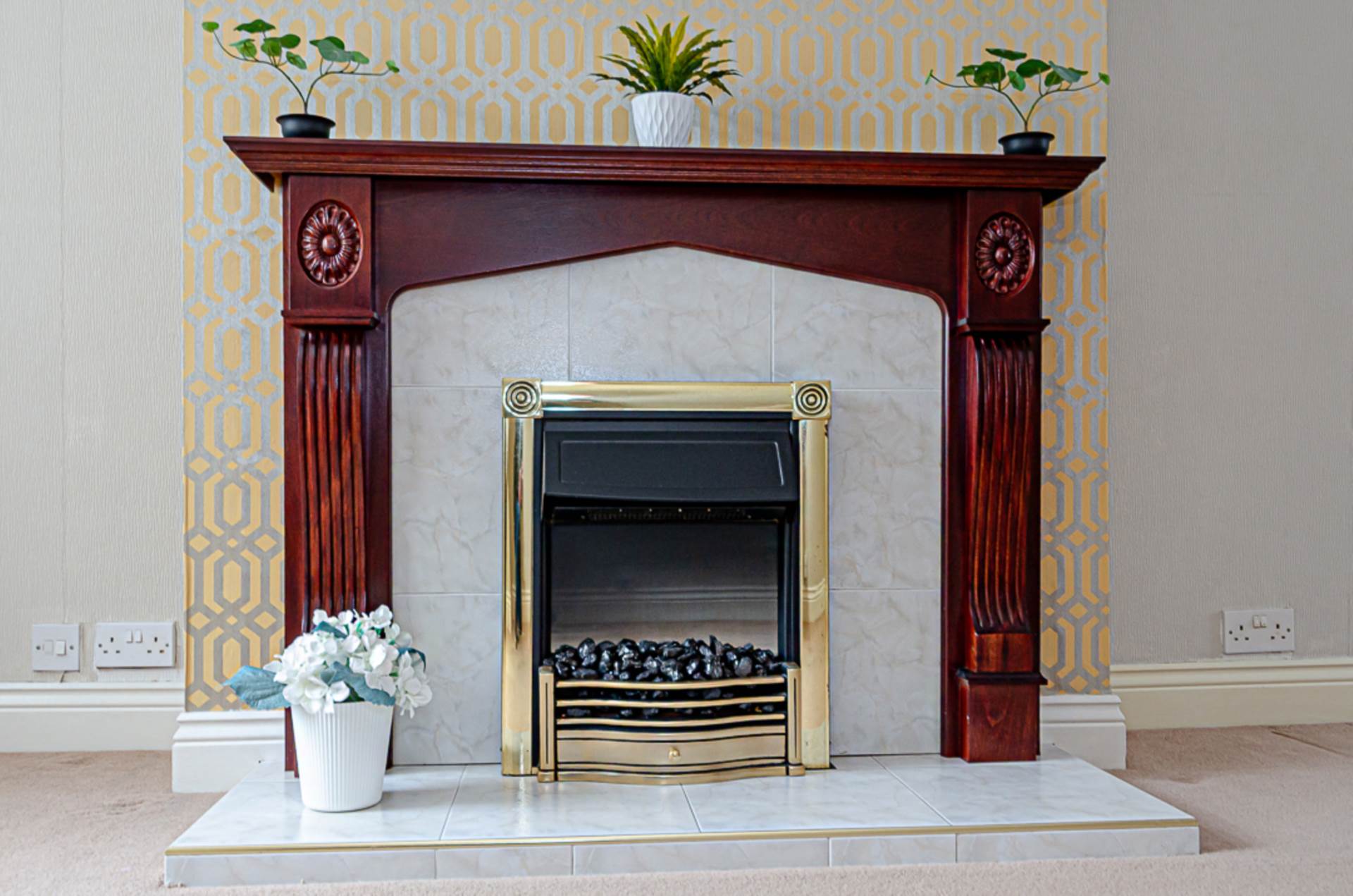 Bay window and feature fireplace with timber surround, tiled hearth and electric inset
