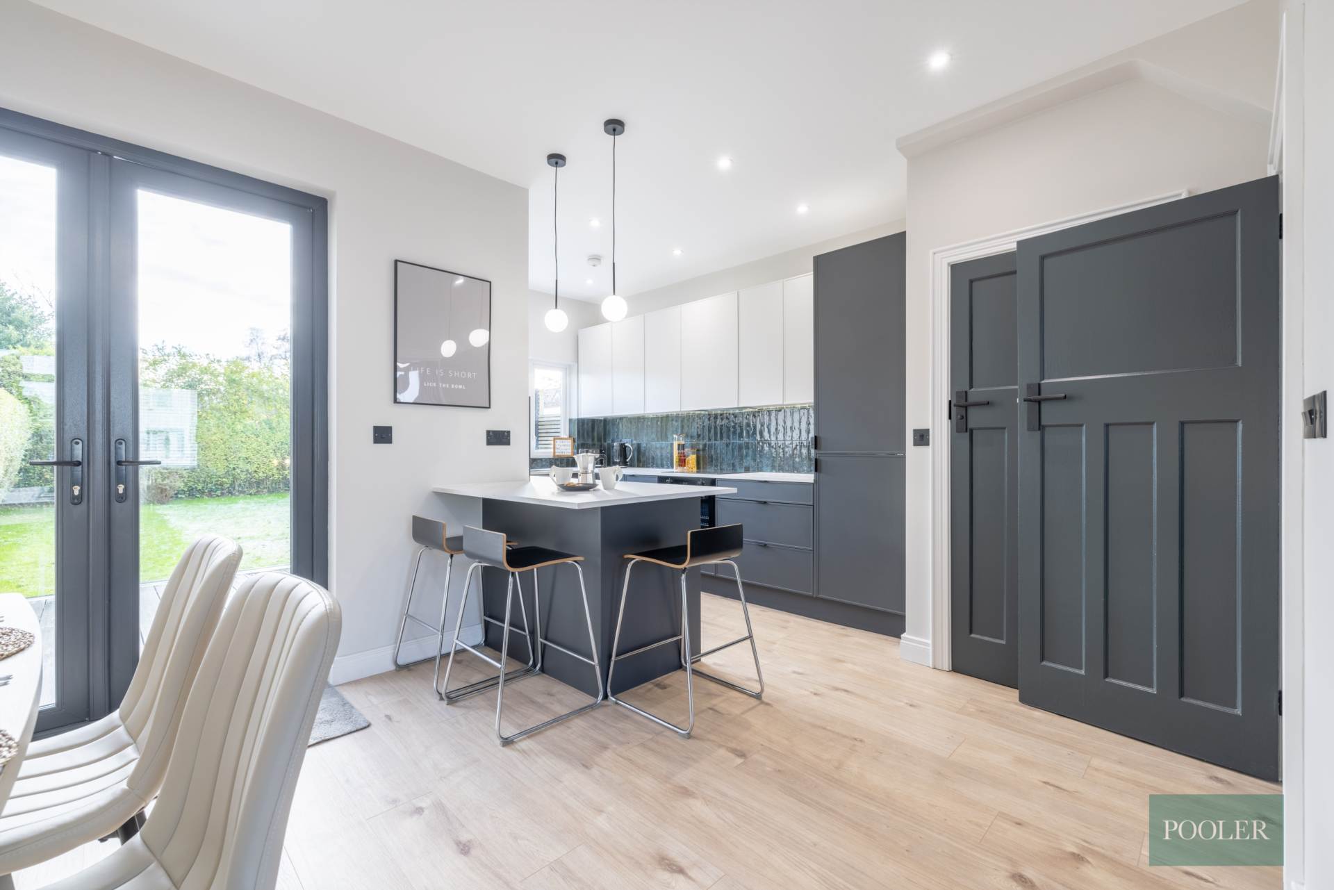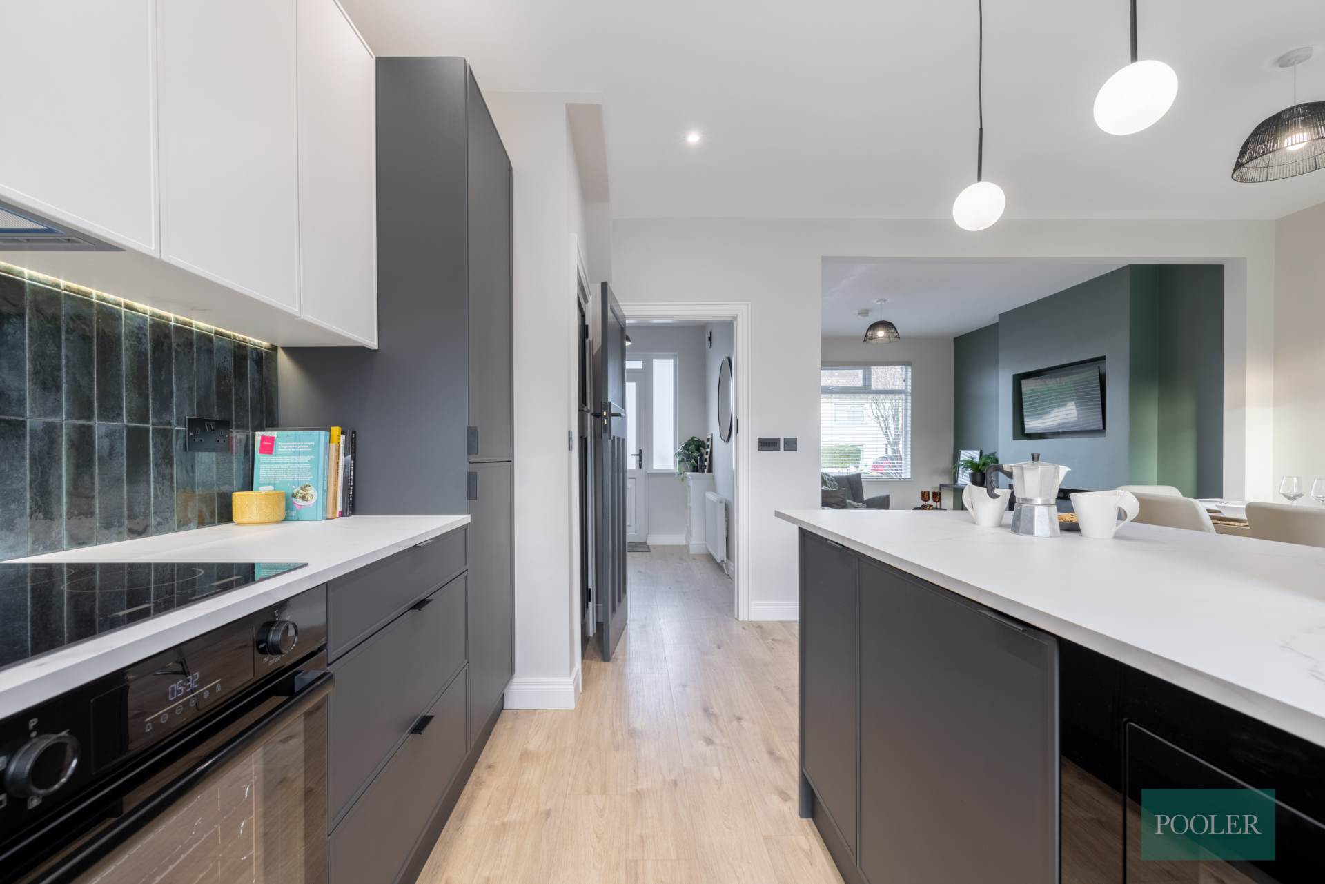 To the rear, the heart of the home is the open-plan kitchen/dining room, showcasing a contemporary two-tone kitchen with sleek cabinetry, modern appliances, and generous space for family dining or entertaining.